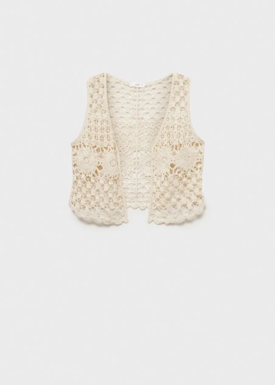 OpisSzydełkowy model. Model prosty. Deseń crop. Bez rękawów. Otwarty dekolt. Bez zapięcia.