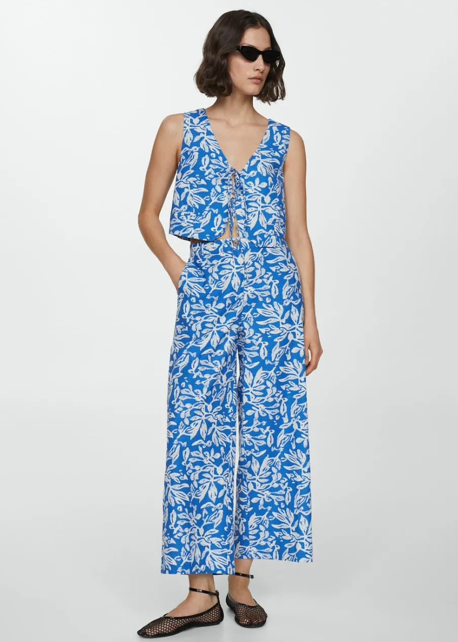 Deseń crop. Model prosty. Krótki krój. Dekolt V. Bez rękawów. Wiązanie z przodu. Total look. Tkanina z 100% bawełny. Nadruk.