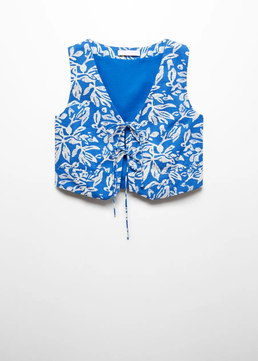 OpisDeseń crop. Model prosty. Krótki krój. Dekolt V. Bez rękawów. Wiązanie z przodu. Total look. Tkanina z 100% ba…