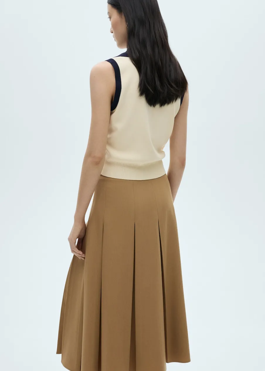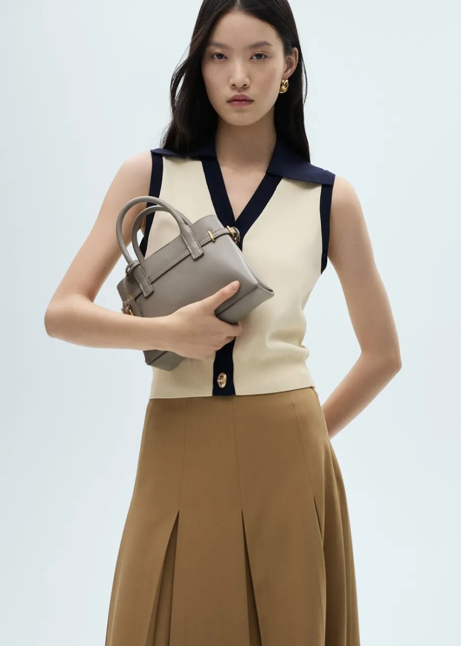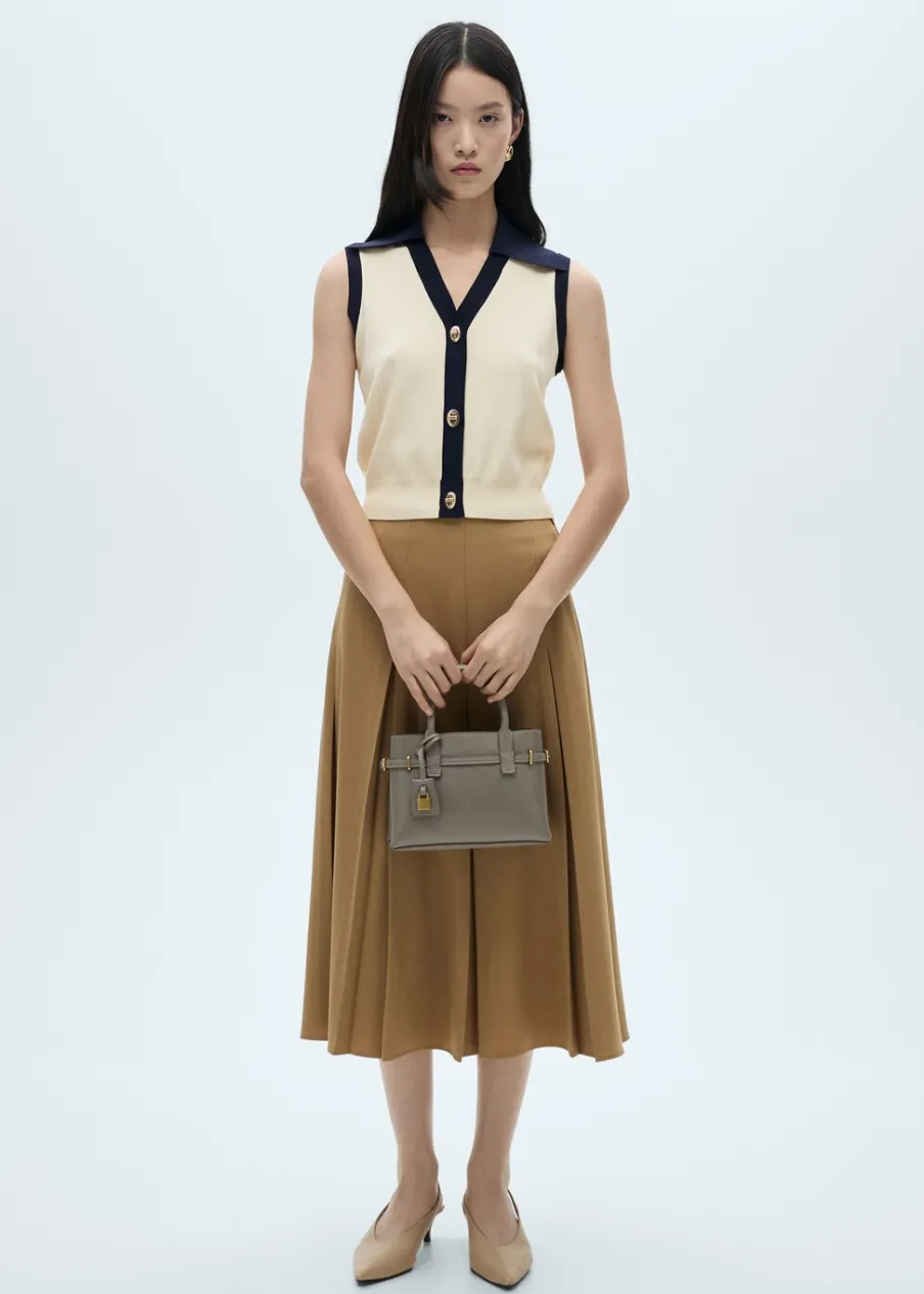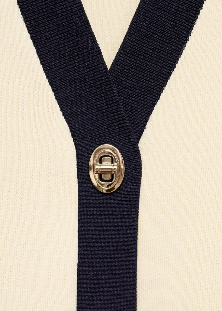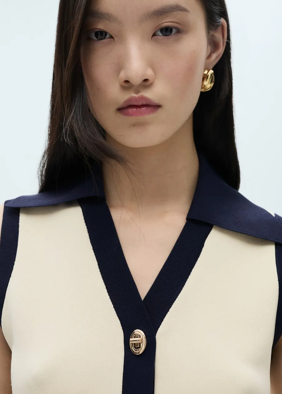 Tkanina z cienkiej dzianiny. Model prosty. Dekolt w szpic z kołnierzykiem. Bez rękawów. Zapięcie z przodu na guziki. Biżuteryjne guziki. Kontrastowe wykończenia.
