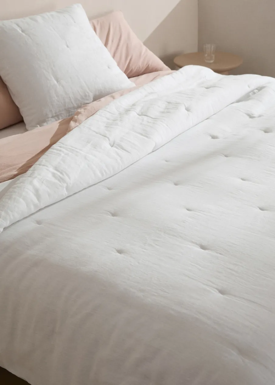 Wymiary: 230 x 250 cm. Łóżko 130/140/150 cm. 100% len. Len ma właściwości termoregulacyjne, jest przewiewny latem i izolujący zimą. Tkanina gładka. Model pikowany. Mały haft w kształcie litery X. Połącz tę narzutę z pasującą poszewką na poduszkę do kompletu.