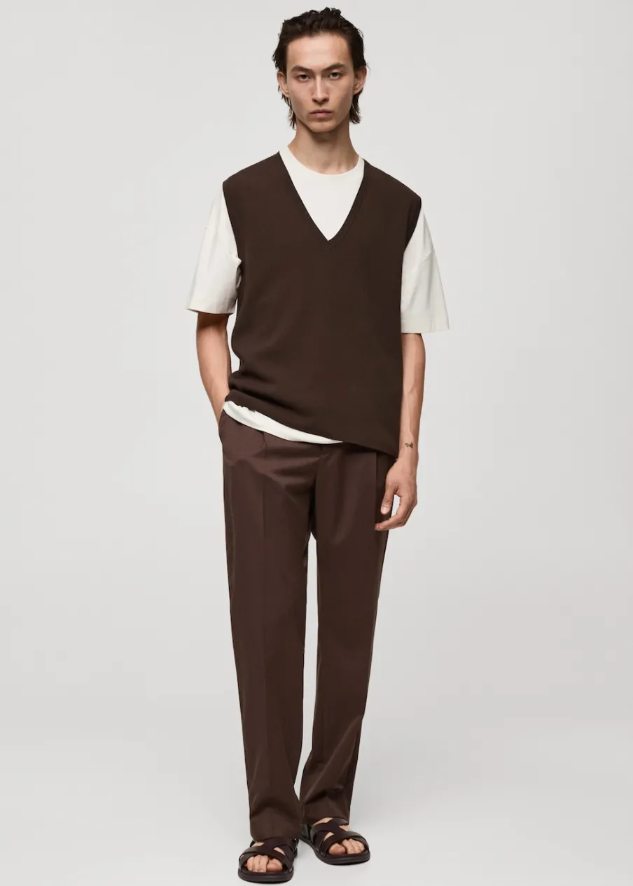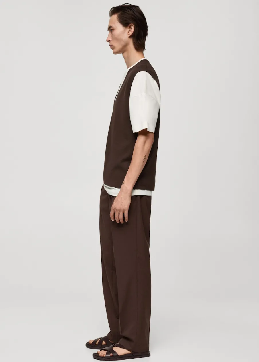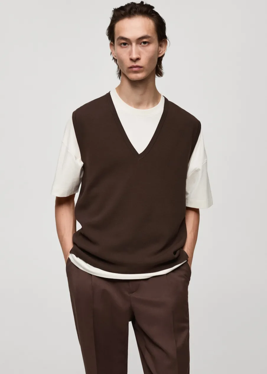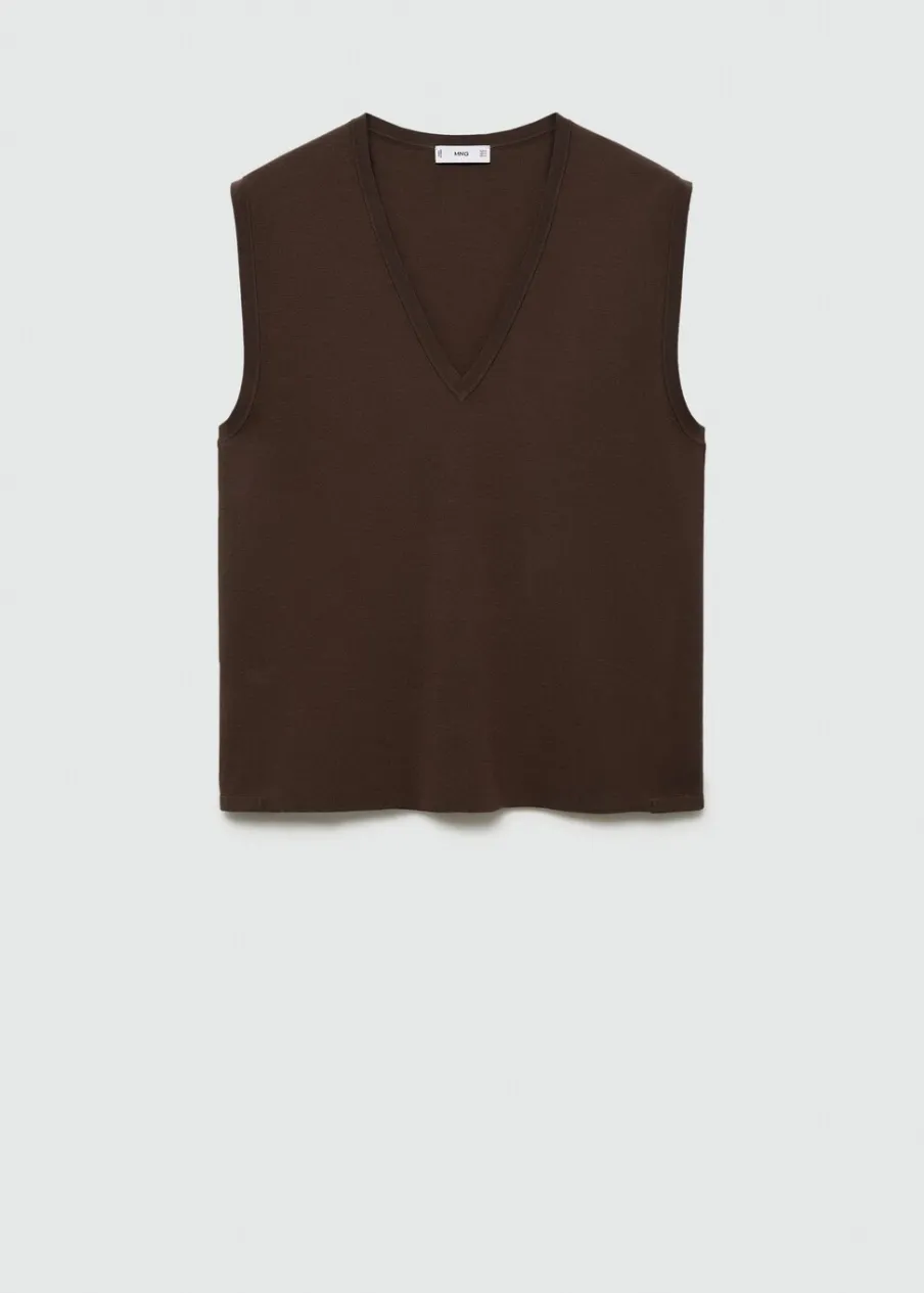 Tkanina z cienkiej dzianiny. Dekolt V. Bez rękawów. Prosty dół. Model ma 185 cm wzrostu i nosi rozmiar M.