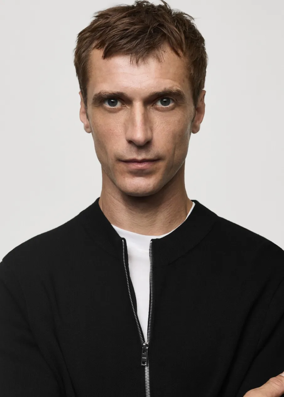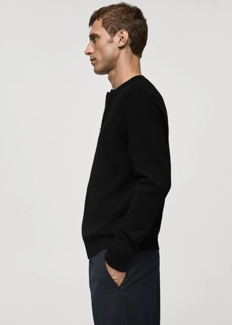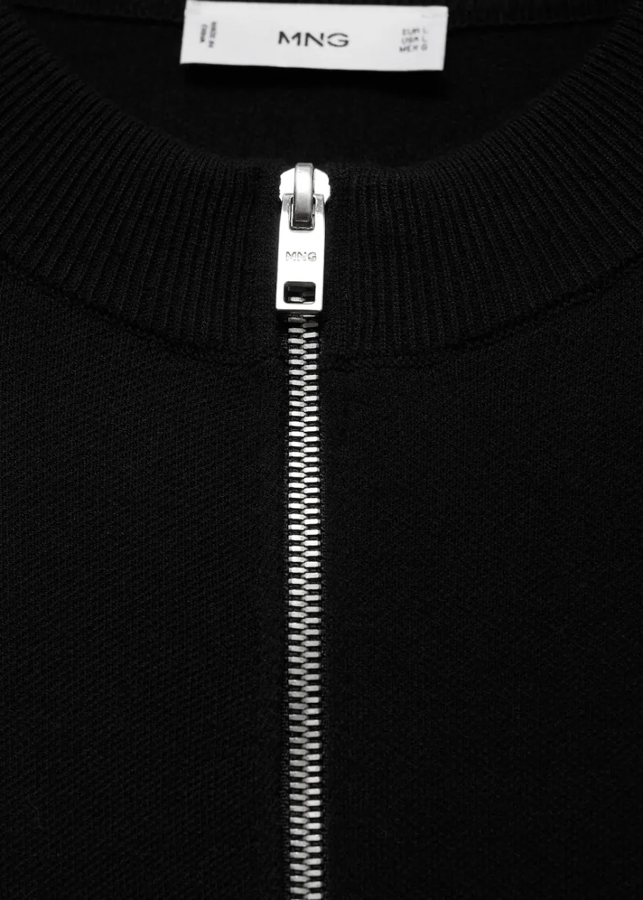 Model prosty. Okrągły dekolt z zapięciem na zamek. Długi rękaw. Prosty dół. Model ma 190 cm wzrostu i nosi rozmiar M. Dzianina o średniej grubości. Prążkowane wykończenie na dekolcie, rękawach i u dołu.