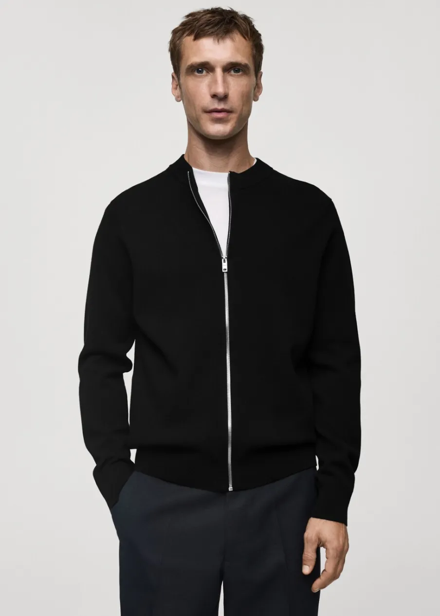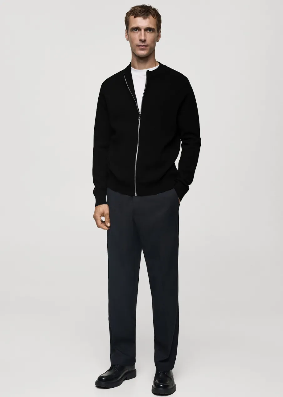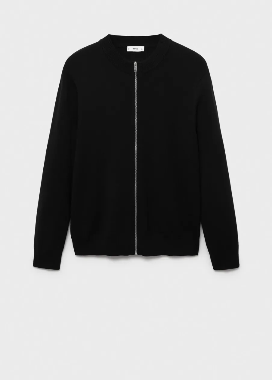 Model prosty. Okrągły dekolt z zapięciem na zamek. Długi rękaw. Prosty dół. Model ma 190 cm wzrostu i nosi rozmiar M. Dzianina o średniej grubości. Prążkowane wykończenie na dekolcie, rękawach i u dołu.