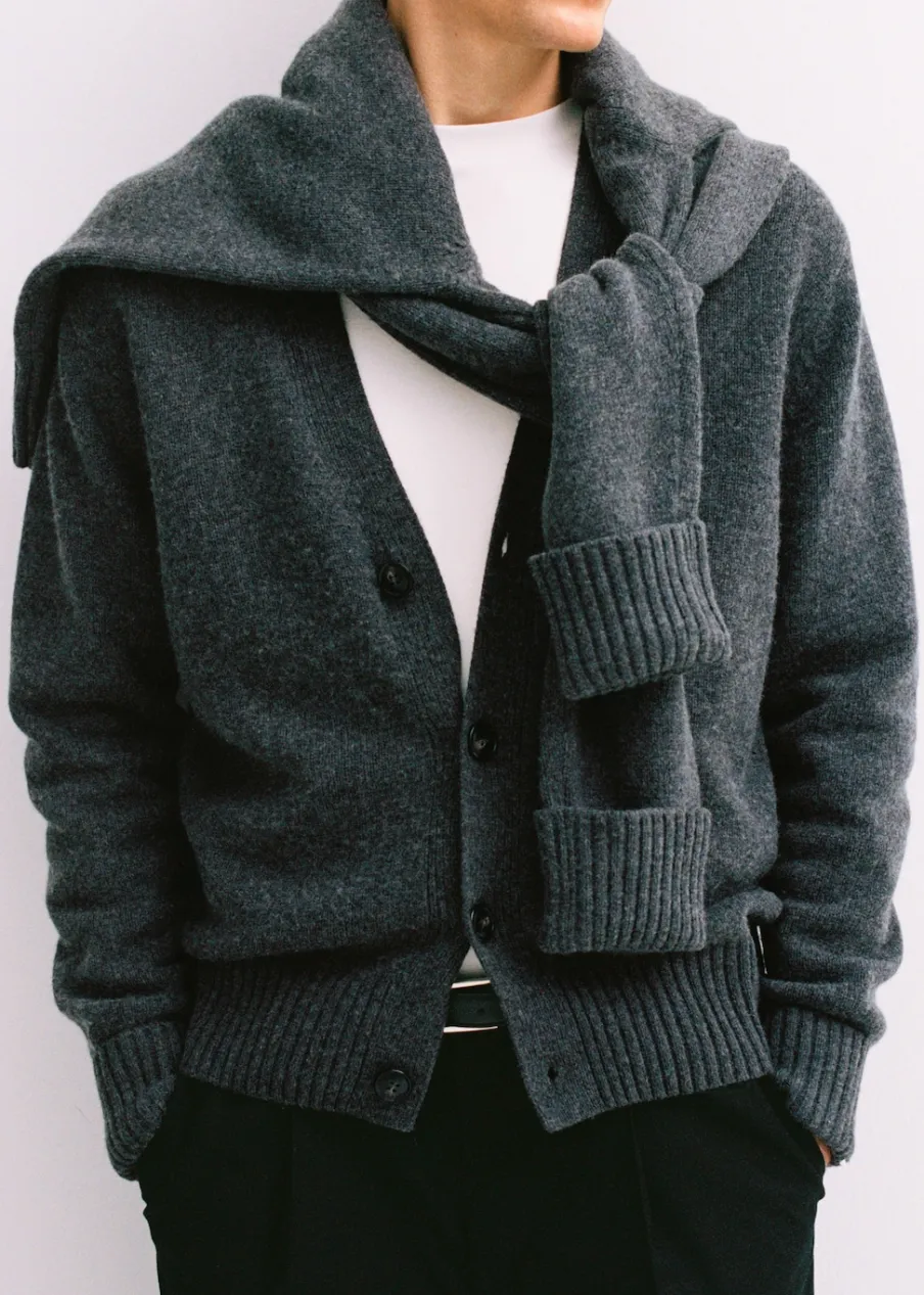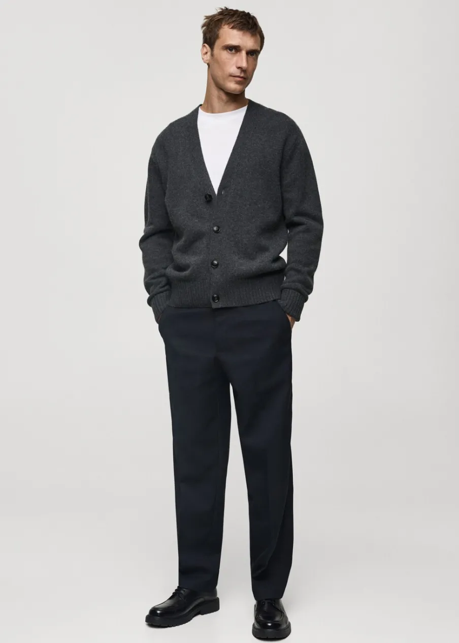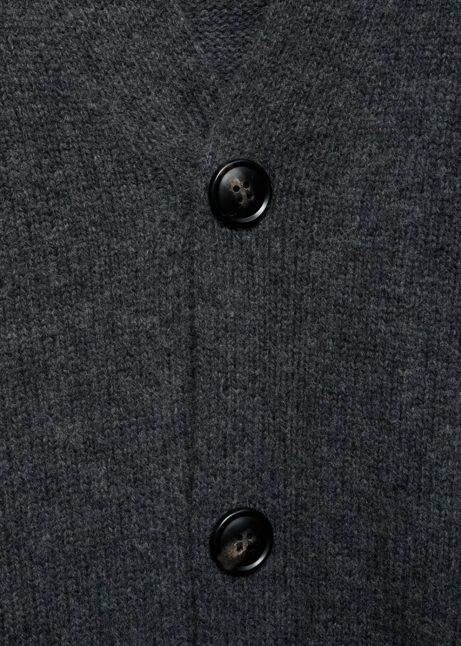 Wełniana tkanina. Dzianina średniej grubości. Materiały z recyklingu. Długi rękaw. Dekolt V. Zapięcie na guziki. Mankiety i dół wykończone ściągaczem. Model ma 185 cm wzrostu i nosi rozmiar M. Kampania z Antoinem Griezmannem.
