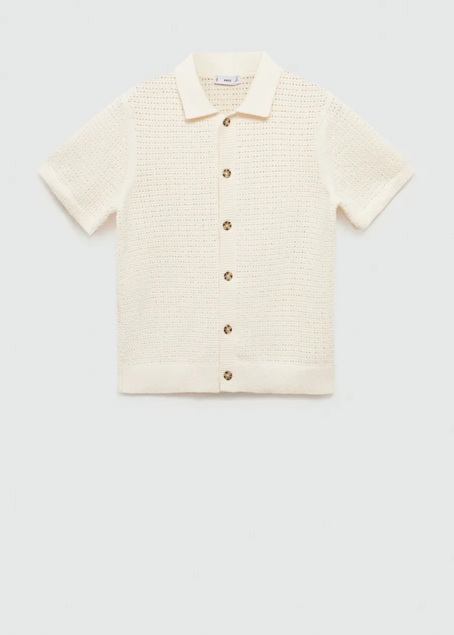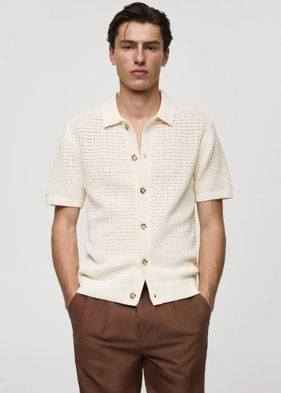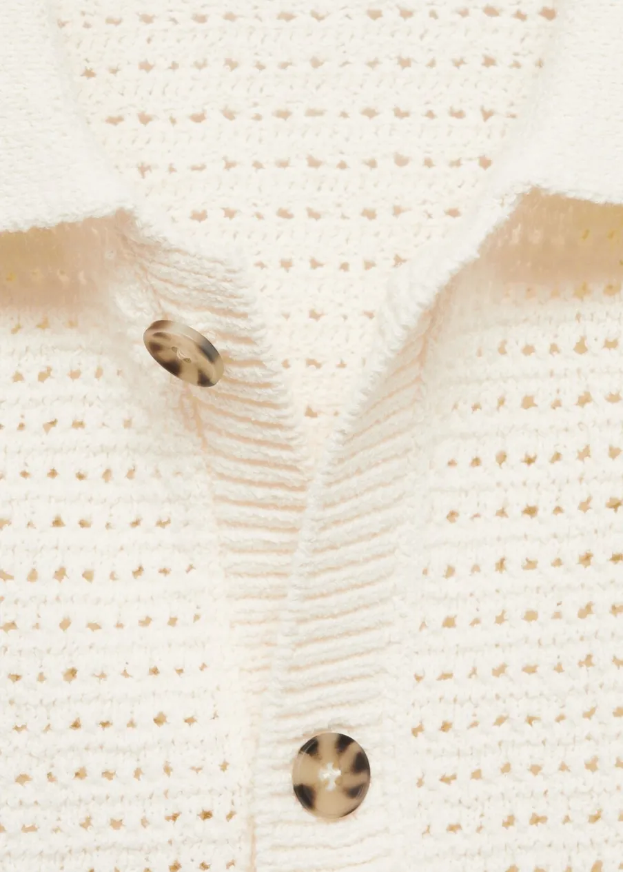 Tkanina mieszanka bawełny. Ażurowy model. Kontrastowy kołnierzyk polo. Prosty dół. Model ma 185 cm wzrostu i nosi rozmiar M. Szydełkowa tkanina. Zapięcie na guziki z przodu. Prążkowane wykończenie na dekolcie, rękawach i u dołu. Krótki rękaw z prążkowaniem.