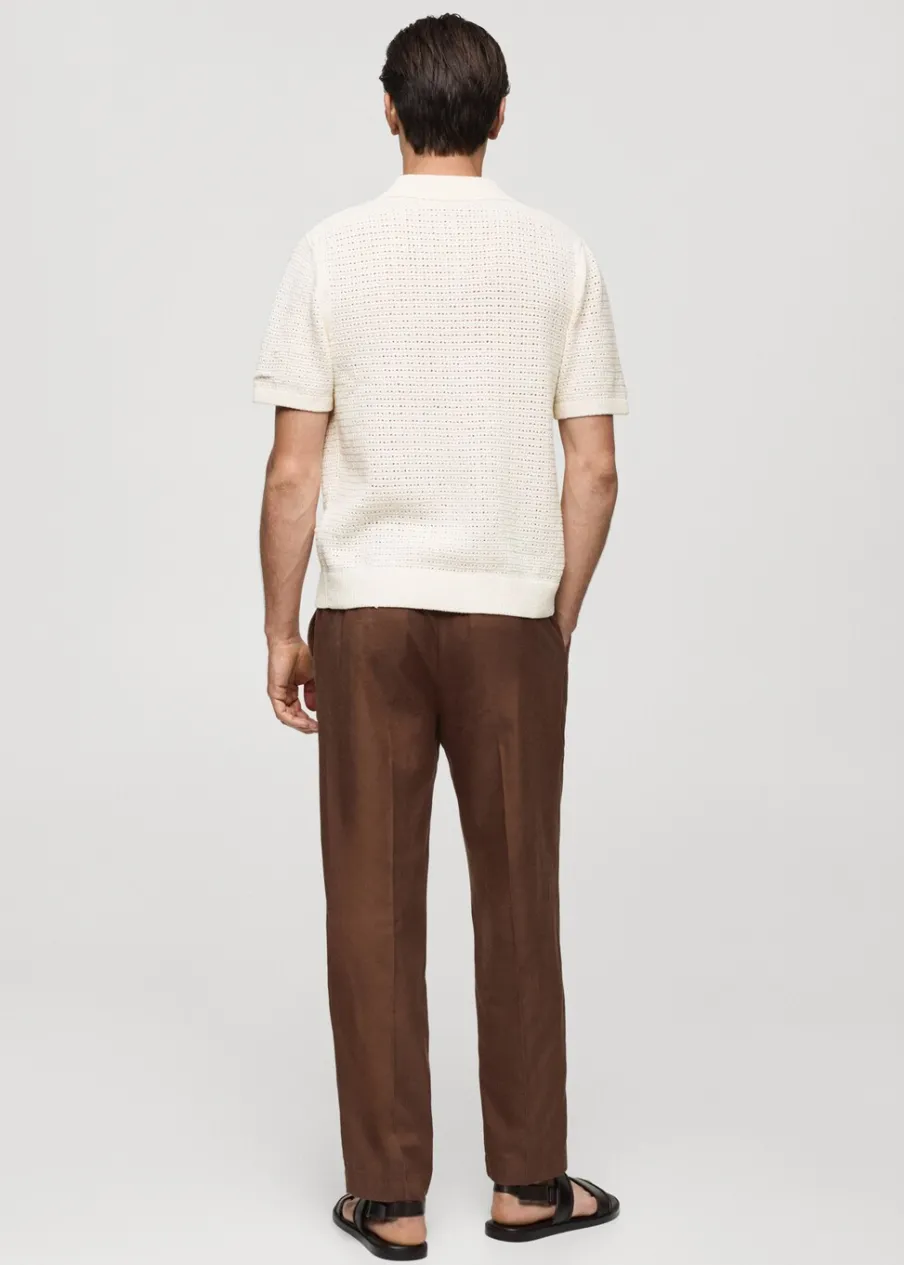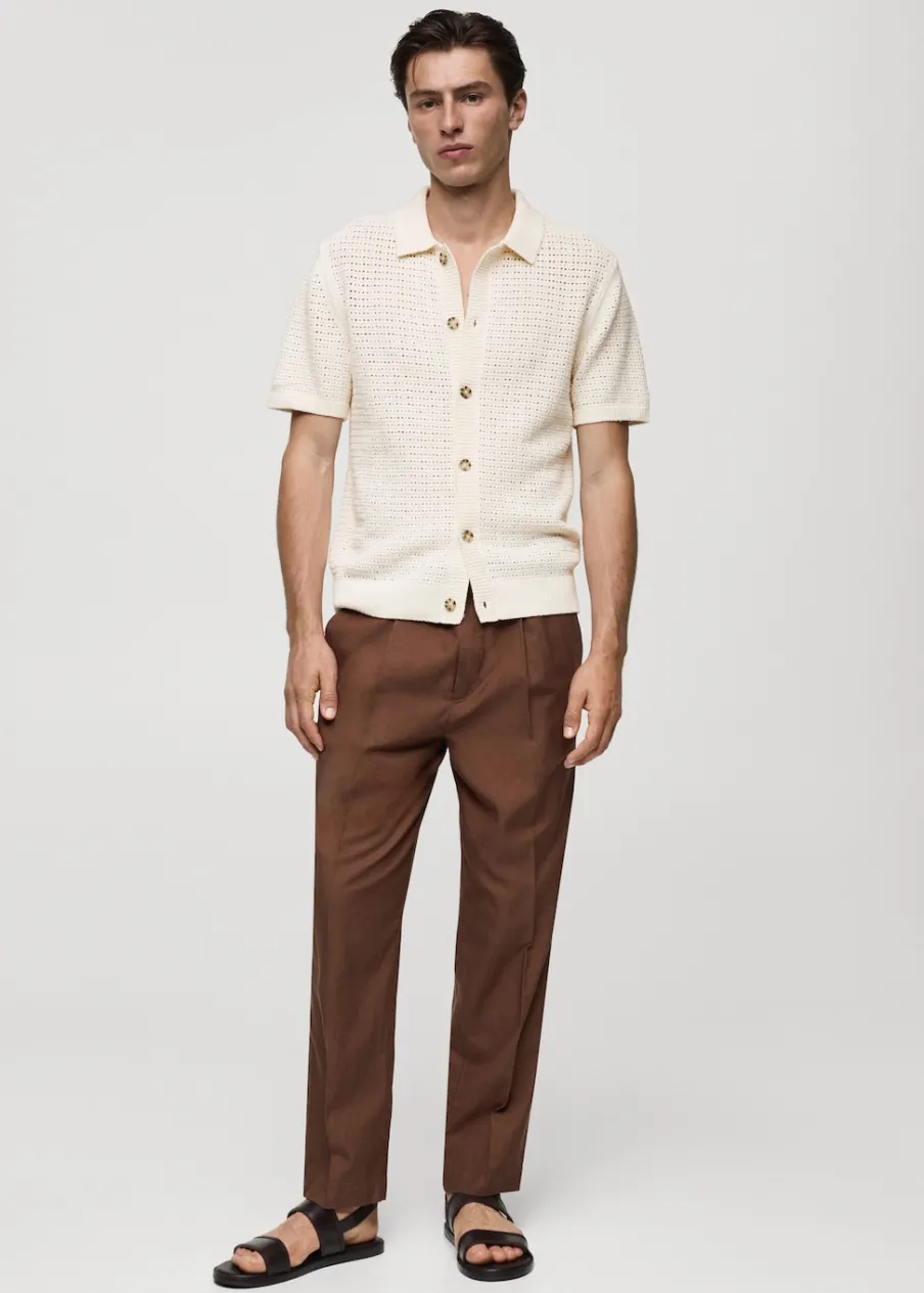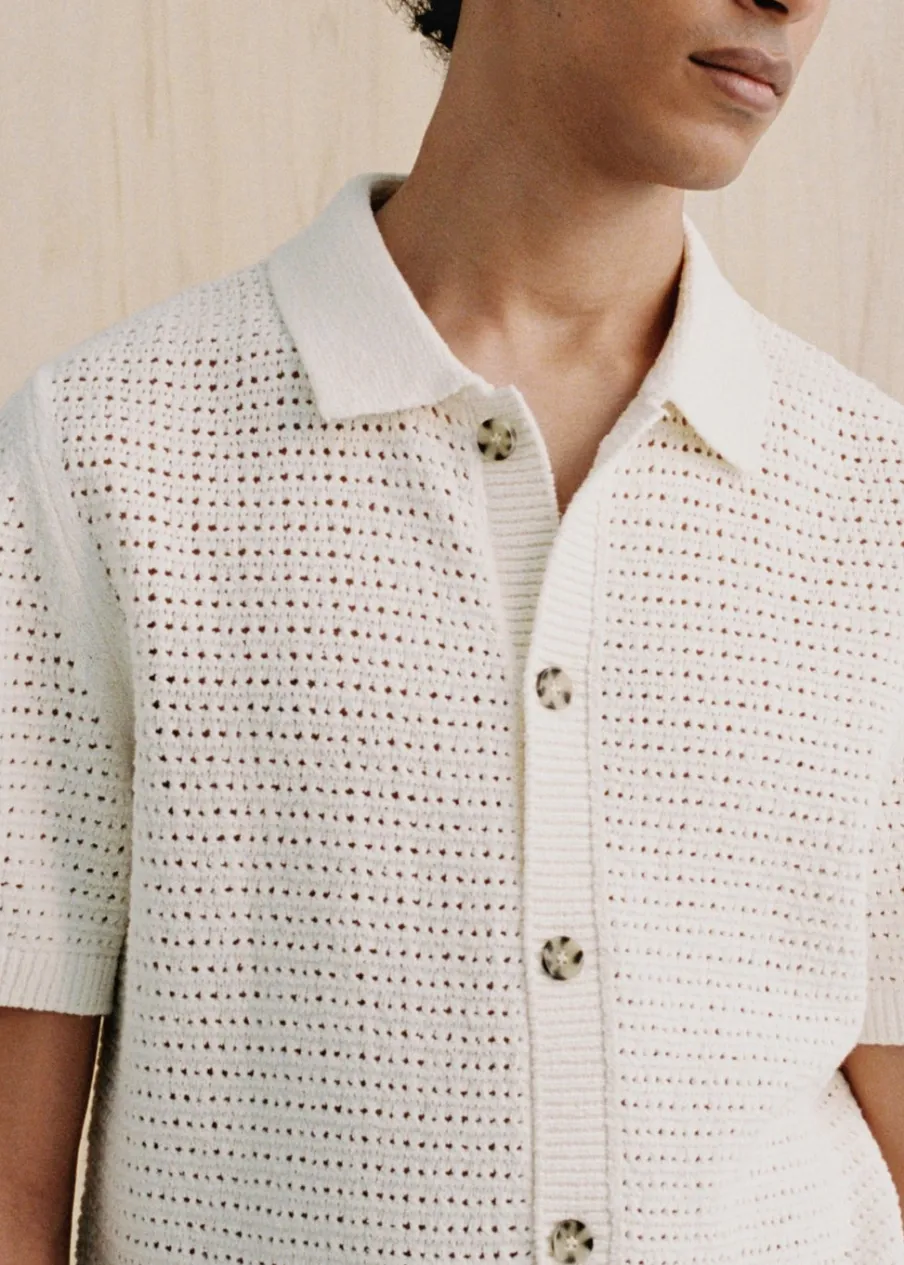 Tkanina mieszanka bawełny. Ażurowy model. Kontrastowy kołnierzyk polo. Prosty dół. Model ma 185 cm wzrostu i nosi rozmiar M. Szydełkowa tkanina. Zapięcie na guziki z przodu. Prążkowane wykończenie na dekolcie, rękawach i u dołu. Krótki rękaw z prążkowaniem.