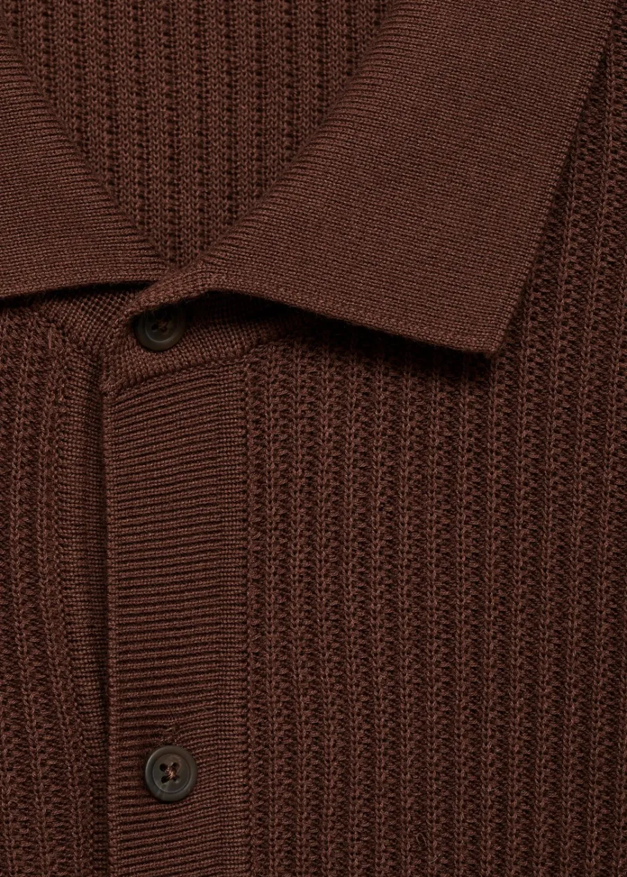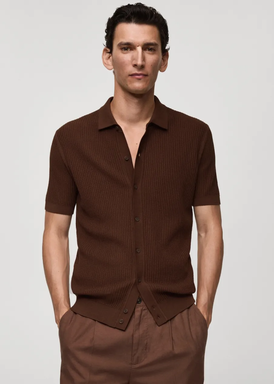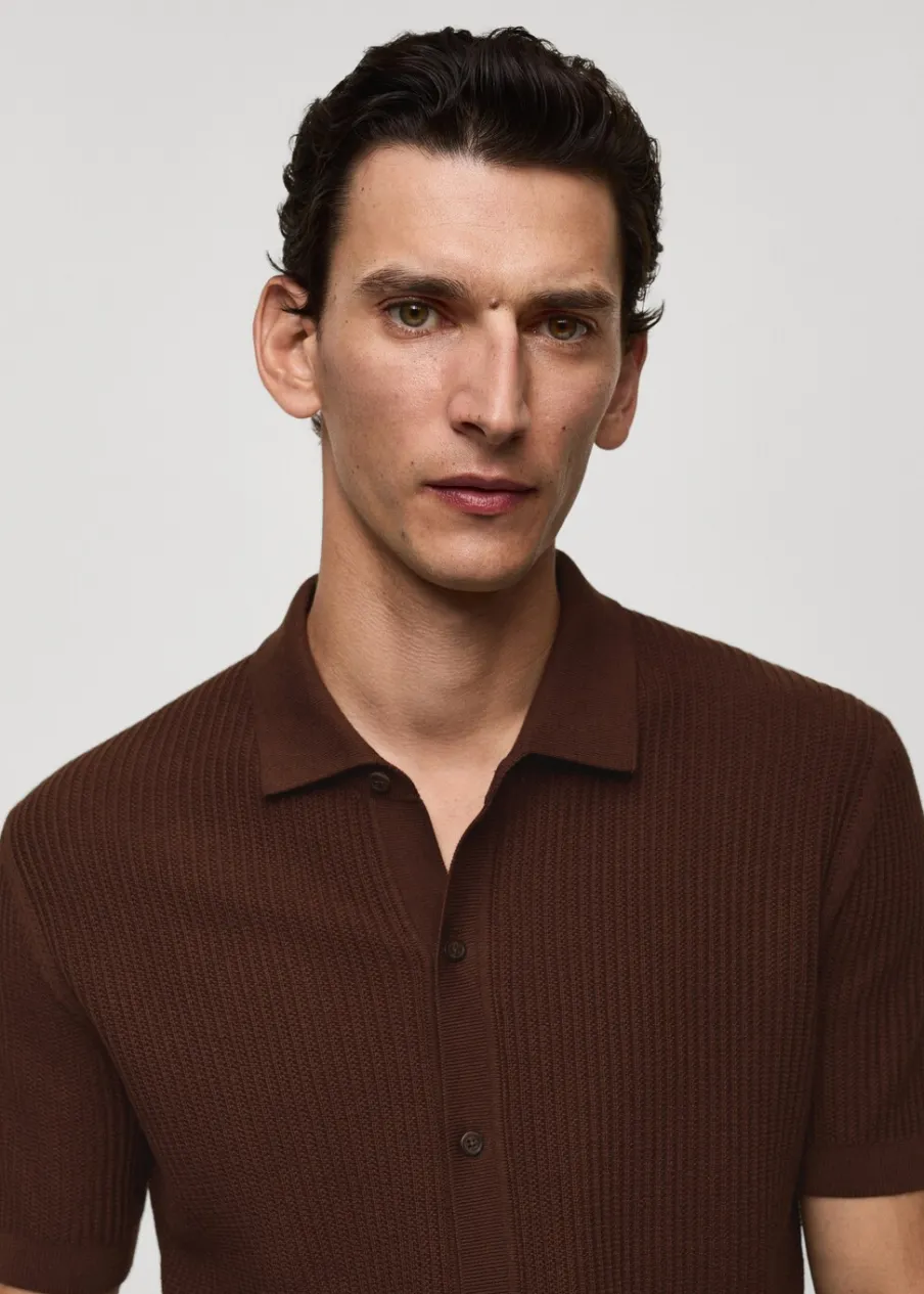 Tkanina z cienkiej dzianiny. Krój regular. Tekstura ze splotami tworzącymi prążki. Koszulowy kołnierz. Krótki rękaw. Prosty dół. Model ma 190 cm wzrostu i nosi rozmiar M. Zapięcie na guziki z przodu. Zapięcie z przodu. Model standardowy. Model prosty. Kołnierzyk polo. Tkanina z 100% bawełny.