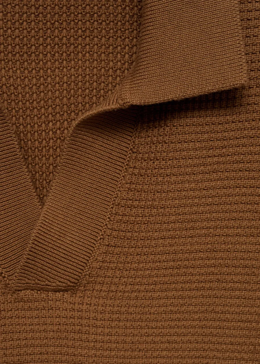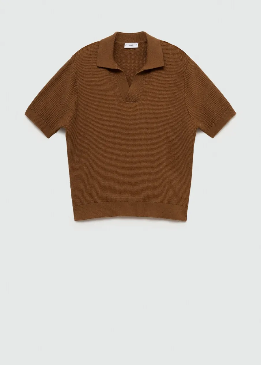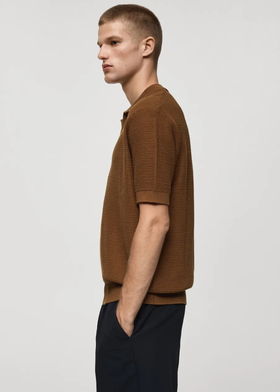 Model prosty. Wykończenie z mikroteksturą. Kołnierzyk polo z dekoltem w serek bez zapięcia. Krótki rękaw. Prosty dół. Model ma 190 cm wzrostu i nosi rozmiar M. Dzianina o średniej grubości. Prążkowane wykończenie na dekolcie, rękawach i u dołu. Tkanina z 100% bawełny.