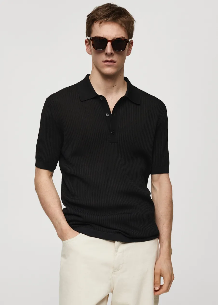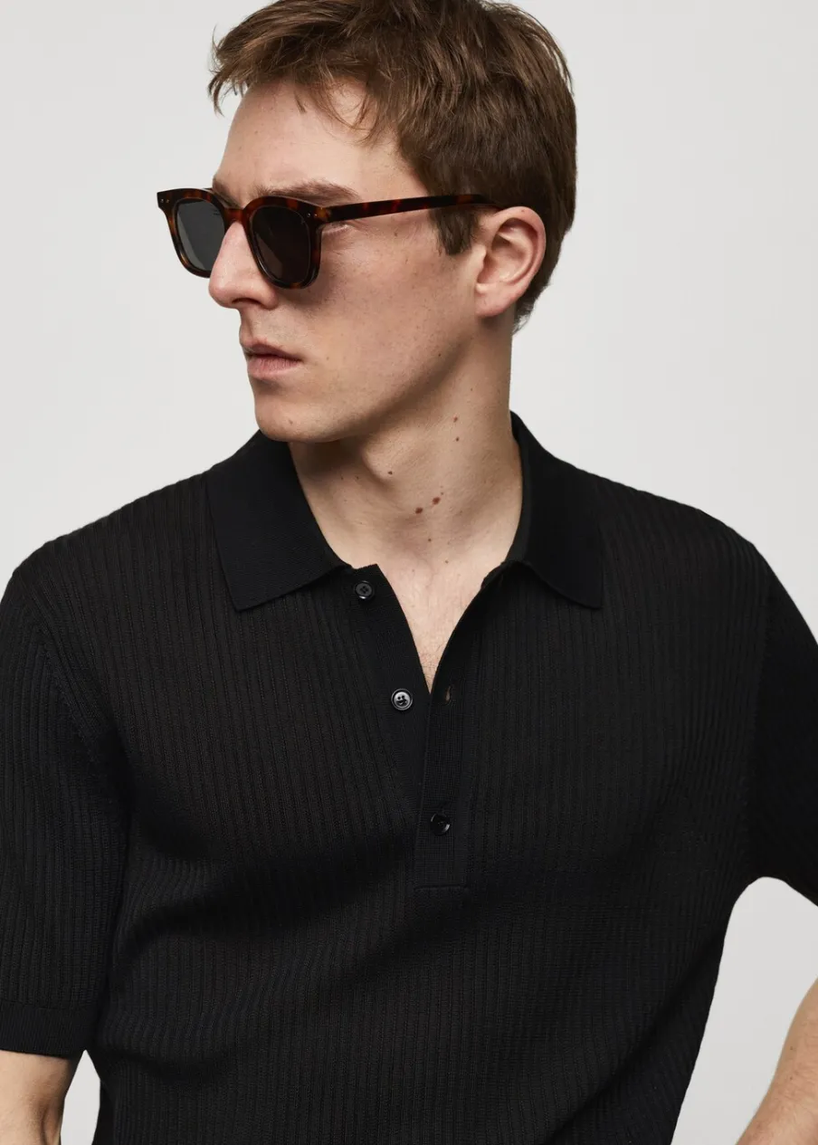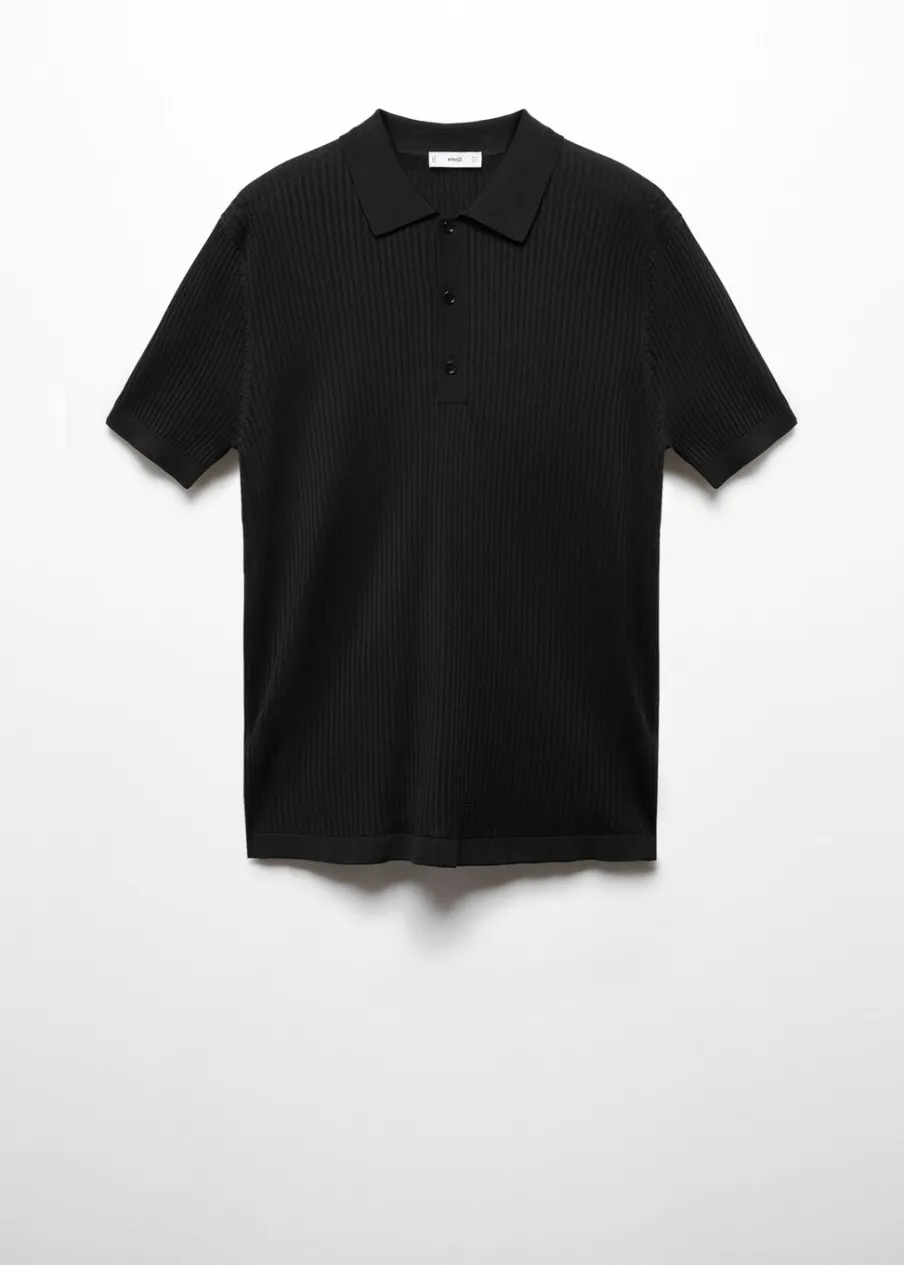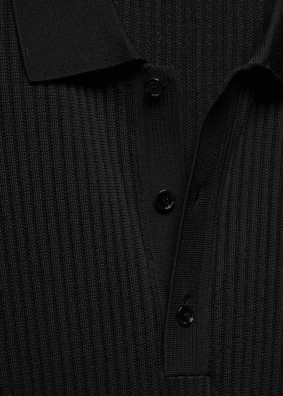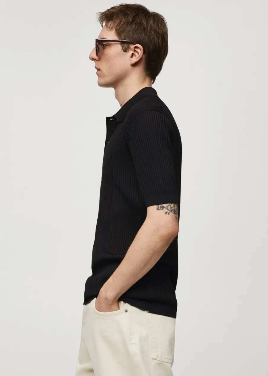 Tkanina mieszanka bawełny. Tkanina z cienkiej dzianiny. Kołnierzyk polo z zapięciem na guziki. Krótki rękaw. Prosty dół. Kontrastowe prążkowane wykończenie na dekolcie, rękawach i u dołu. Model ma 187 cm wzrostu i nosi rozmiar M.