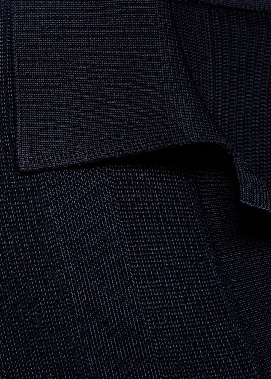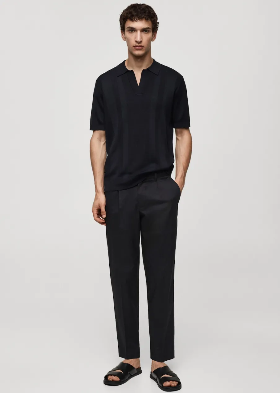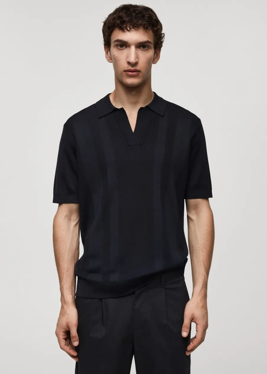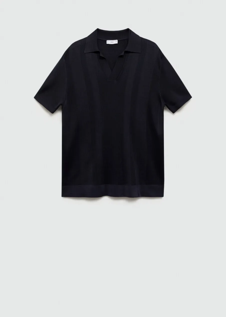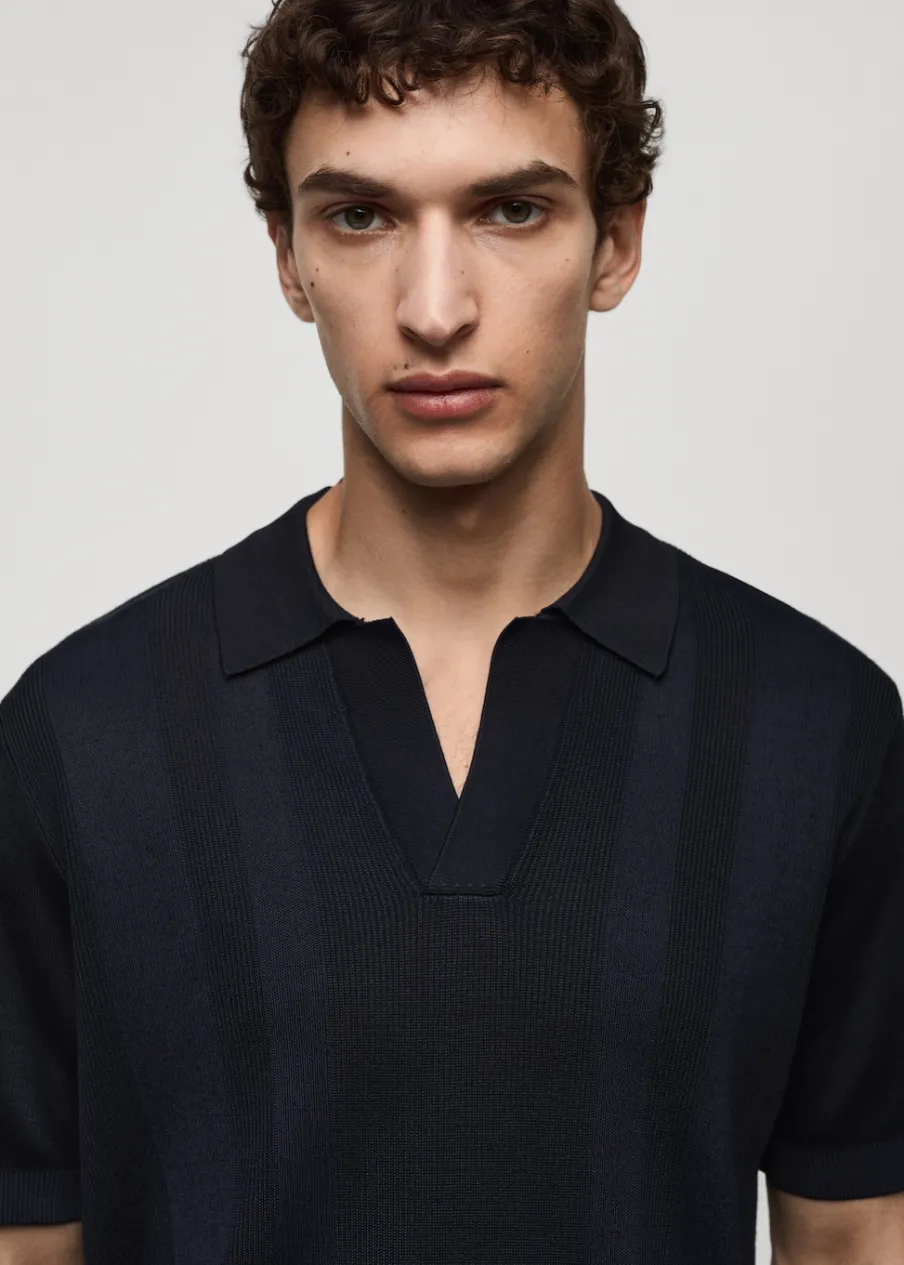 Kolor granatowy dostępny tylko online. Tkanina mieszanka bawełny. Ściągaczowa dzianina. Kołnierzyk polo z dekoltem w serek bez zapięcia. Krótki rękaw. Prosty dół. Kontrastowe prążkowane wykończenie na dekolcie, rękawach i u dołu. Model ma 187 cm wzrostu i nosi rozmiar L.