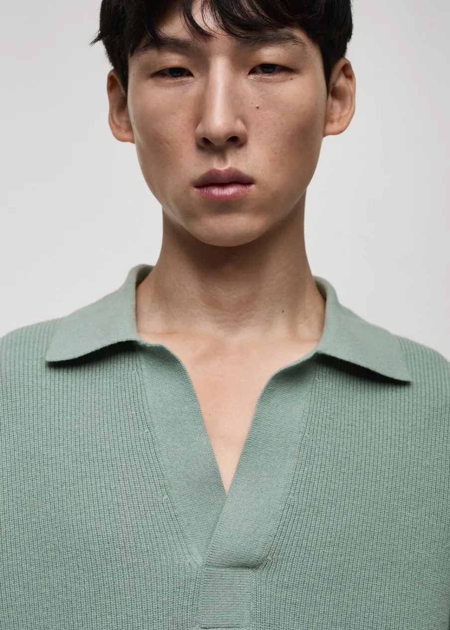 Kolor granatowy dostępny tylko online. Tkanina mieszanka wełny. Tkanina z cienkiej dzianiny. Kołnierzyk polo. Ściągaczowe wykończenia. Model ma 185 cm wzrostu i nosi rozmiar M.