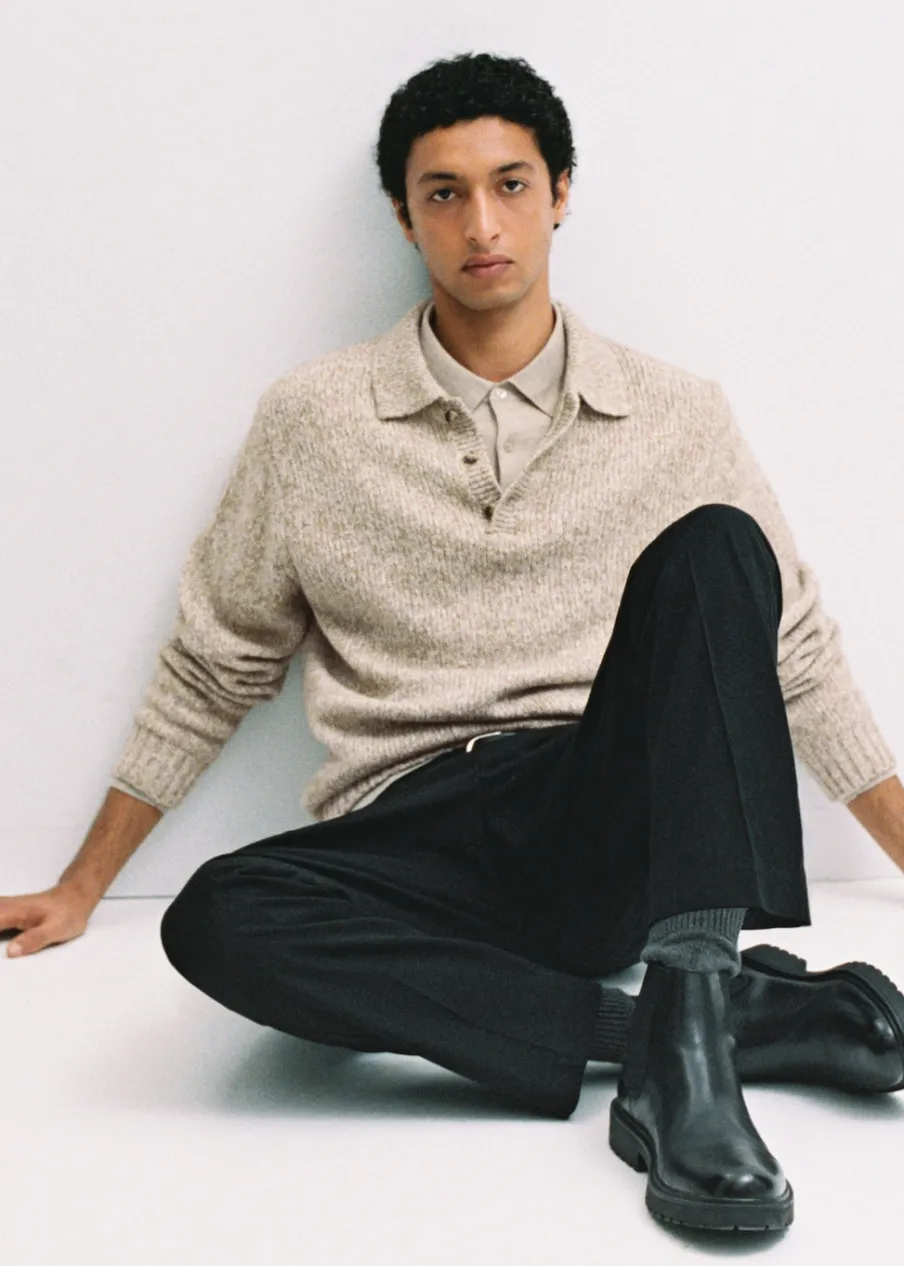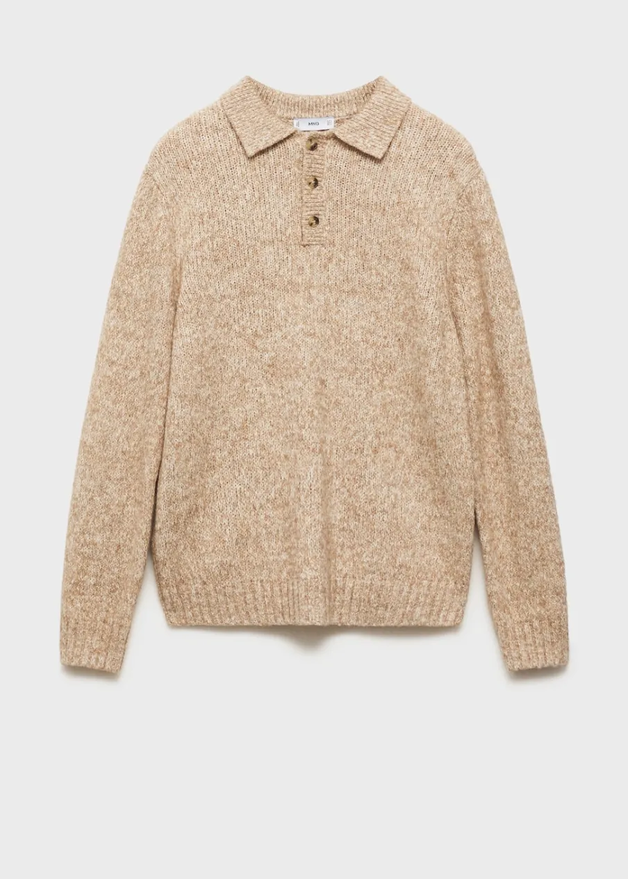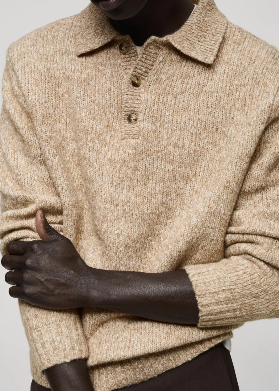 OpisTkanina z wełną. Deseń melanżowy. Kołnierzyk polo z zapięciem na guziki. Model prosty. Klasyczny kołnierzyk. …