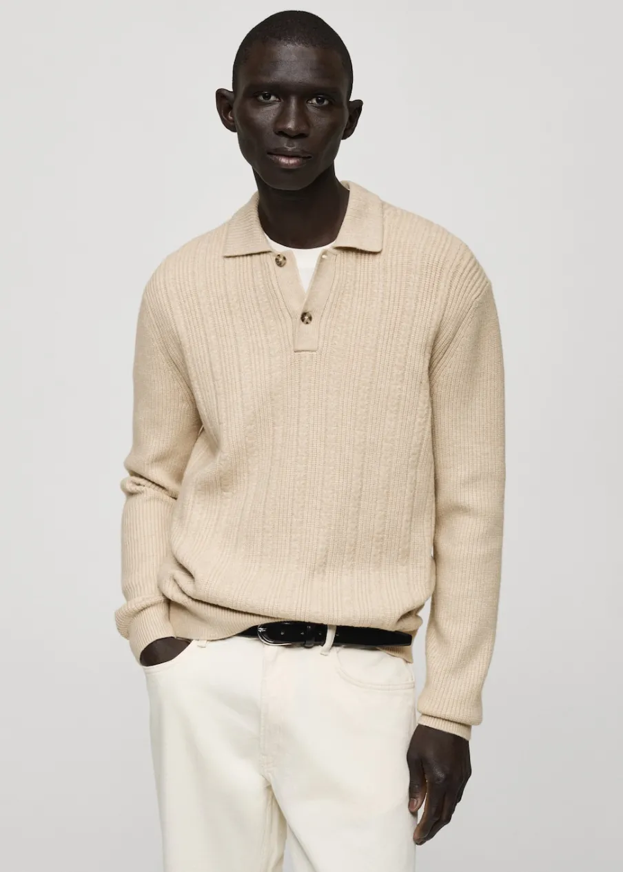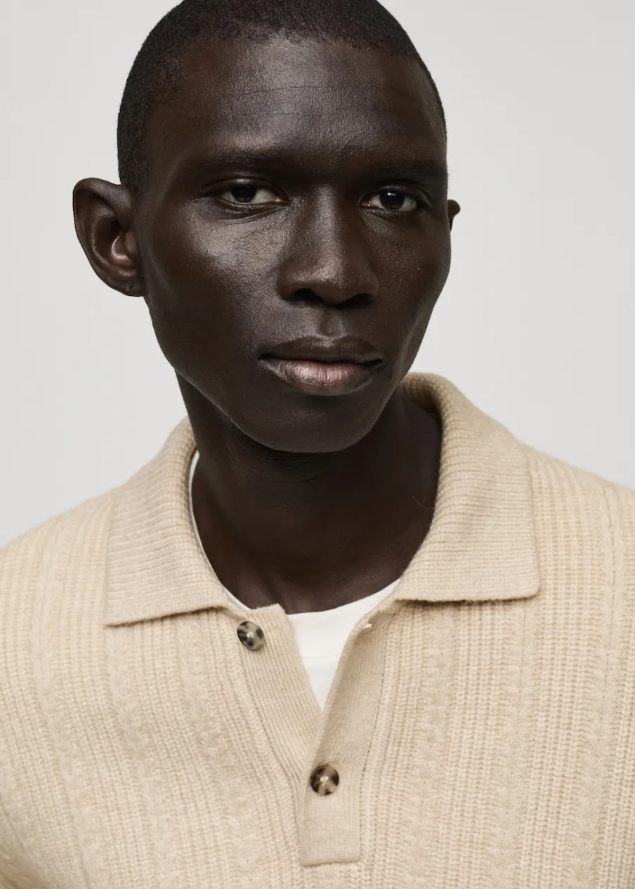 Krój regular. Dzianina. Strukturalna tkanina. Kołnierzyk polo z zapięciem na guziki. Ściągaczowe wykończenia. Model ma 185 cm wzrostu i nosi rozmiar M.