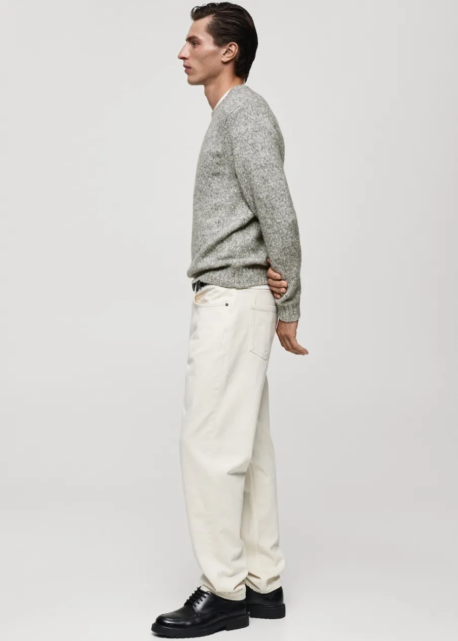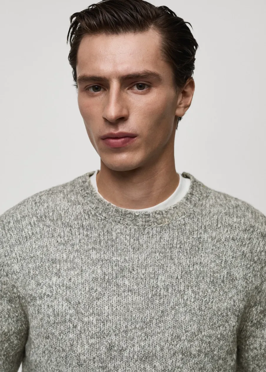 Okrągły dekolt. Tkanina z grubej dzianiny. Tkanina z mieszanki bawełny i wełny. Deseń melanżowy. Model ma 185 cm wzrostu i nosi rozmiar M.