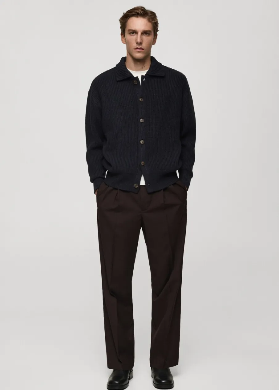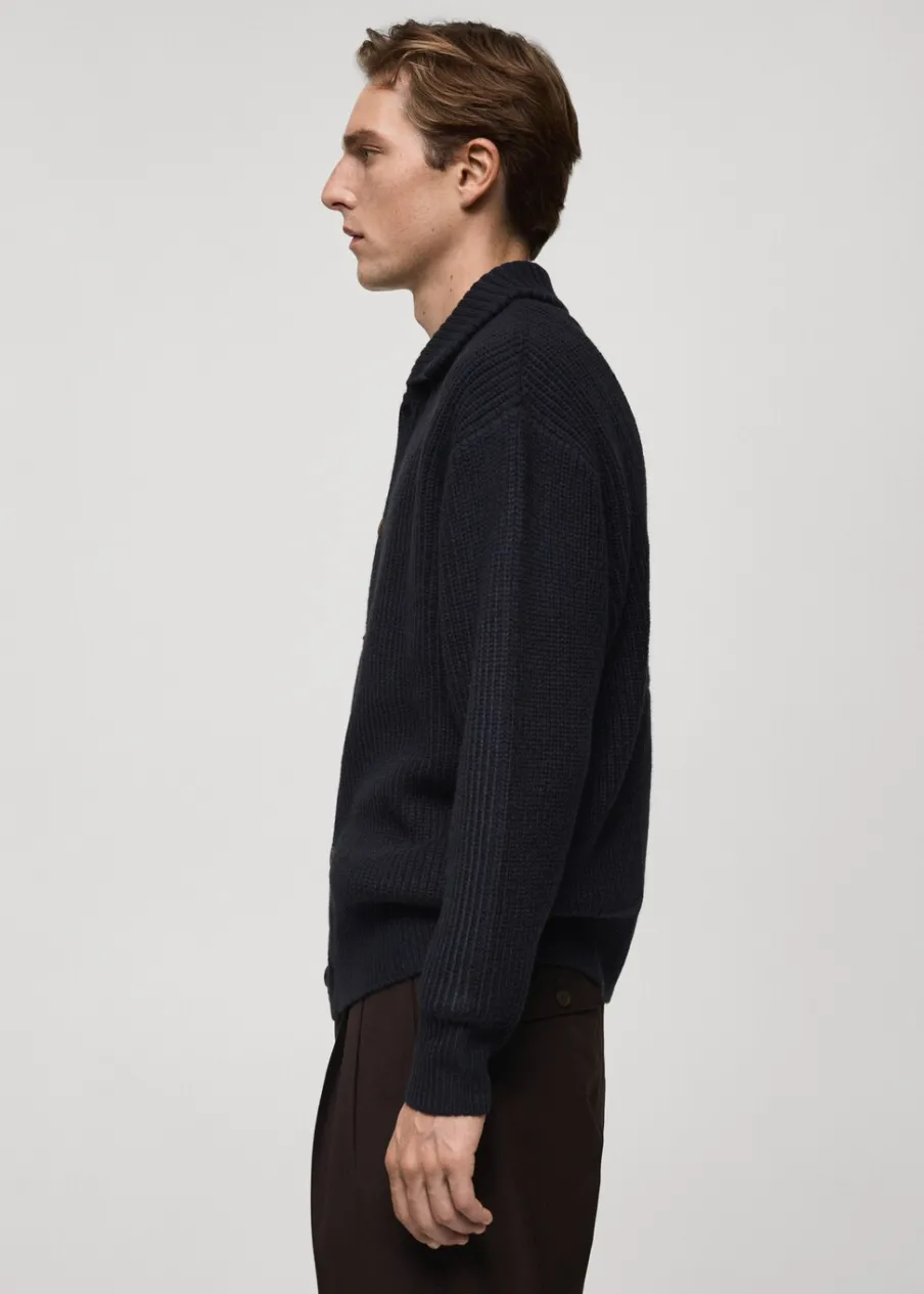 Relaxed fit. Tkanina mieszanka wełny. Tkanina ze ściągaczowej dzianiny. Koszulowy kołnierz. Zapięcie na guziki. Prążkowane wykończenie na dekolcie, rękawach i u dołu. Model ma 185 cm wzrostu i nosi rozmiar M.