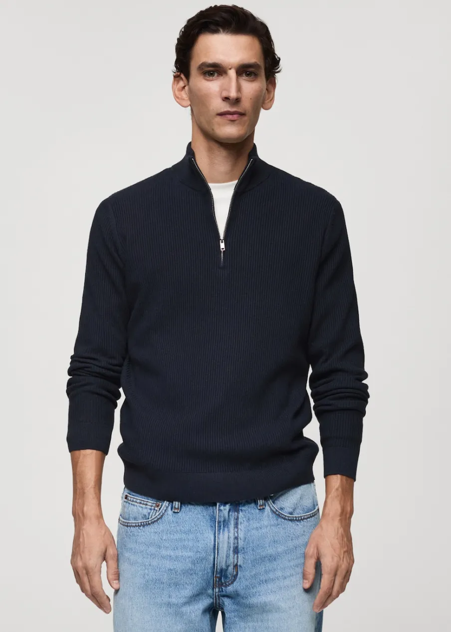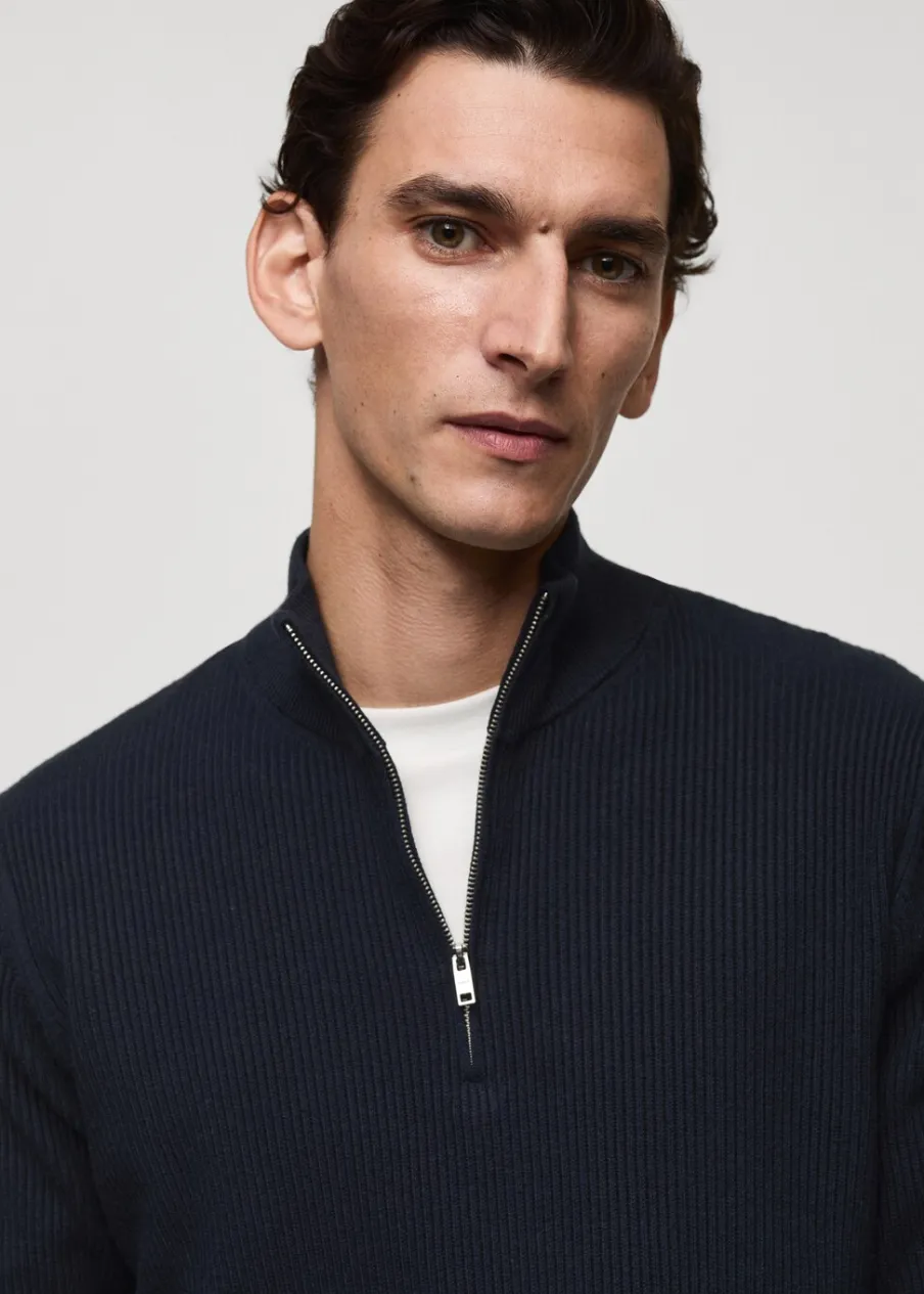 Kolor czekoladowo-brązowy dostępny tylko online. Krój regular. Tkanina mieszanka bawełny. Tkanina z cienkiej dzianiny. Ściągaczowa tkanina. Półgolf z zapięciem na zamek. Model ma 185 cm wzrostu i nosi rozmiar M.
