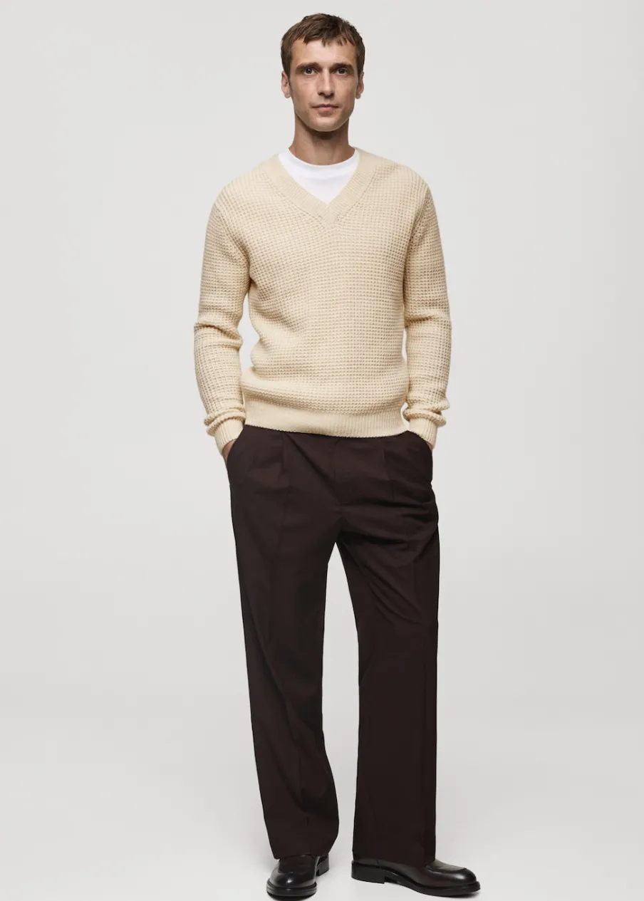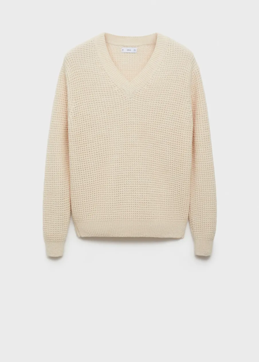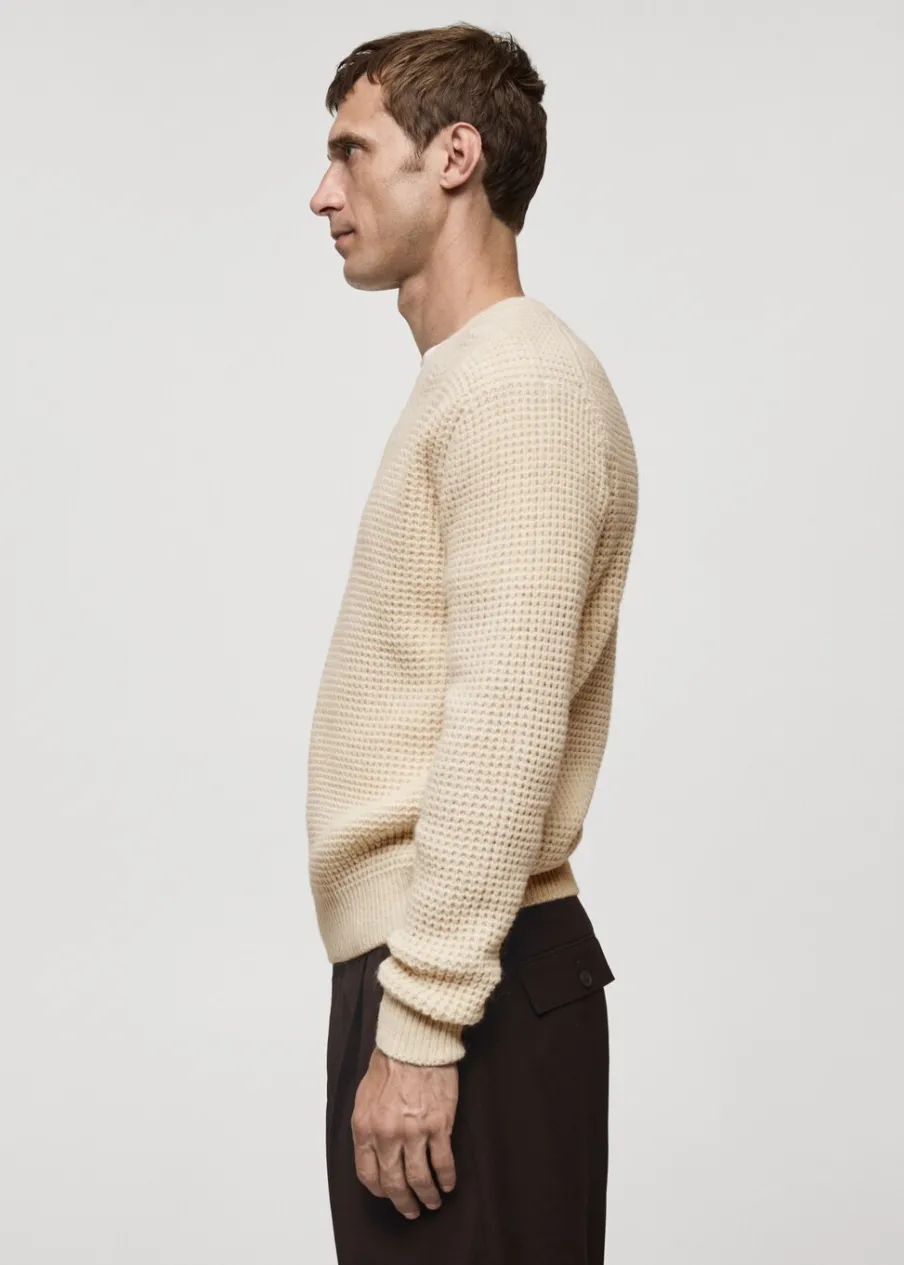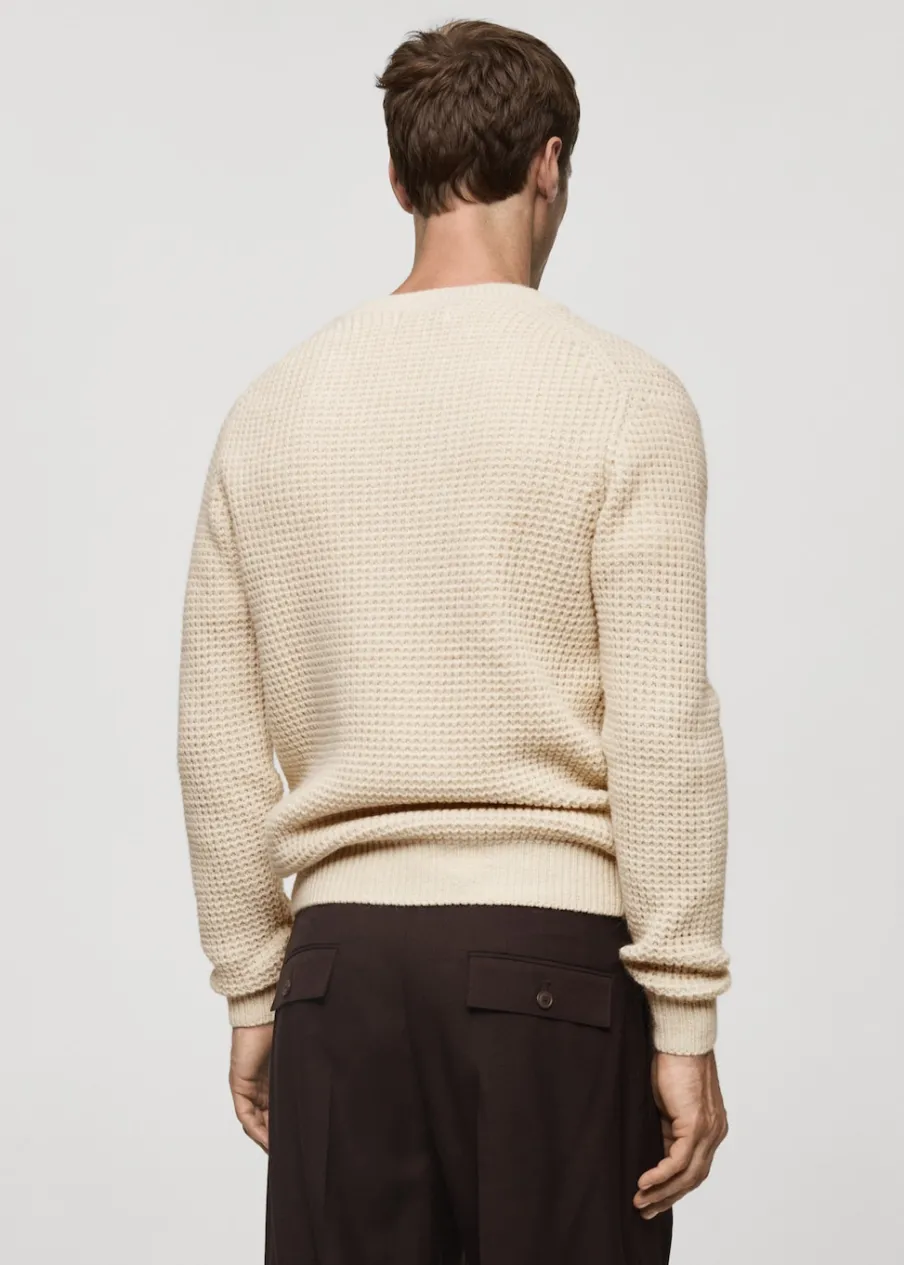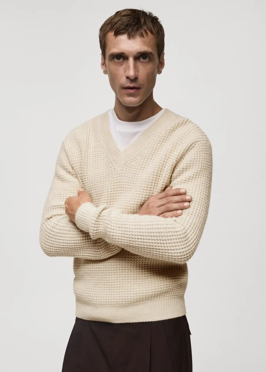 Model standardowy. Tkanina z grubej dzianiny. Dzianina z teksturą w kratę. Dekolt V. Krój regular. Długi rękaw z elastycznymi mankietami. Prosty dół. Prążkowane wykończenie na dekolcie, rękawach i u dołu. Model ma 190 cm wzrostu i nosi rozmiar M. Długi rękaw. Mieszanka wełny organicznej i alpaki.