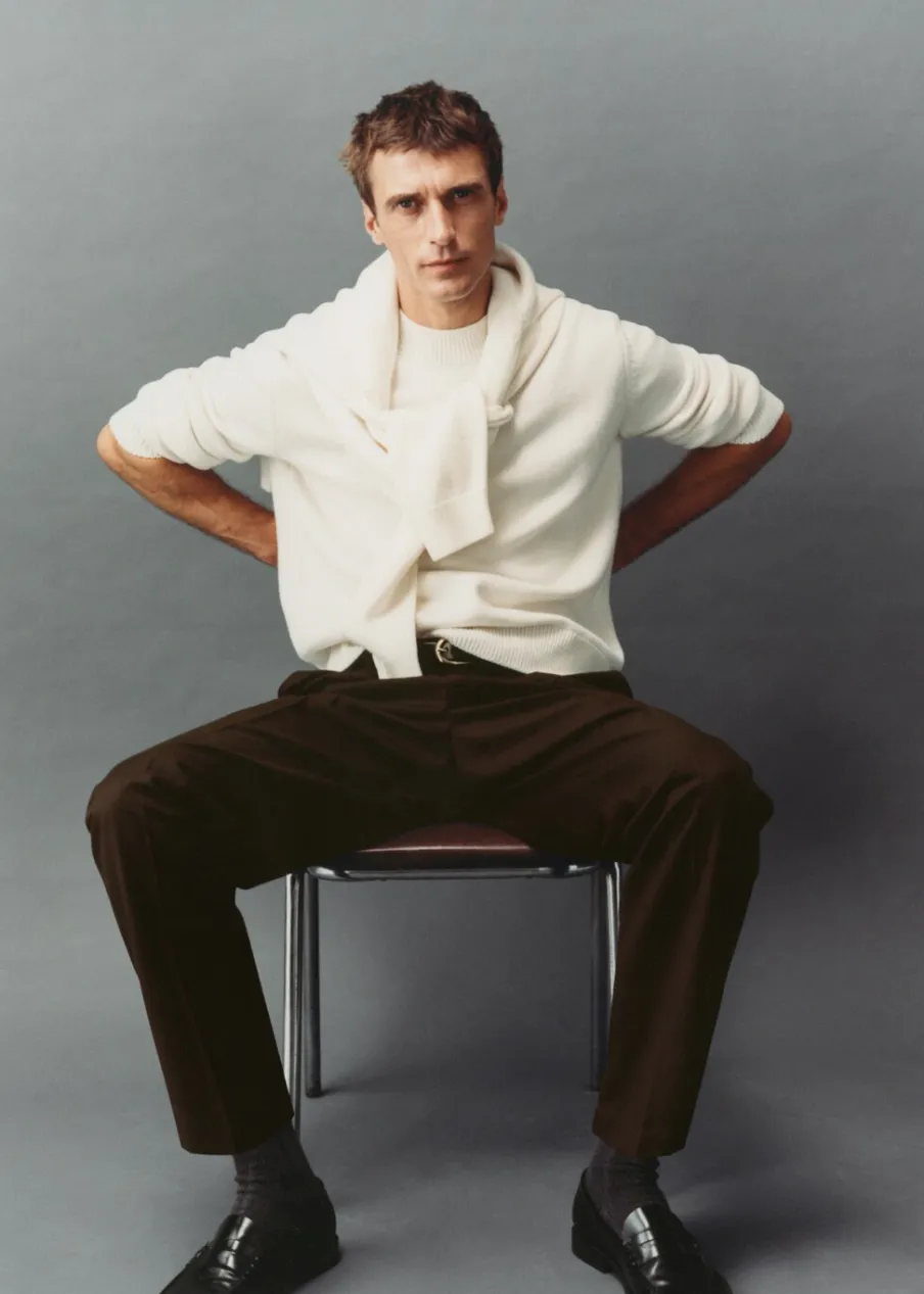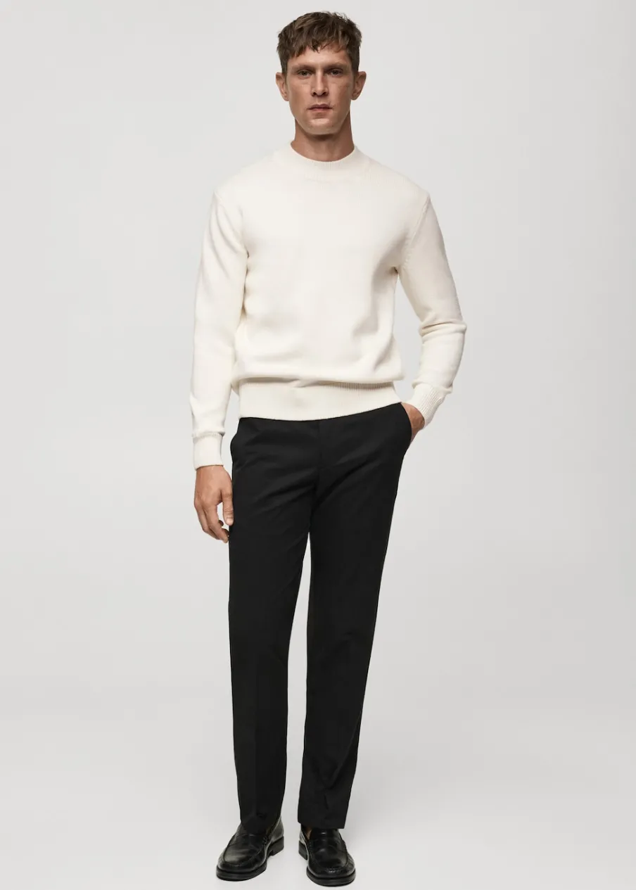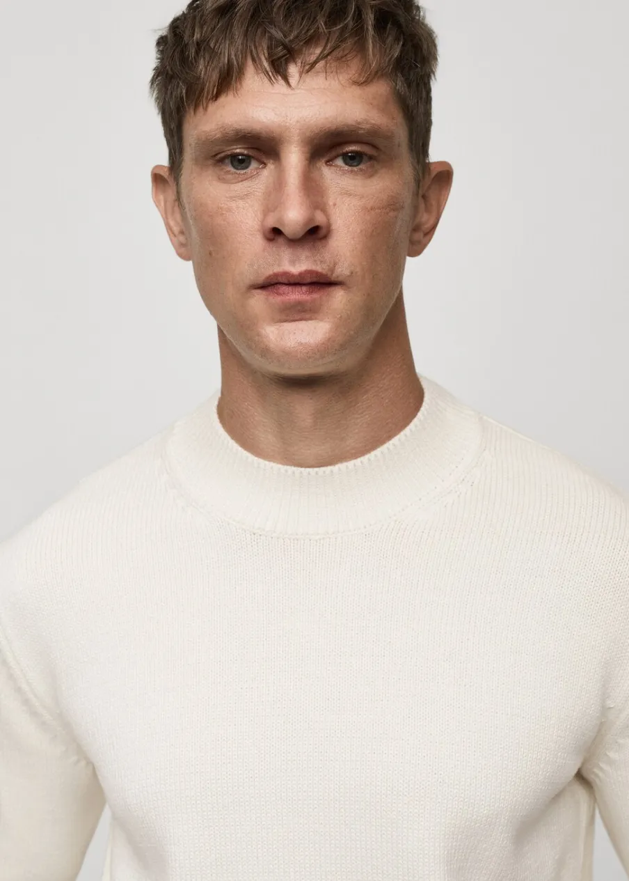 Krój regular. Okrągły dekolt. Elastyczne ściągacze. Prosty dół. Model ma 190 cm wzrostu i nosi rozmiar M. Dzianina o średniej grubości.