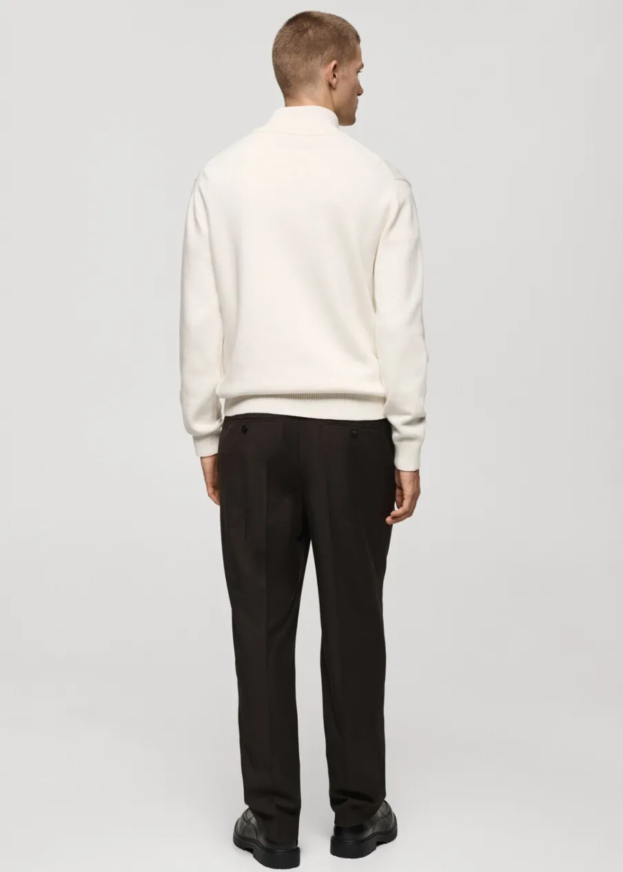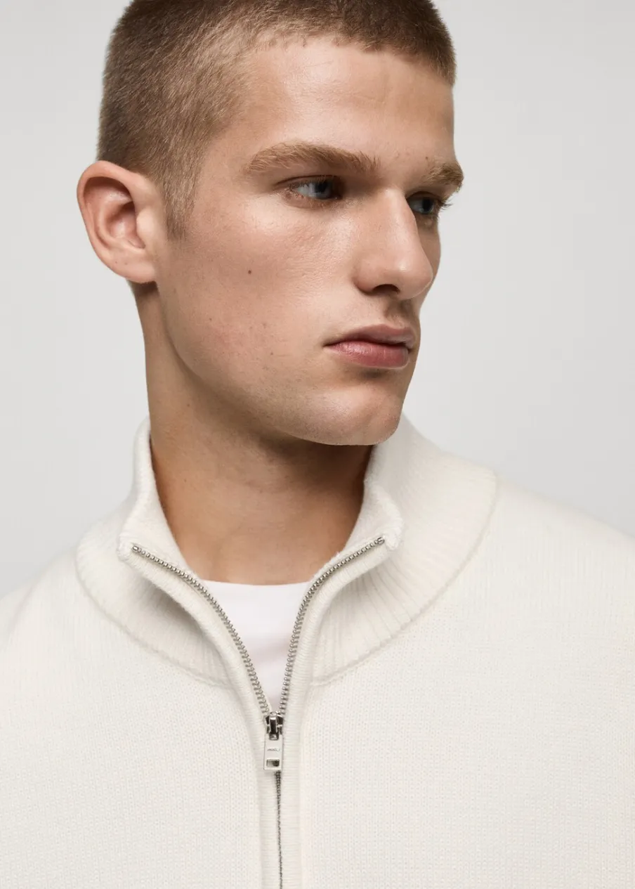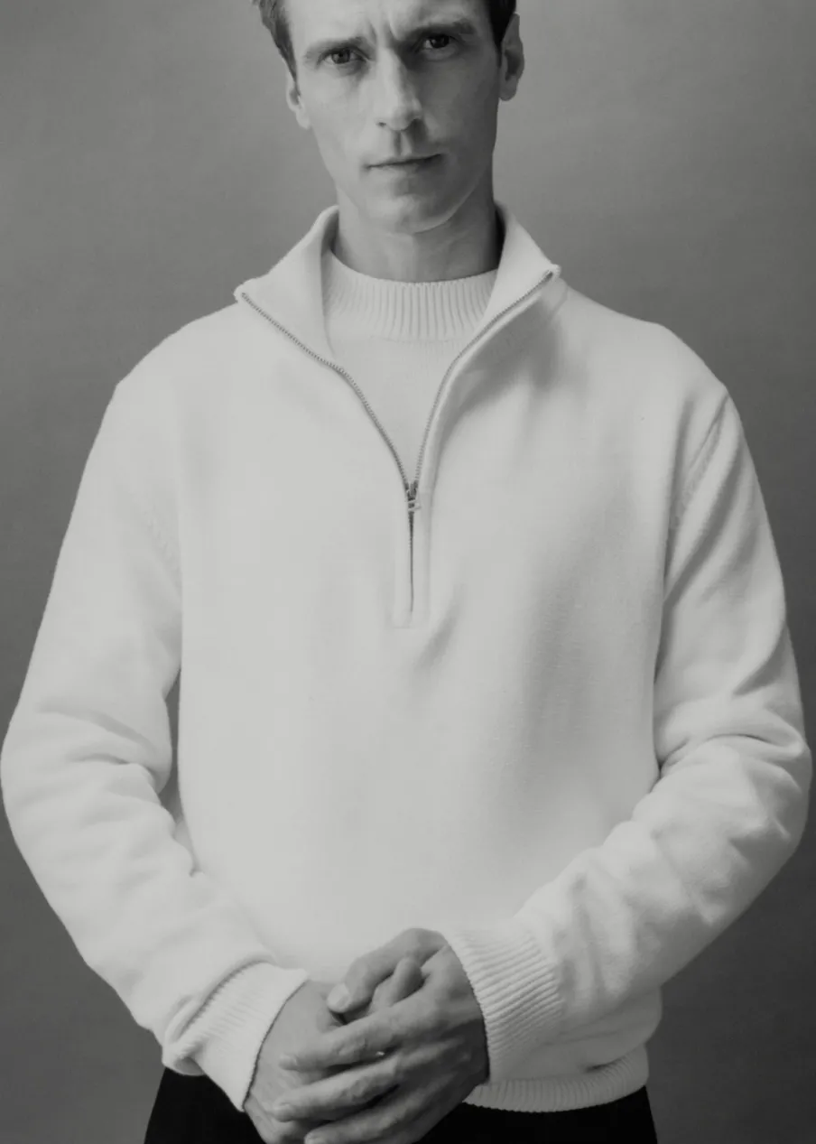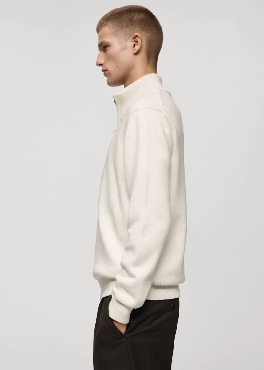 Tkanina mieszanka bawełny. Model prosty. Półgolf z zapięciem na zamek. Długi rękaw. Prosty dół. Kontrastowe prążkowane wykończenie na dekolcie, rękawach i u dołu. Model ma 190 cm wzrostu i nosi rozmiar M. Dzianina o średniej grubości.