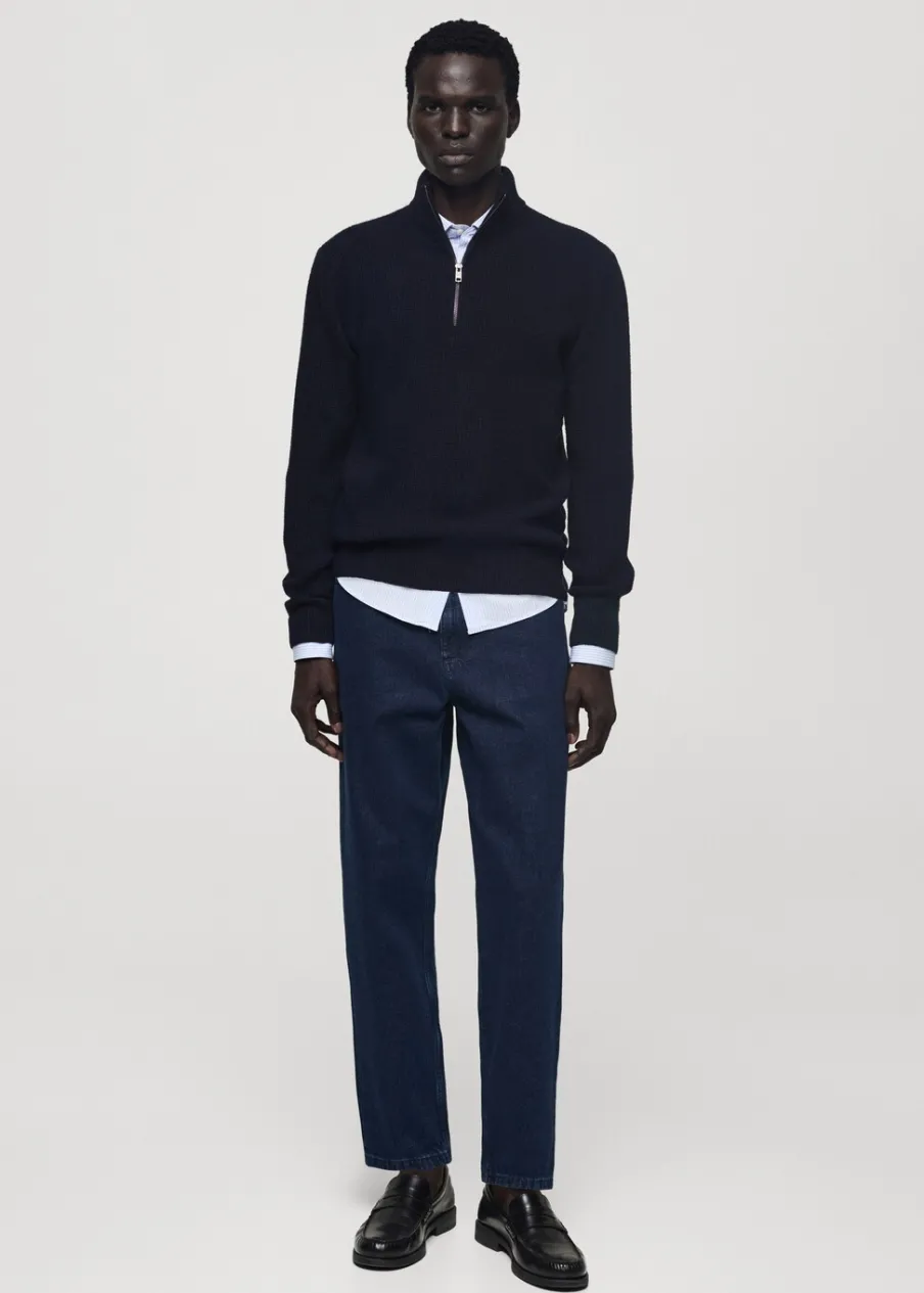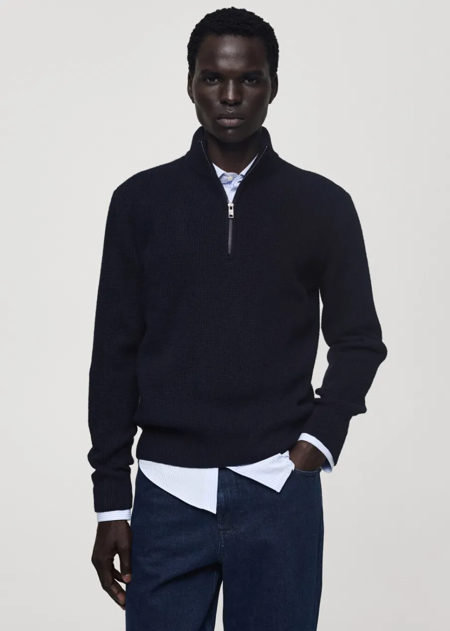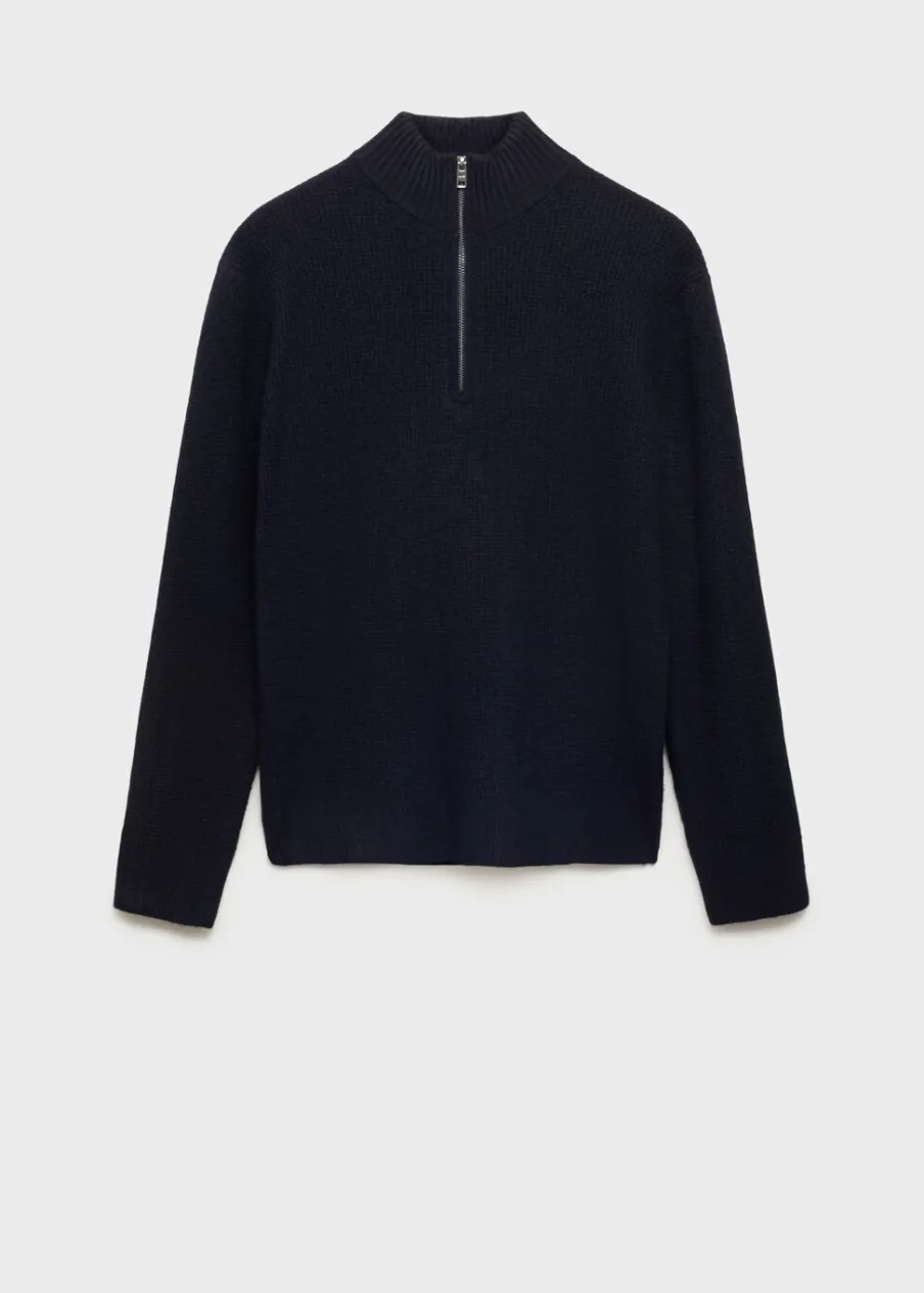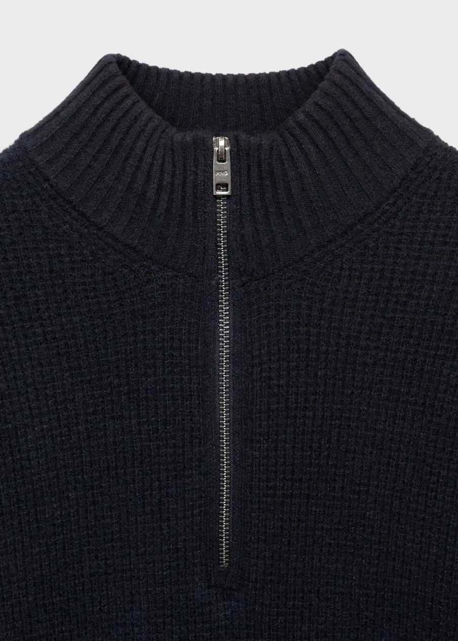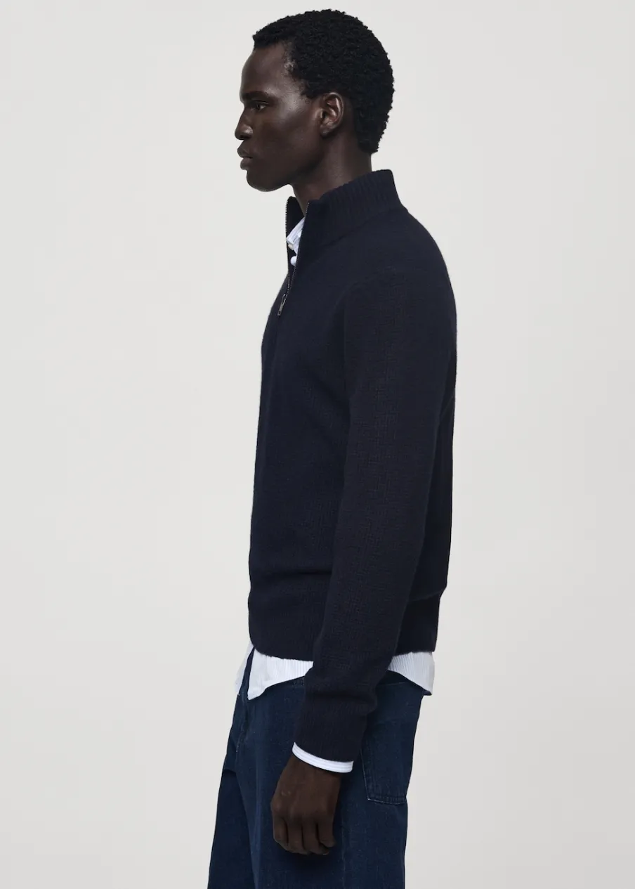 Krój regular. Dzianina średniej grubości. Materiały z recyklingu. Długi rękaw. Półgolf na zamek. Ściągaczowe wykończenia. Model ma 185 cm wzrostu i nosi rozmiar M. Kolory niebieski i biały są dostępne tylko online.