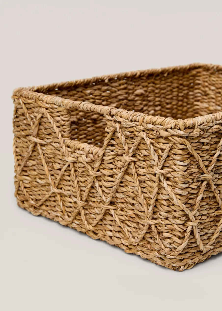 Wymiary: 45 x 35 x 21 cm. 100% pałka. Struktura z metalu. Tkanina z naturalnego włókna. Do przechowywania i organizowania książek, ubrań, zabawek i innych przedmiotów. Zaprowadzisz porządek w elegancki sposób, a rustykalna estetyka będzie świetnie dopełniać wystrój Twojego domu. Ten model koszyka jest dostępny w 2 rozmiarach (M, L).