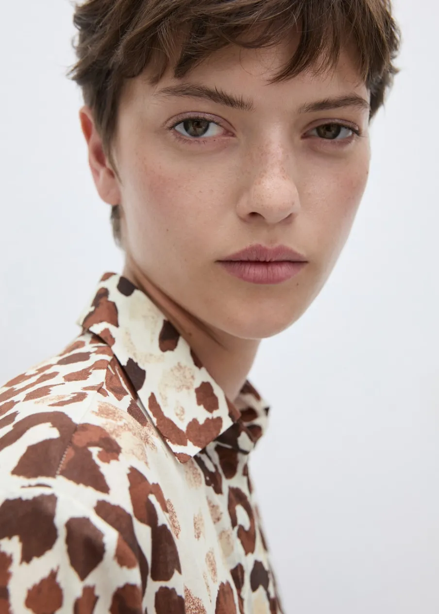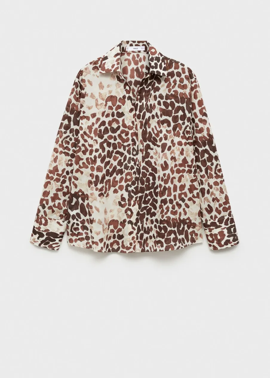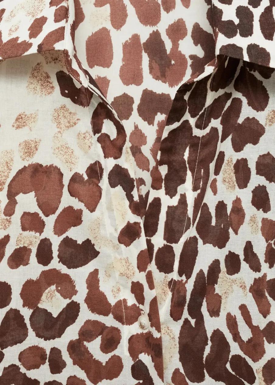 Wzór w lamparcie cętki. Model prosty. Zwierzęcy wzór. Kwiatowy wzór. Koszulowy kołnierz. Długi rękaw z guzikami na mankietach. Zapięcie na guziki z przodu. Tkanina z 100% bawełny.