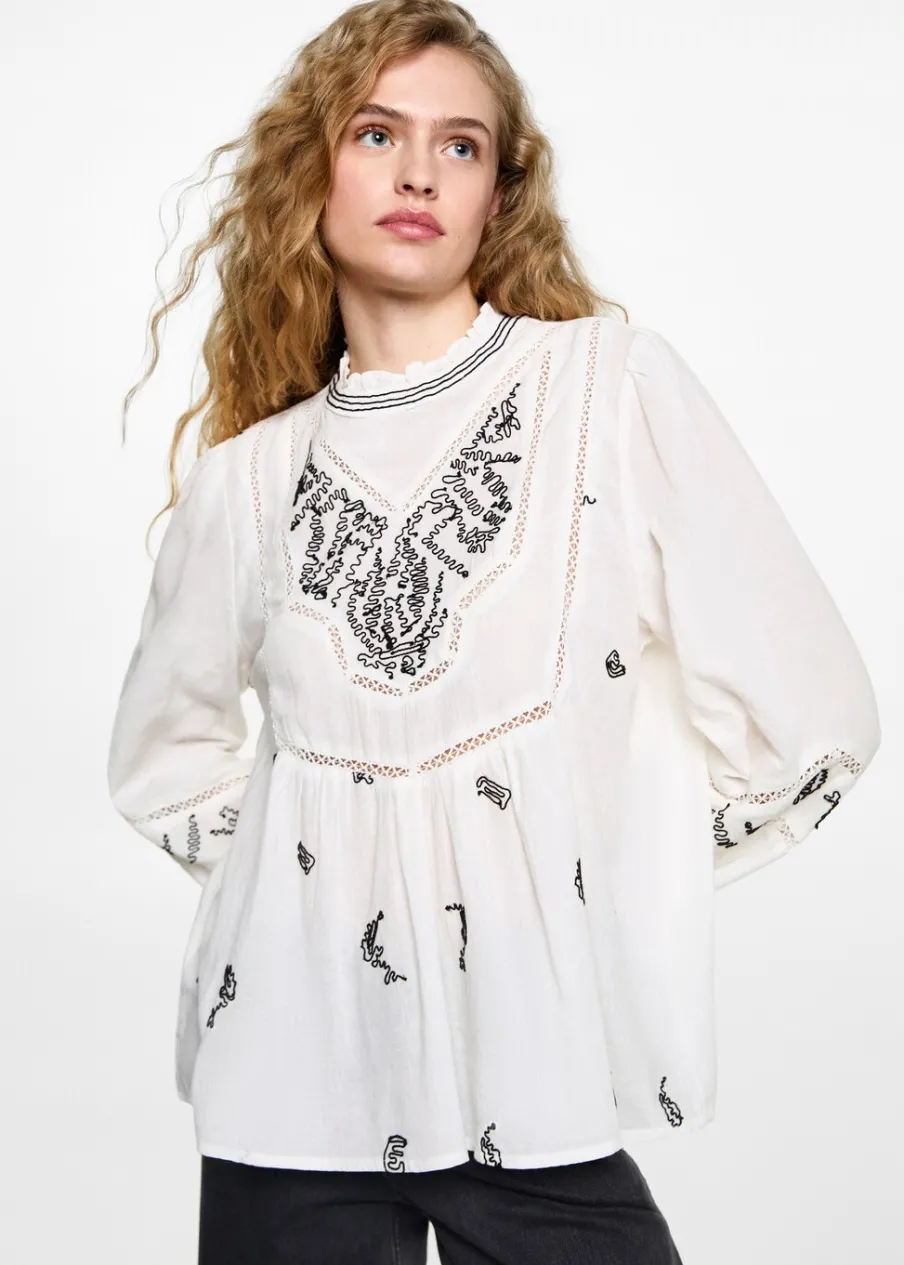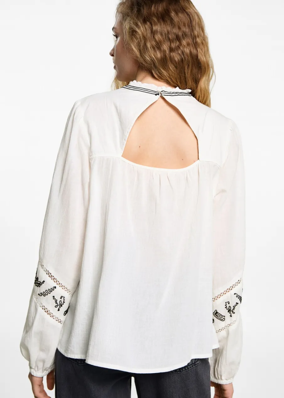 Bawełna 100%. Okrągły dekolt z falbanką. Długi rękaw. Marszczenie na mankiecie. Koronkowe elementy. Rozcięcie na plecach z zapięciem na guzik.