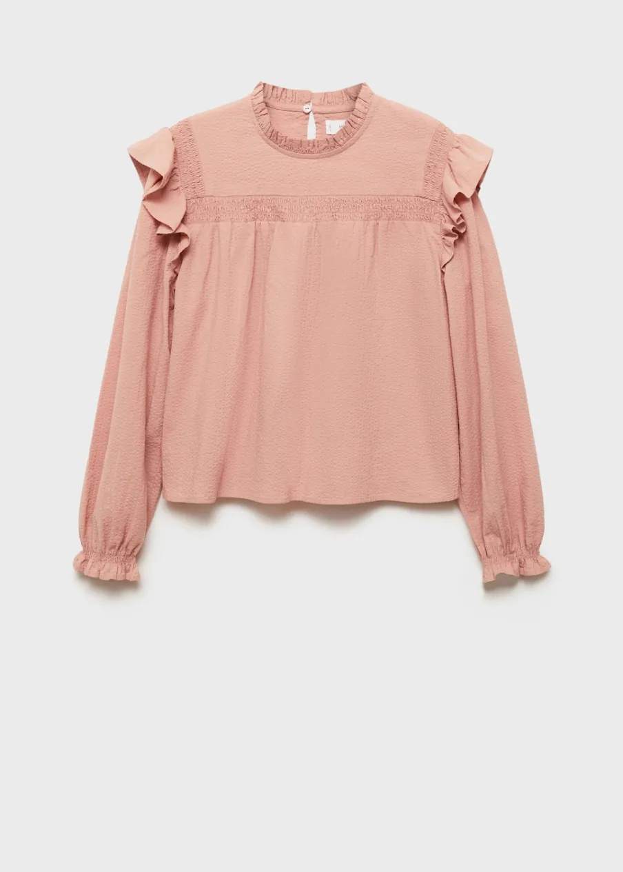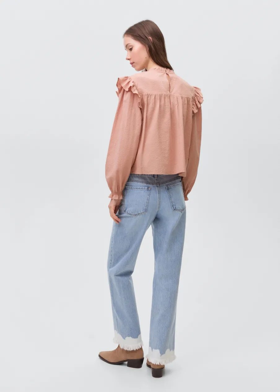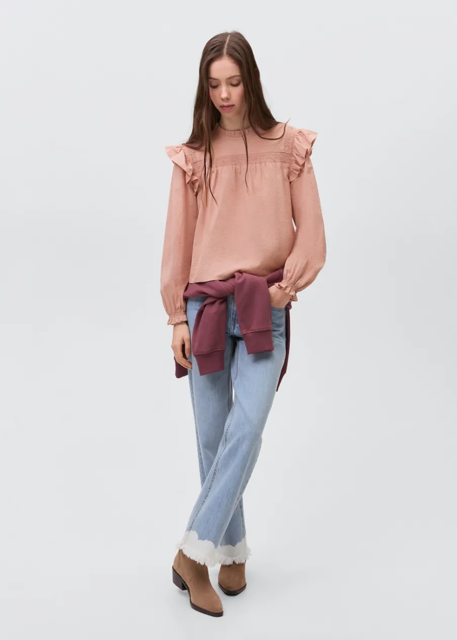 Bawełna 100%. Lejąca tkanina z teksturą. Długi rękaw. Okrągły dekolt z falbanką. Ozdobne marszczenie. Falbanki na ramionach. Ozdobne zakładki. Plisowane mankiety. Zapięcie na guzik pod szyją.
