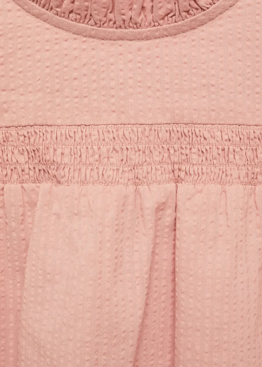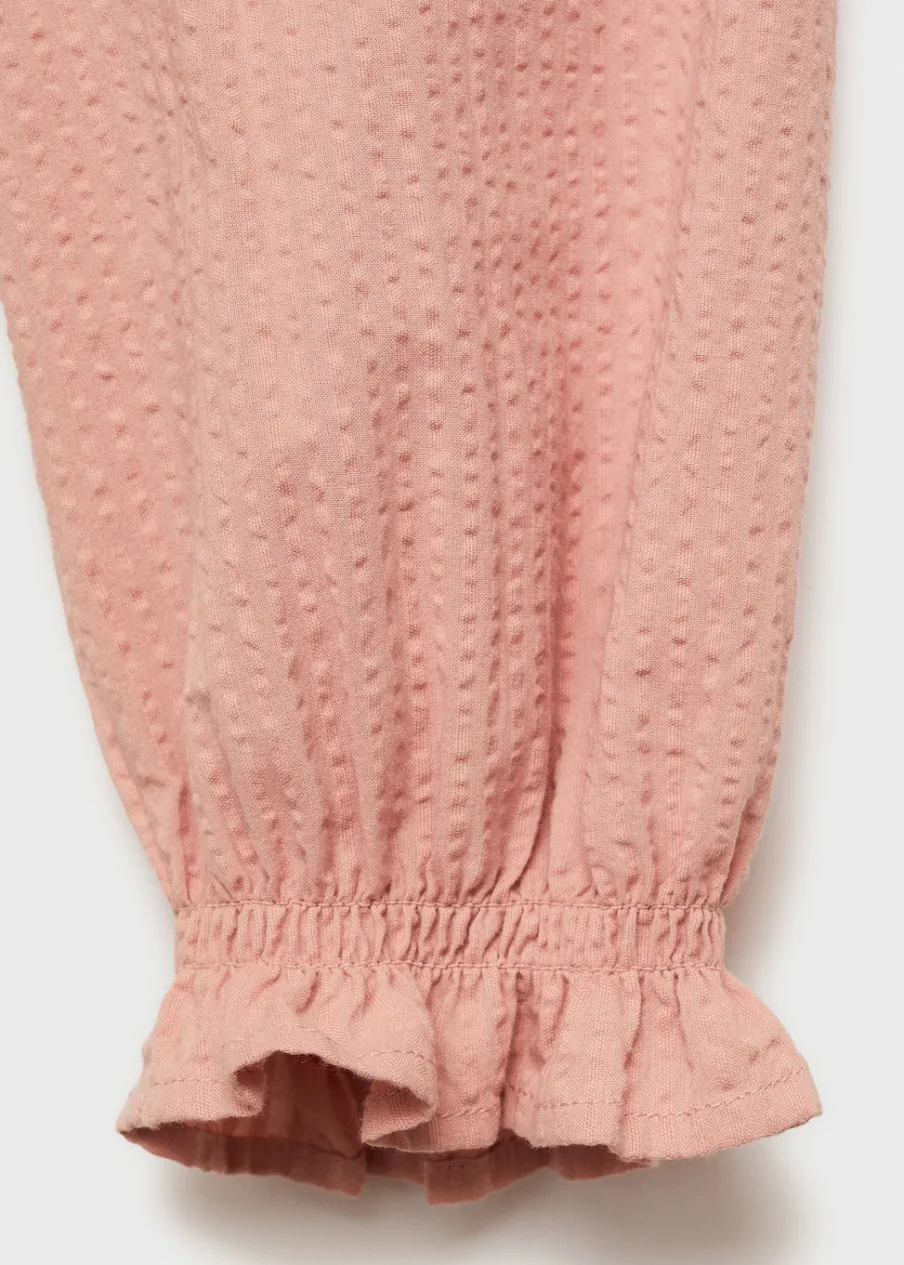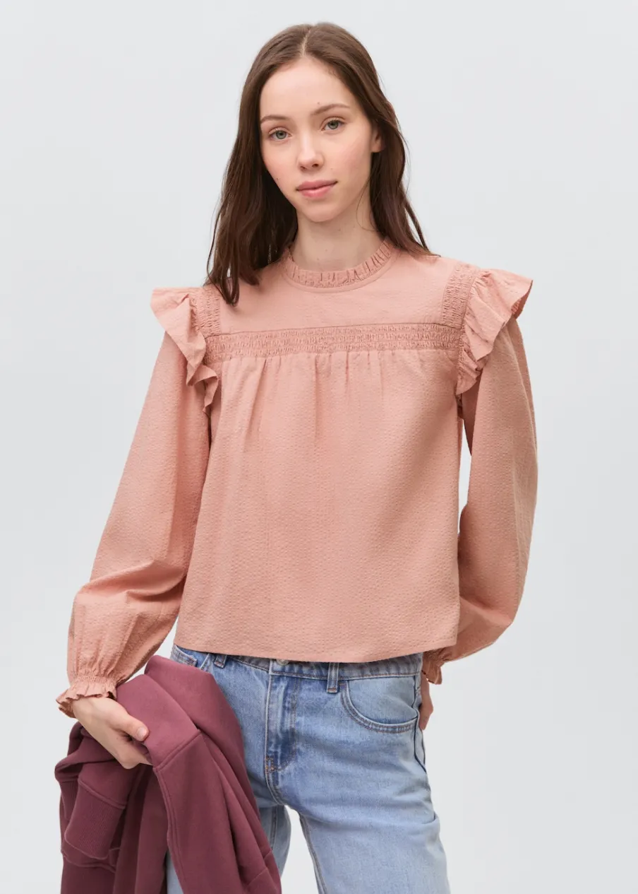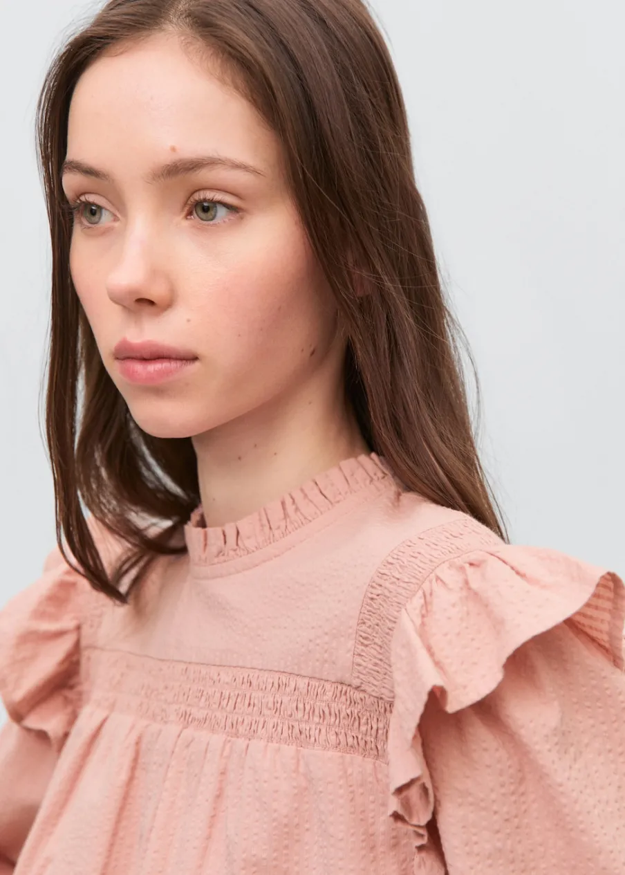 Bawełna 100%. Lejąca tkanina z teksturą. Długi rękaw. Okrągły dekolt z falbanką. Ozdobne marszczenie. Falbanki na ramionach. Ozdobne zakładki. Plisowane mankiety. Zapięcie na guzik pod szyją.