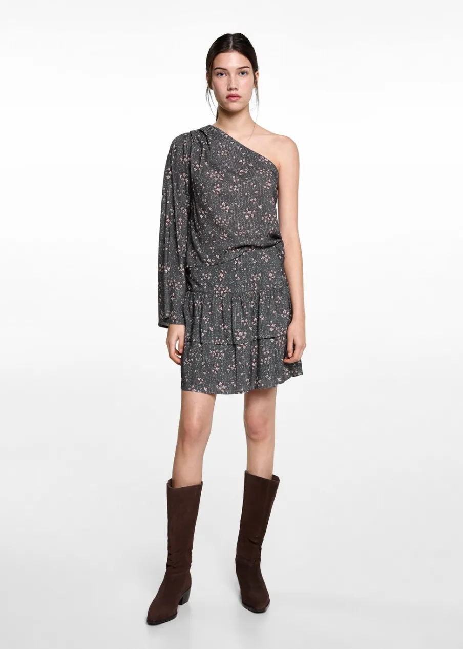 Lejąca tkanina. Tkanina z metaliczną nicią. Asymetryczny krój. Długi, rozszerzany rękaw. Asymetryczny dekolt. Zapięcie na zamek z boku.