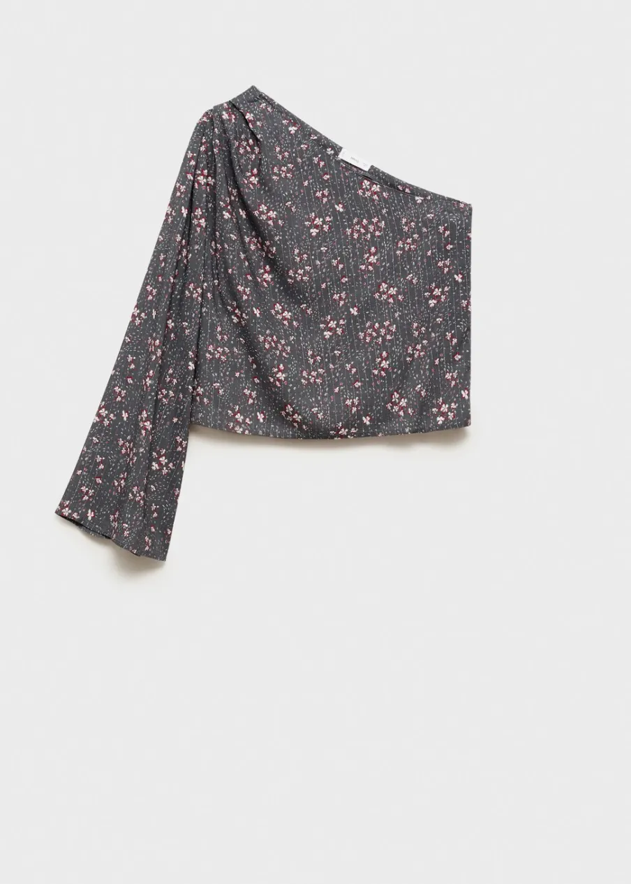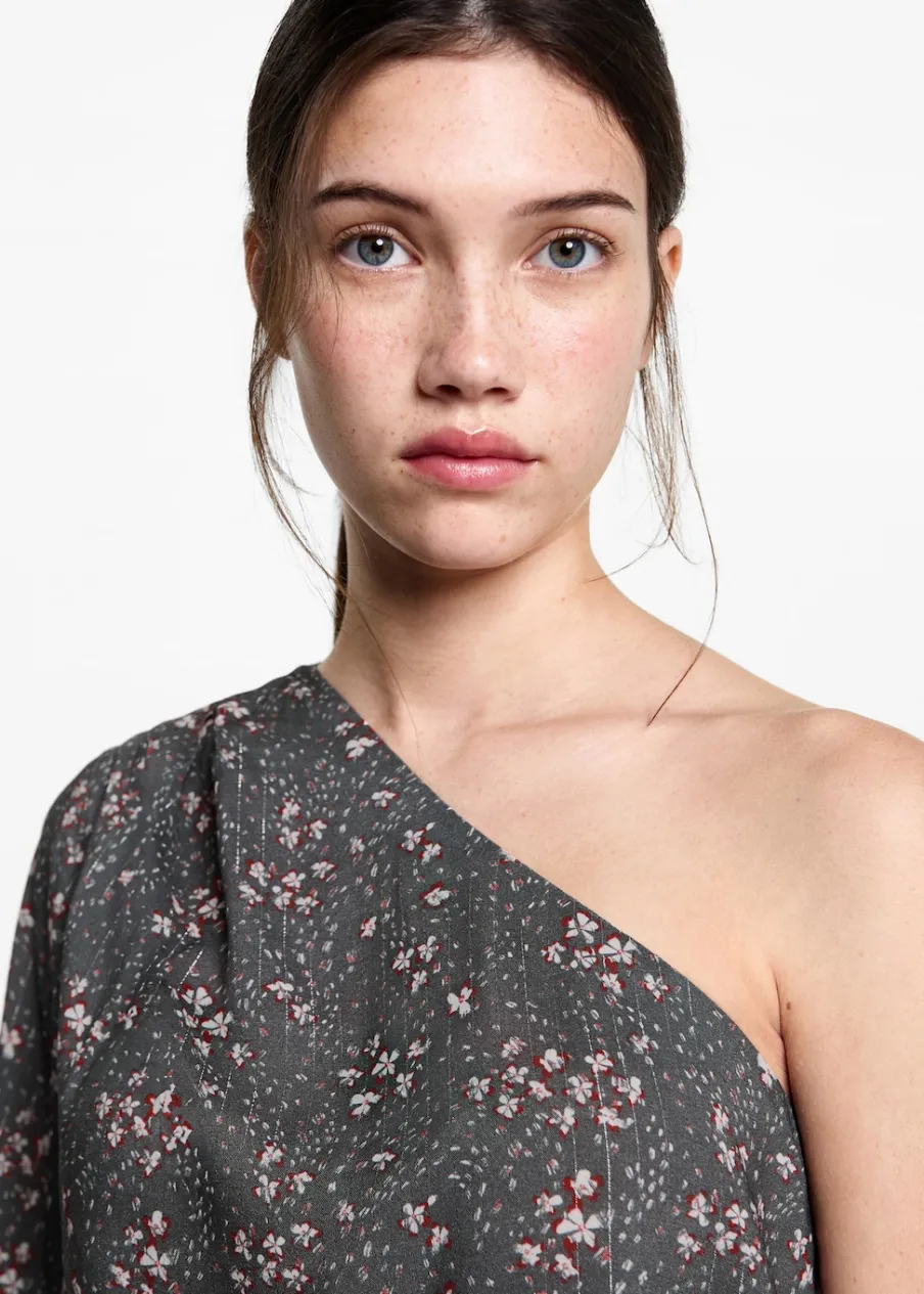 OpisLejąca tkanina. Tkanina z metaliczną nicią. Asymetryczny krój. Długi, rozszerzany rękaw. Asymetryczny dekolt. …