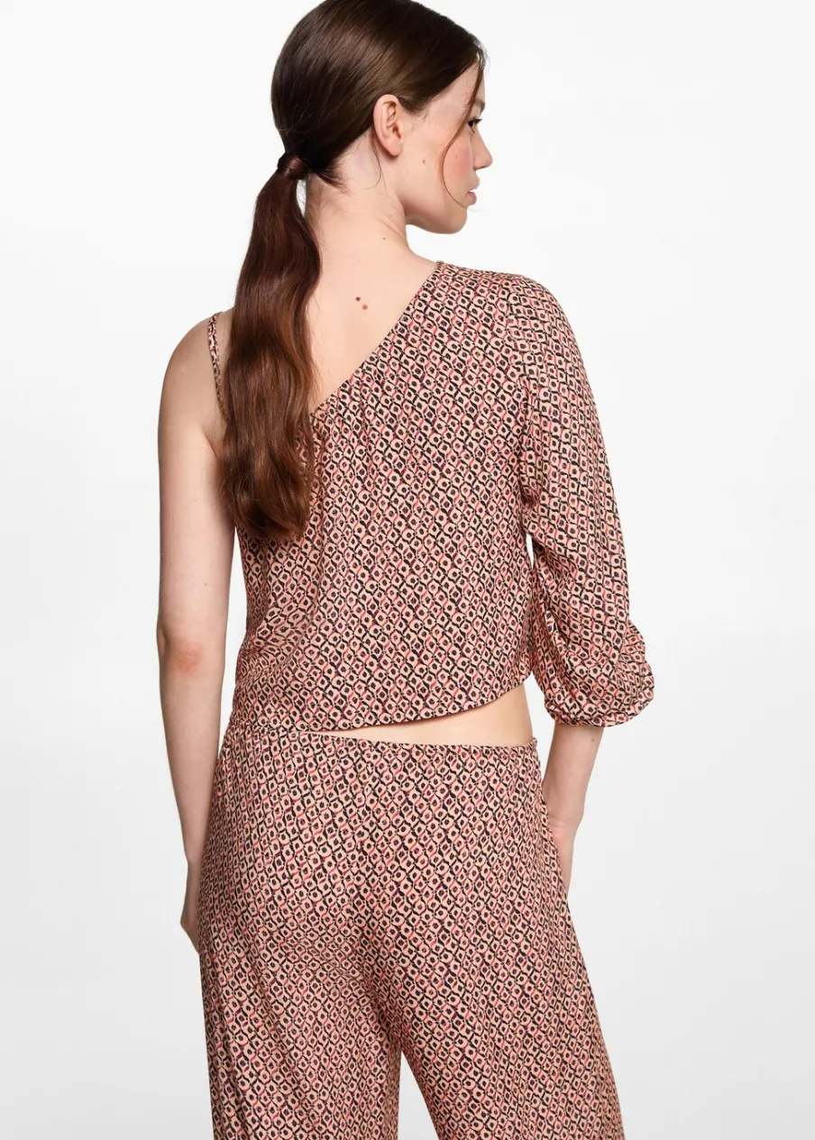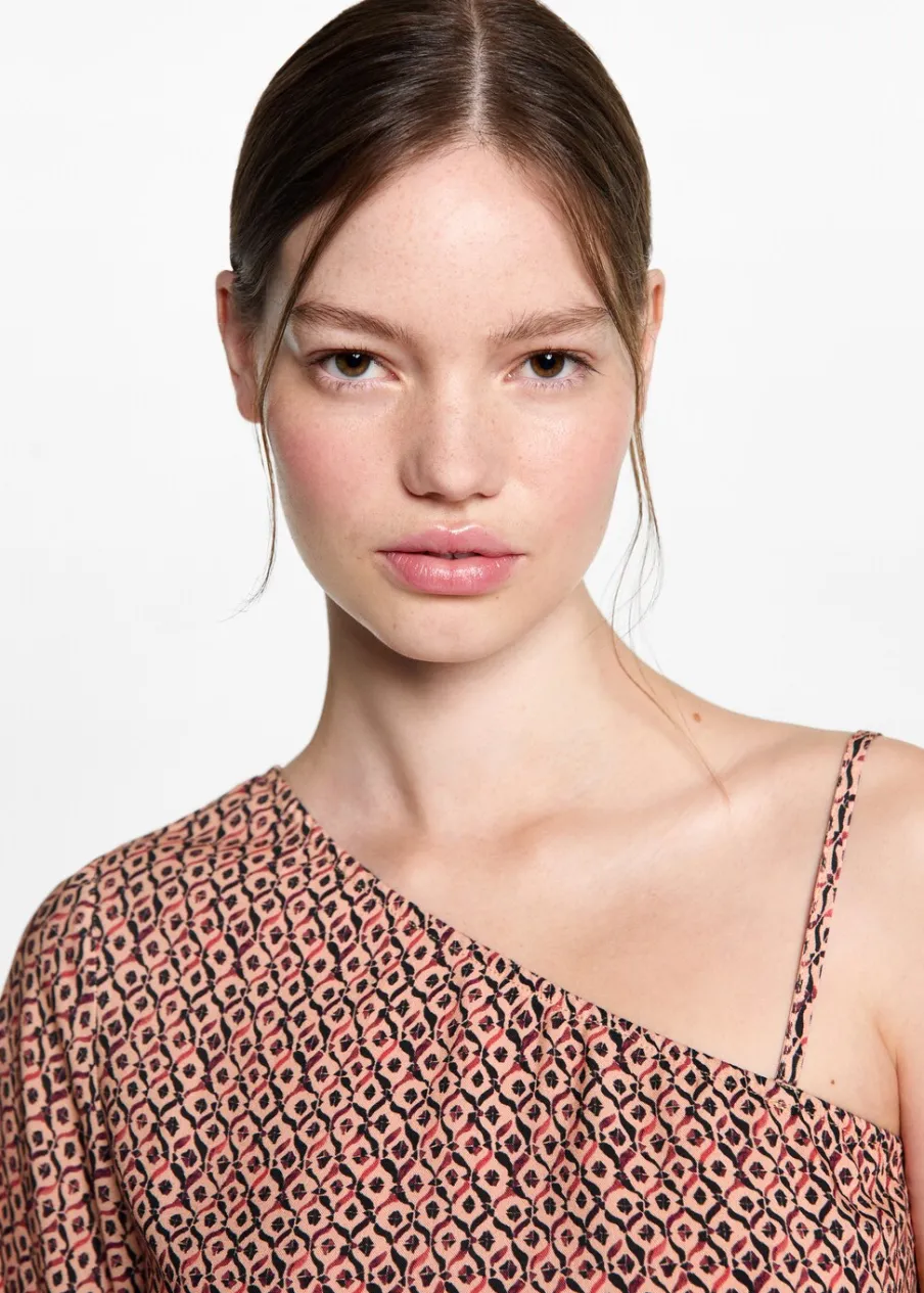 Model prosty. Asymetryczny krój. Dekolt z gumką. Wąskie ramiączko. Na jedno ramię. Długi rękaw. Nadruk. Tkanina z wiskozy.