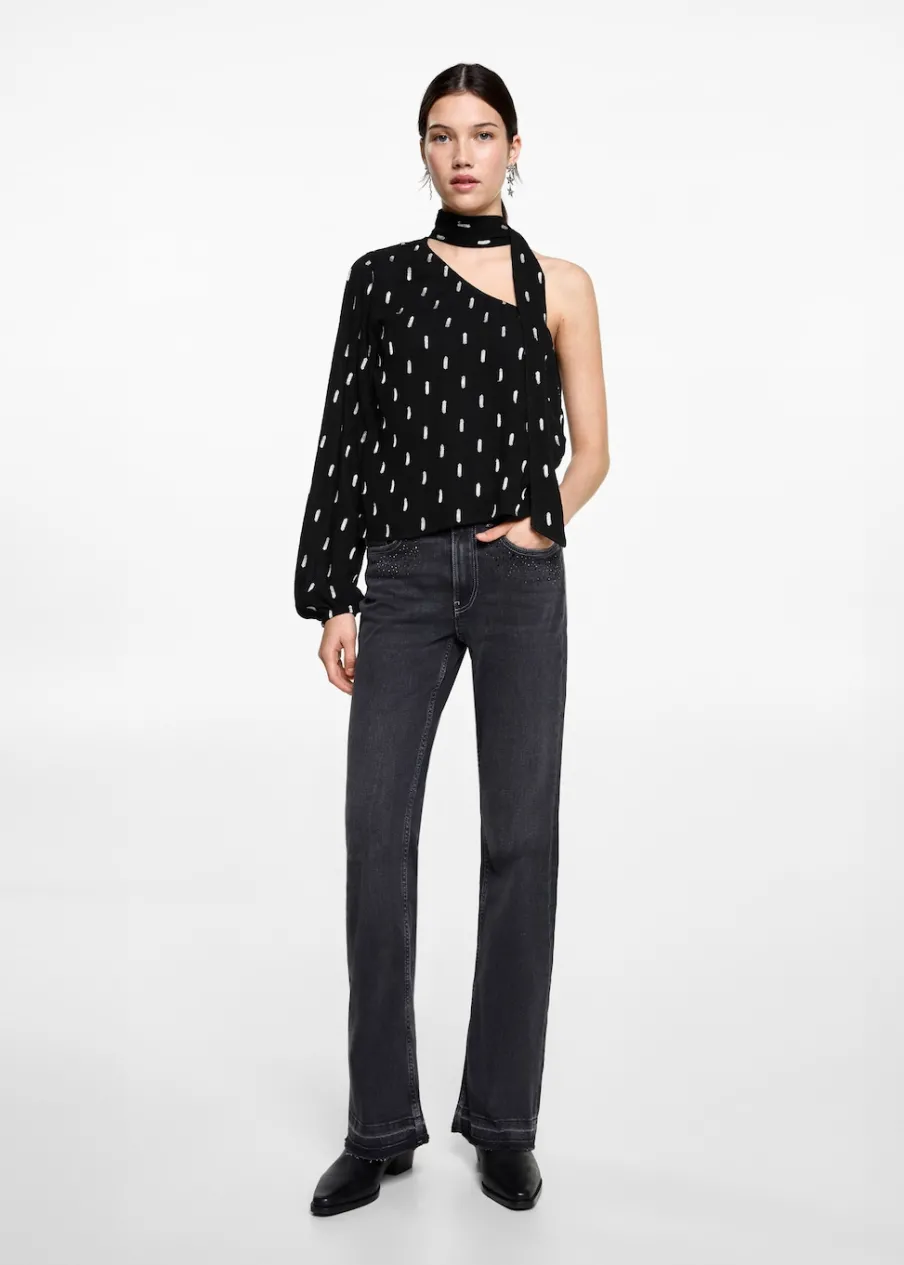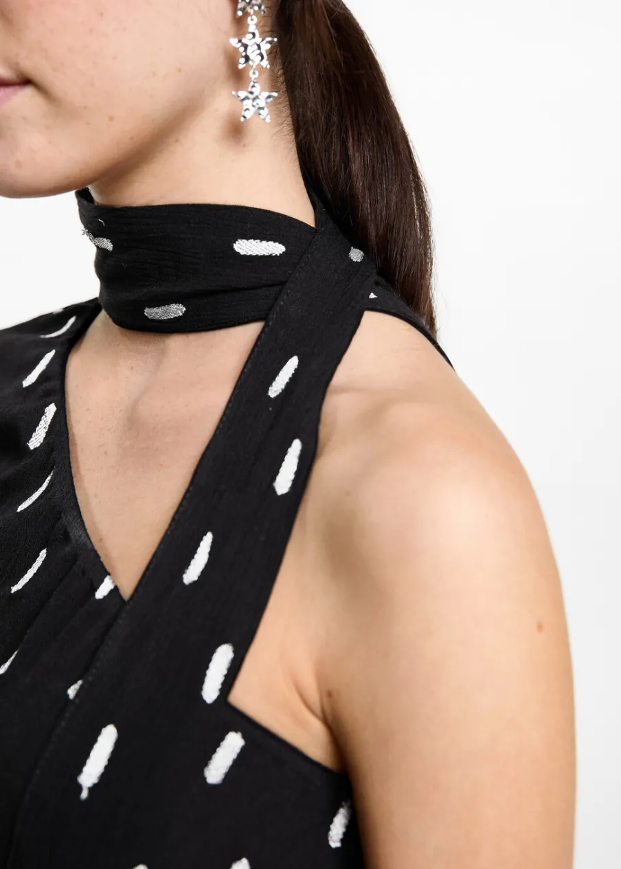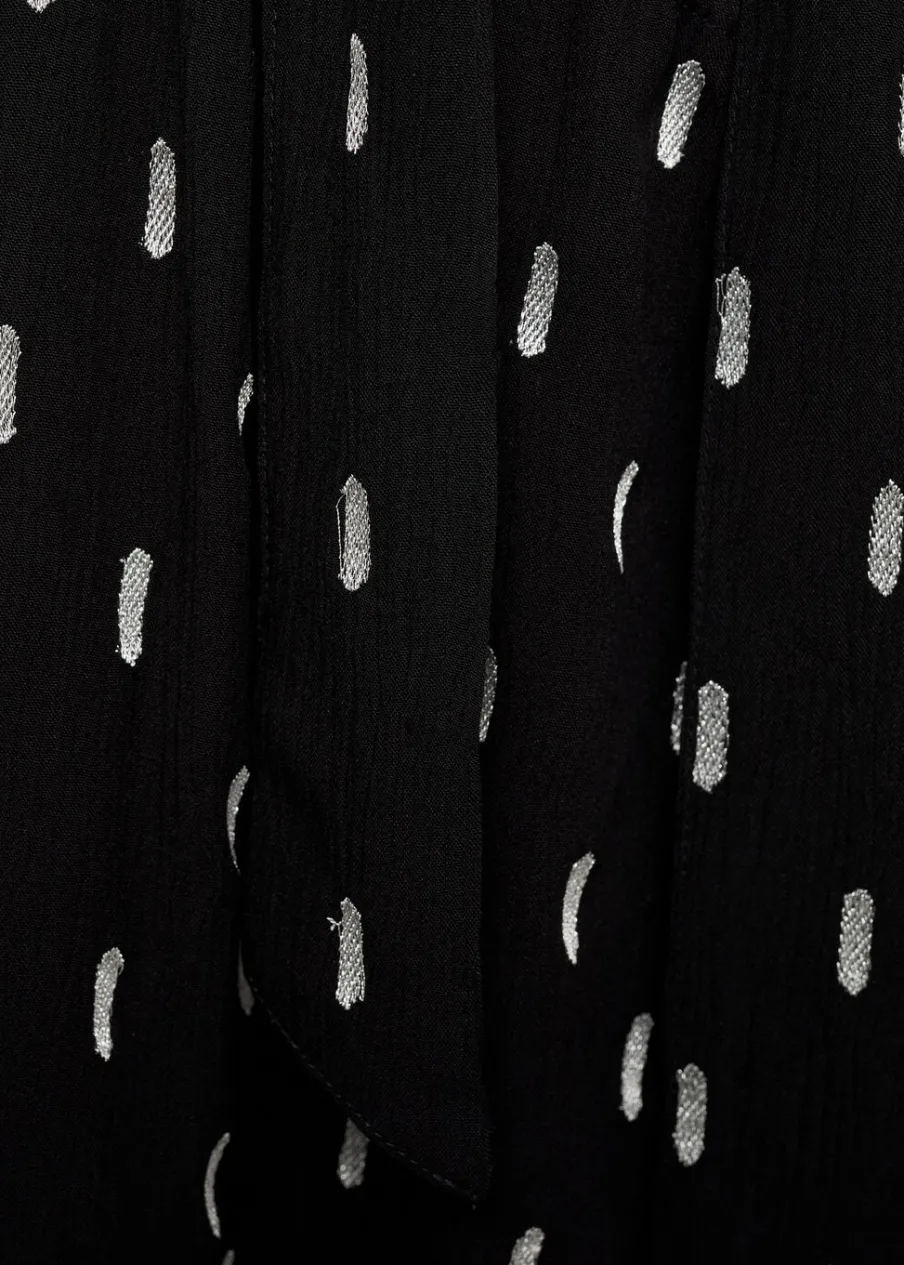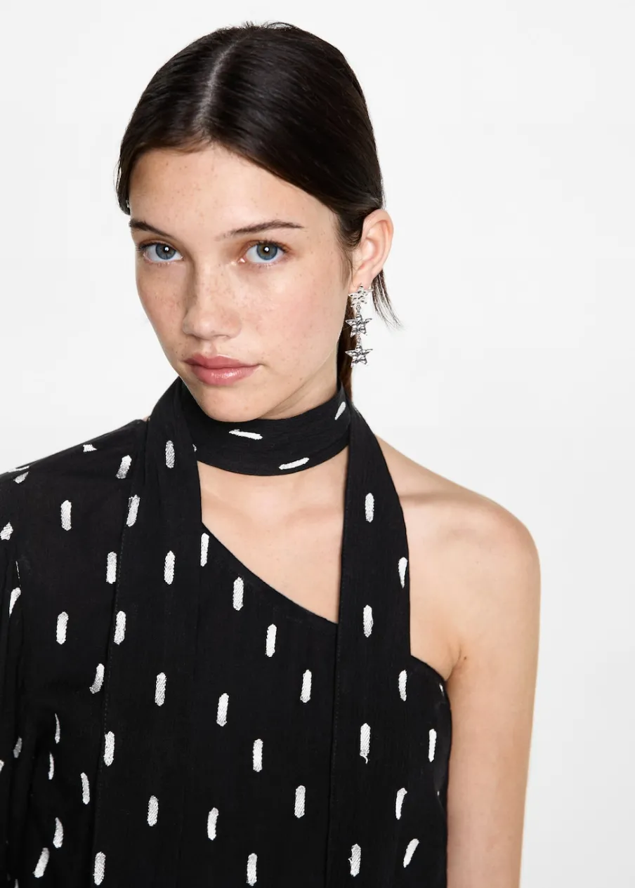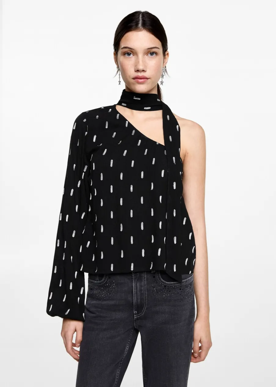 Tkanina z metaliczną nicią. Asymetryczny krój. Długi rękaw. Fason z odkrytymi ramionami. Okrągły dekolt. Kolekcja wieczorowa i imprezowa.