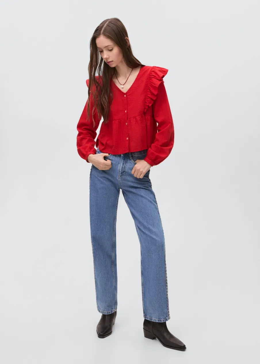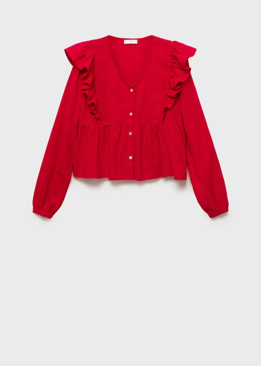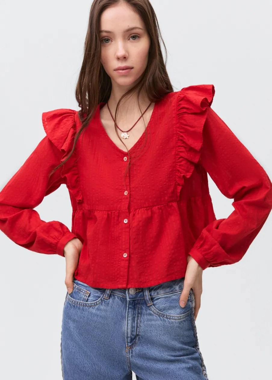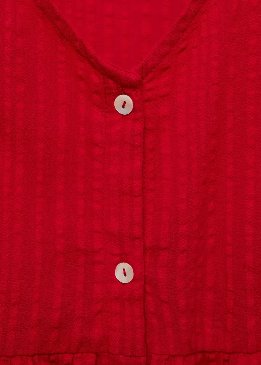 Bawełna 100%. Teksturowana tkanina w pasy. Dekolt V. Długi rękaw. Falbanki na ramionach. Marszczona talia. Zapięcie na guziki z przodu.