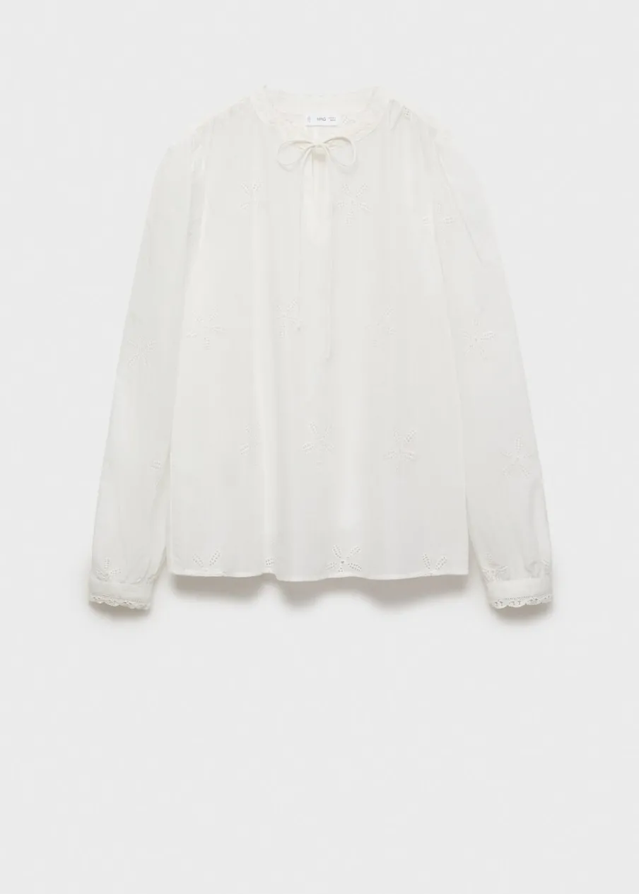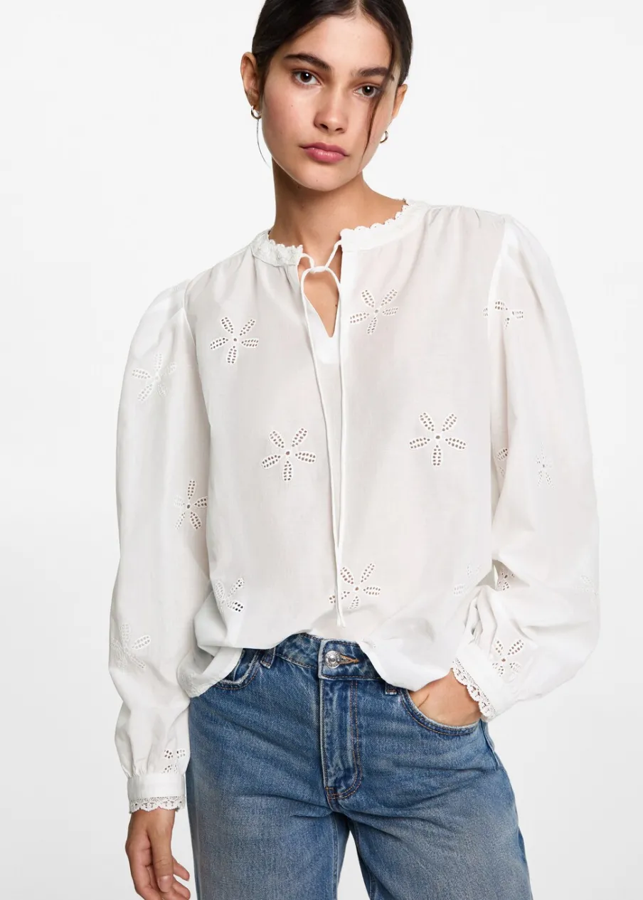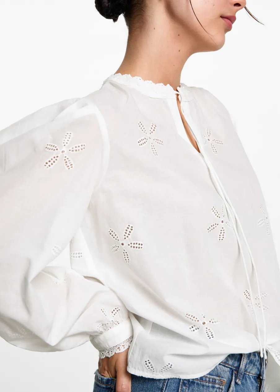 Bawełna 100%. Model prosty. Kwiatowy haft. Haftowane detale. Wiązany dekolt w szpic. Długi rękaw z guzikami na mankietach. Modelka ma 172 cm wzrostu i nosi rozmiar M.