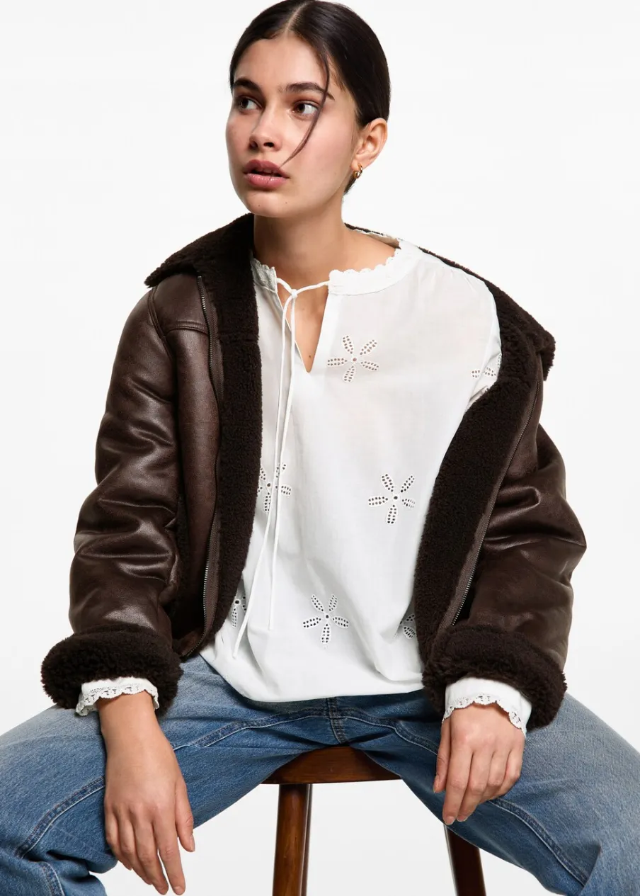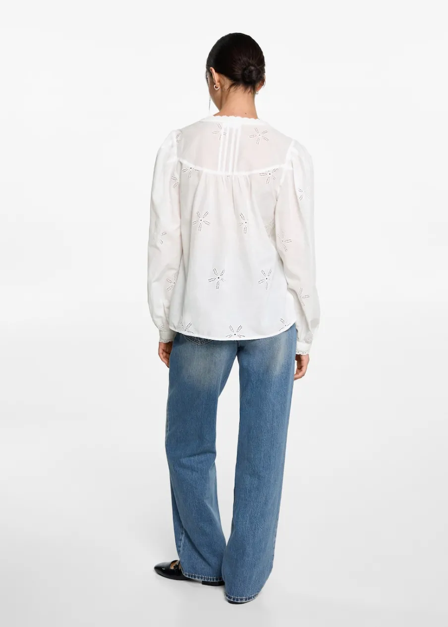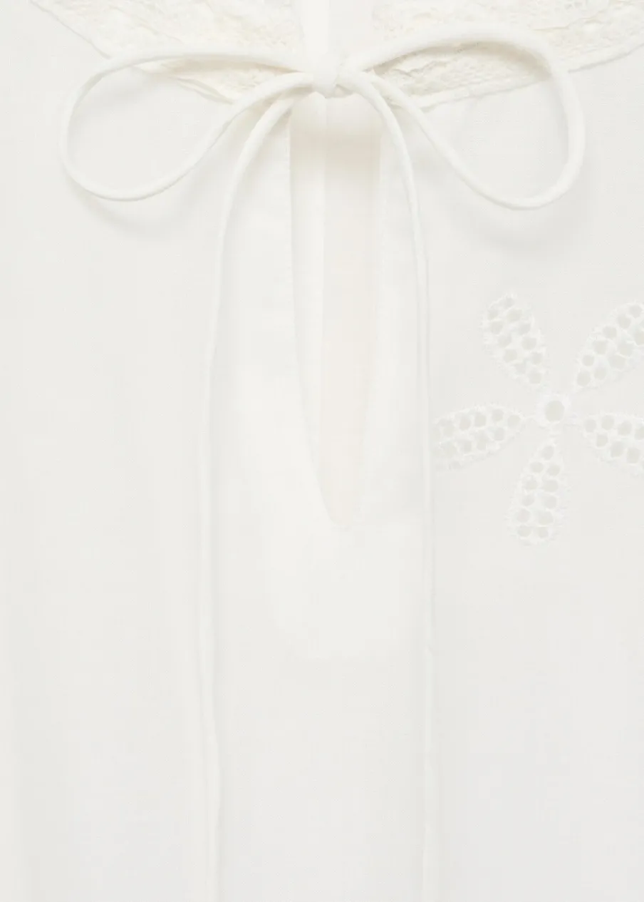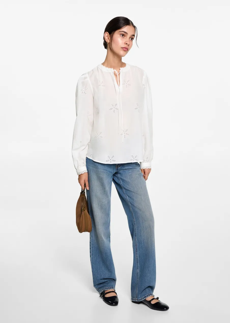 Bawełna 100%. Model prosty. Kwiatowy haft. Haftowane detale. Wiązany dekolt w szpic. Długi rękaw z guzikami na mankietach. Modelka ma 172 cm wzrostu i nosi rozmiar M.