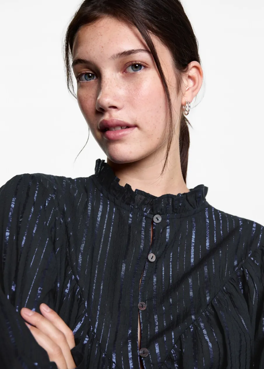 Tkanina lureks. Model prosty. Okrągły dekolt. Zapięcie z przodu. Długi rękaw. Wzór w paski. Modelka ma 172 cm wzrostu i nosi rozmiar M.