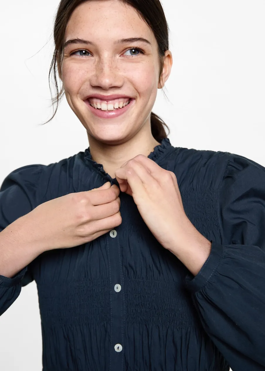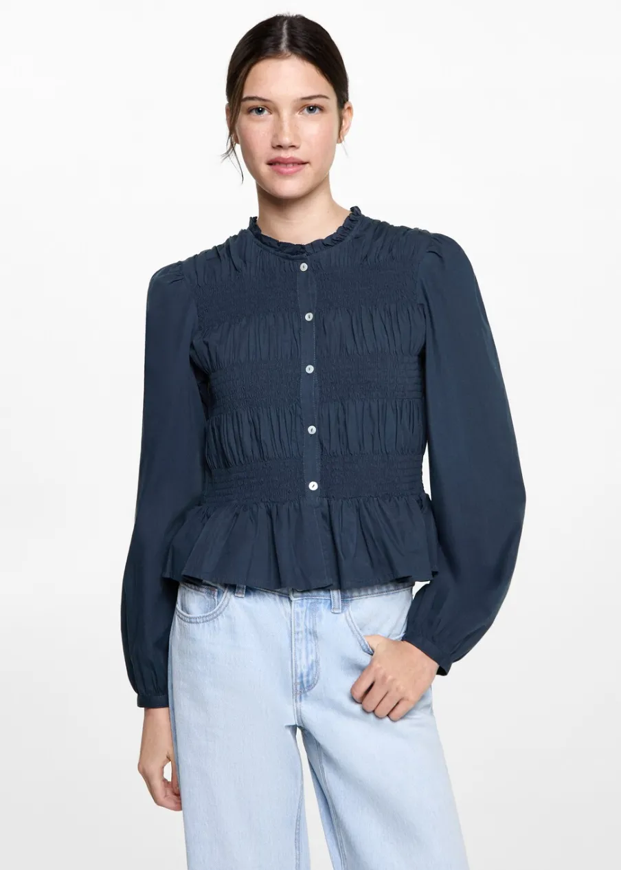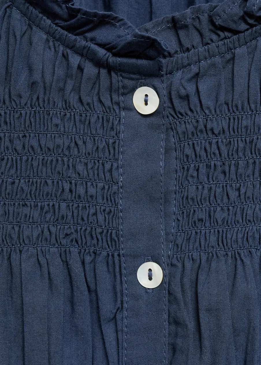 Tkanina z 100% bawełny. Pofałdowany model. Elastyczne marszczenie. Zapięcie na guziki z przodu. Guziki z imitacji masy perłowej.