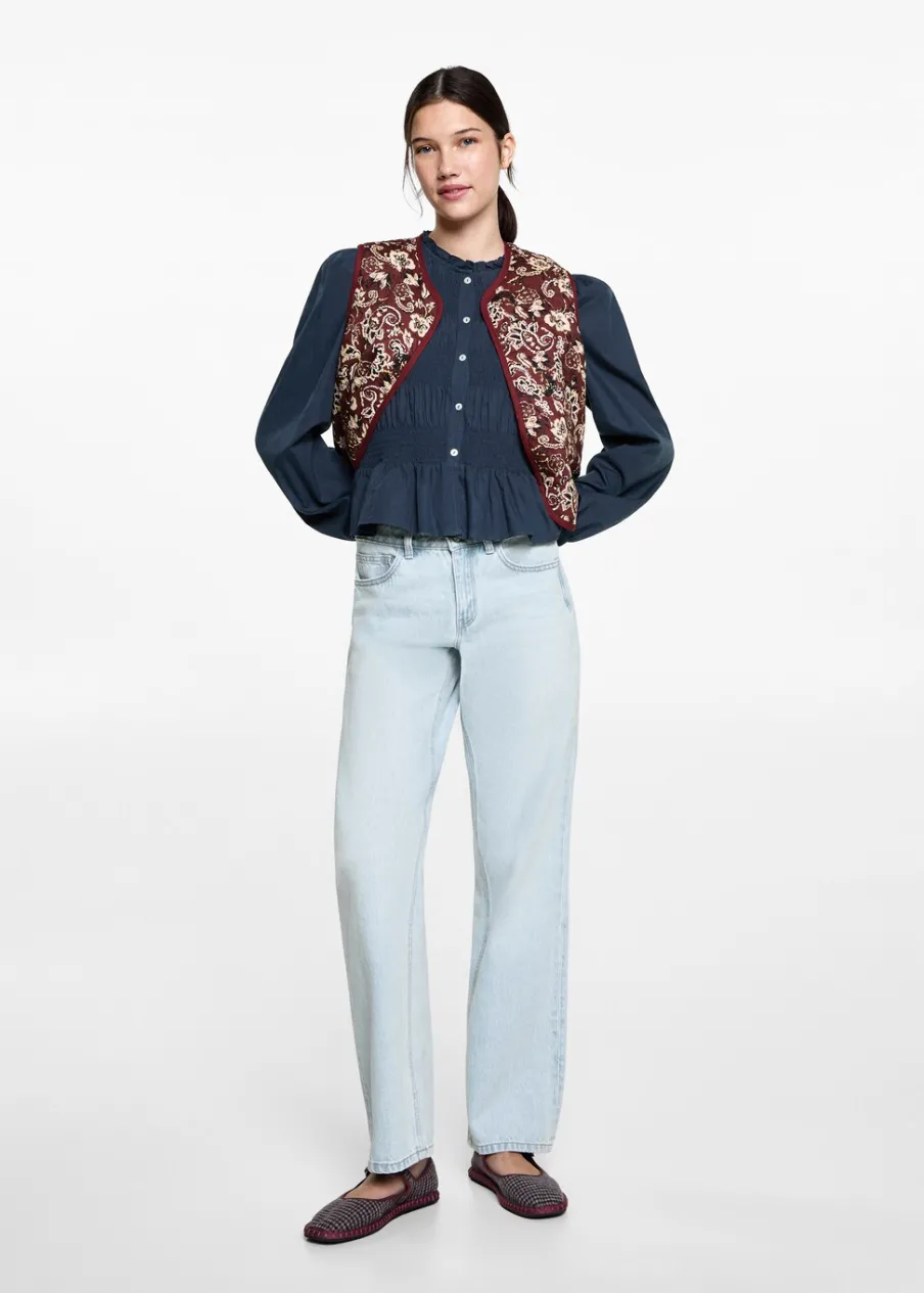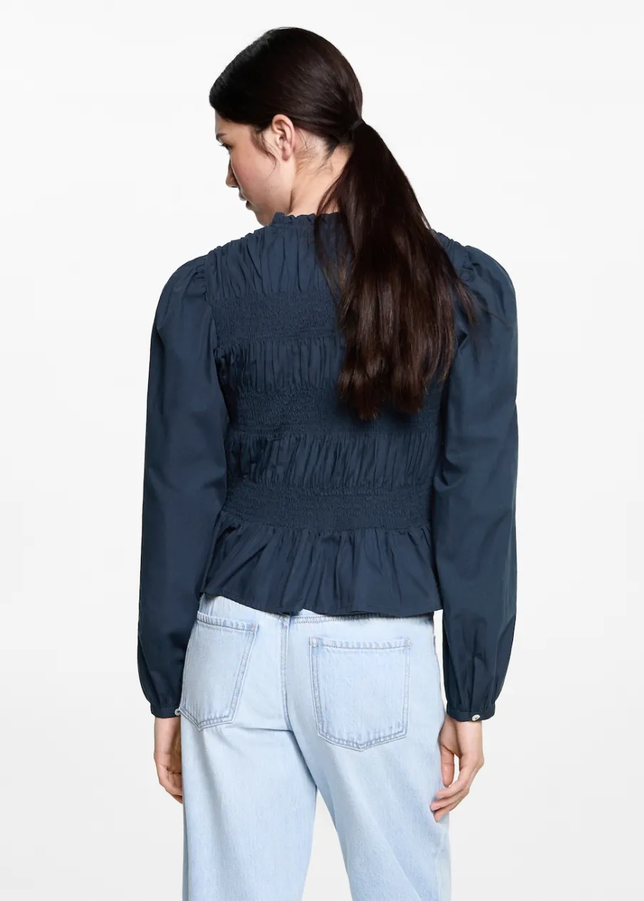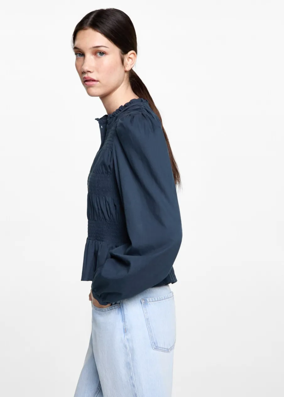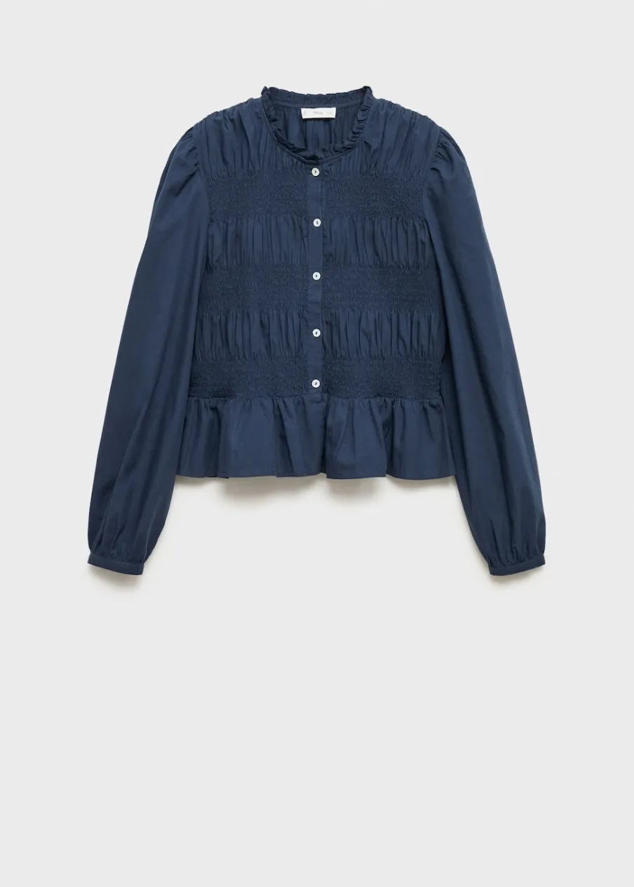 Tkanina z 100% bawełny. Pofałdowany model. Elastyczne marszczenie. Zapięcie na guziki z przodu. Guziki z imitacji masy perłowej.