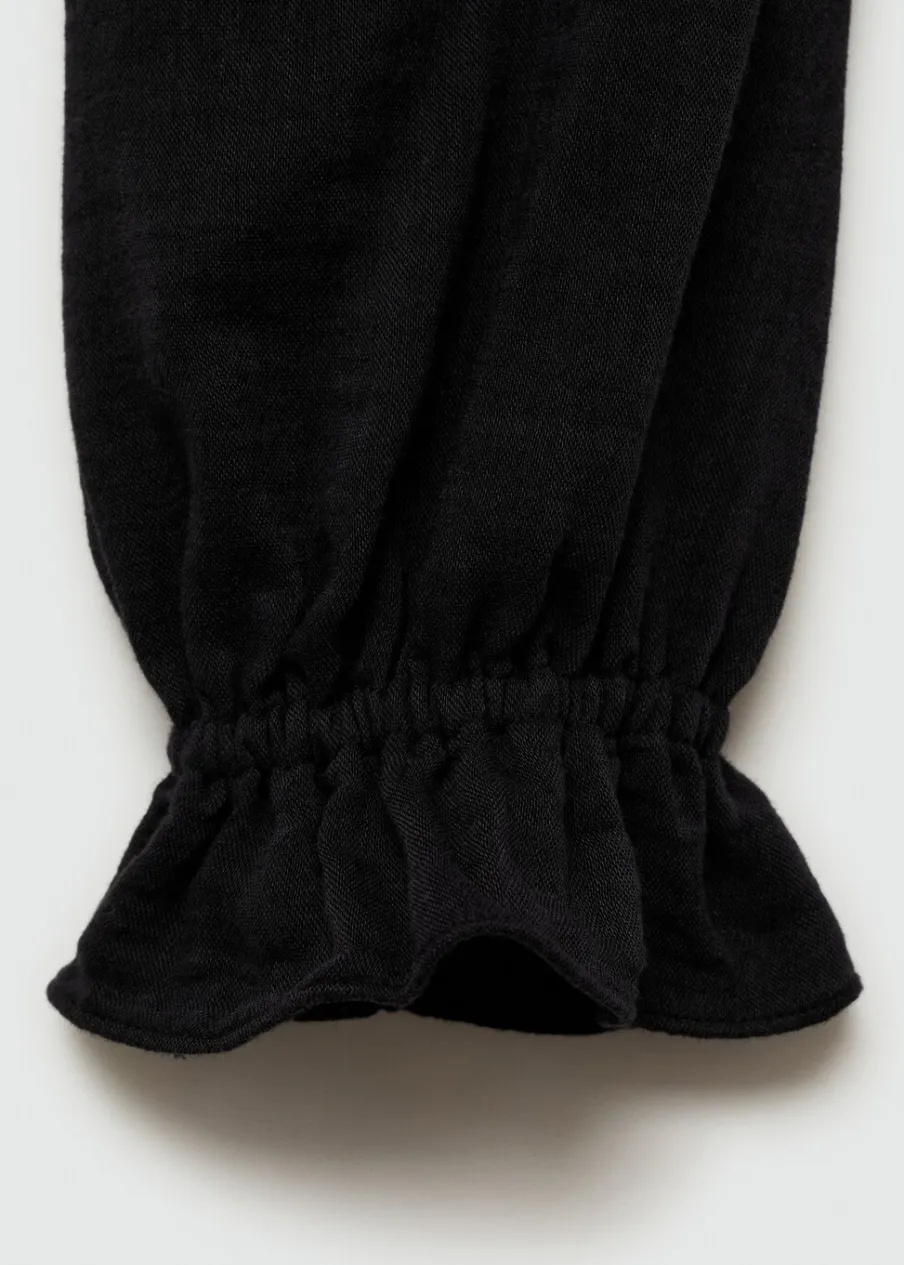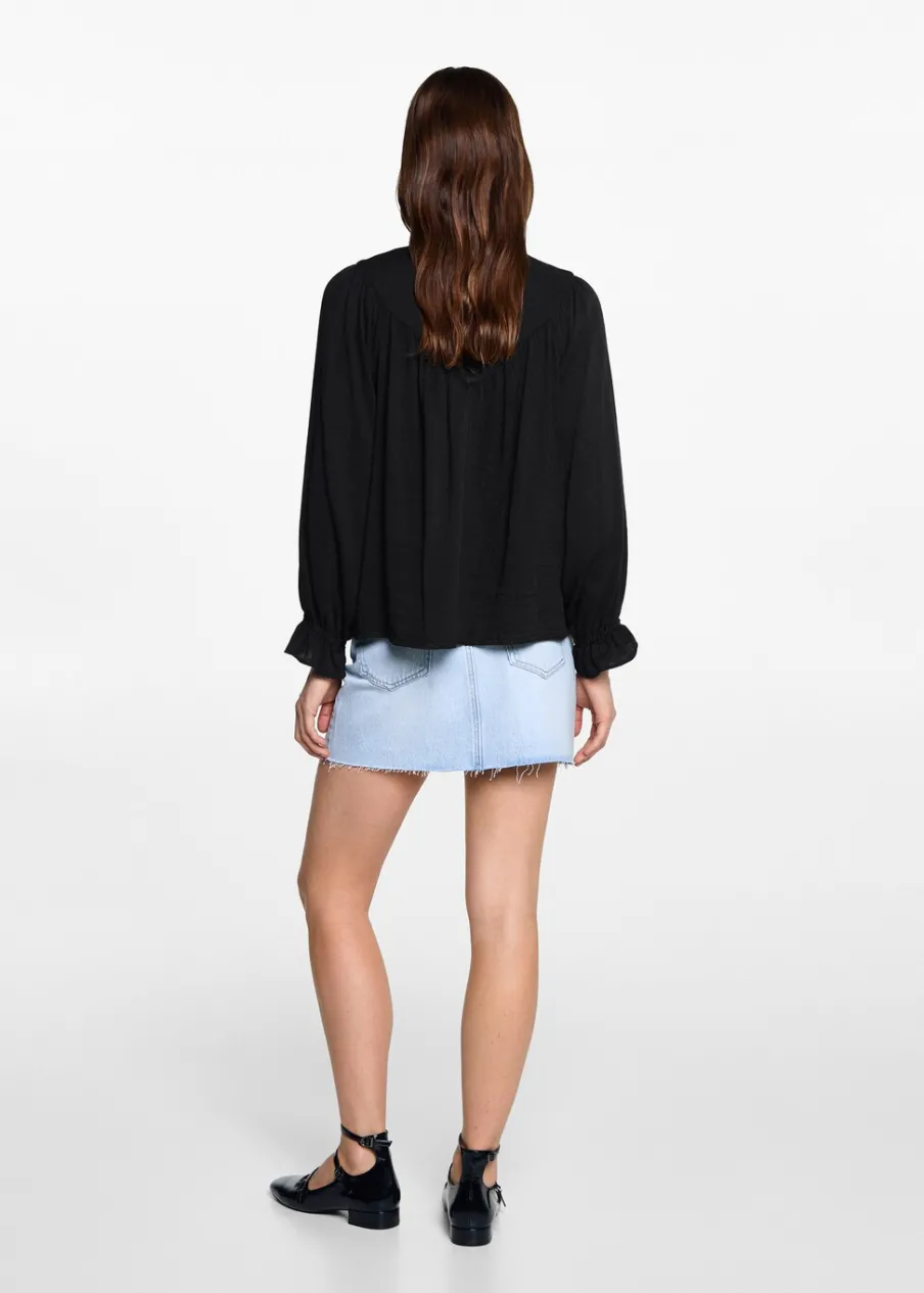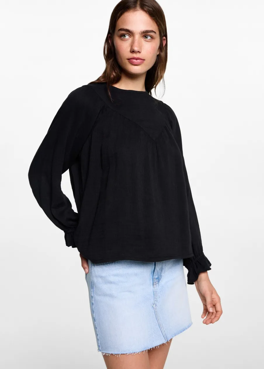 Tkanina z bawełną. Lejąca tkanina. Model prosty. Długi rękaw z elastycznymi mankietami. Marszczona tekstura. Okrągły dekolt. Zapięcie na guzik z tyłu.