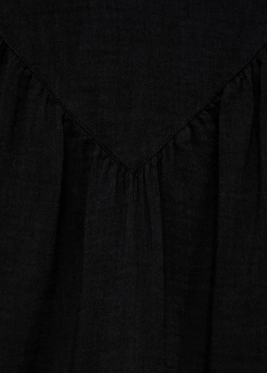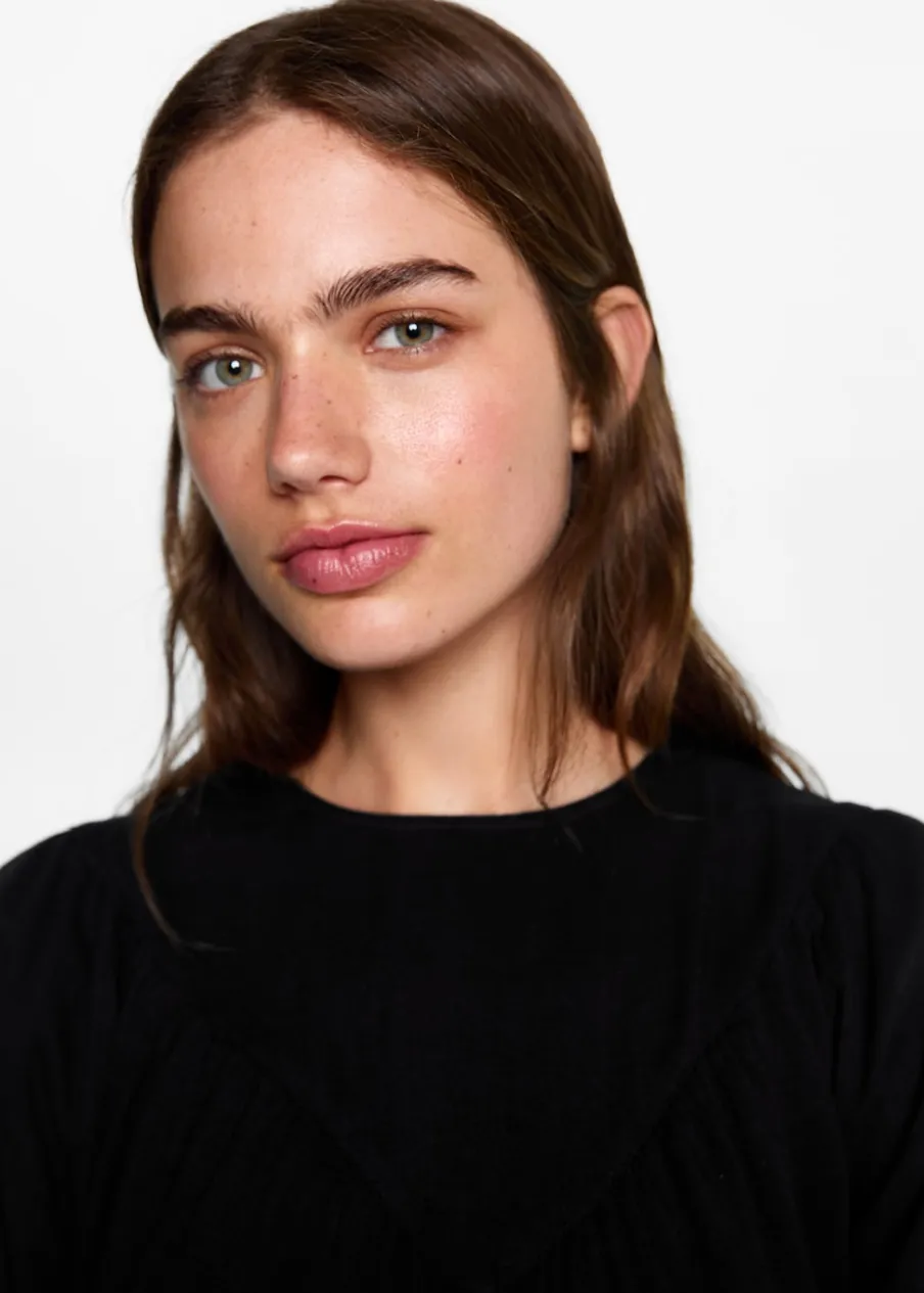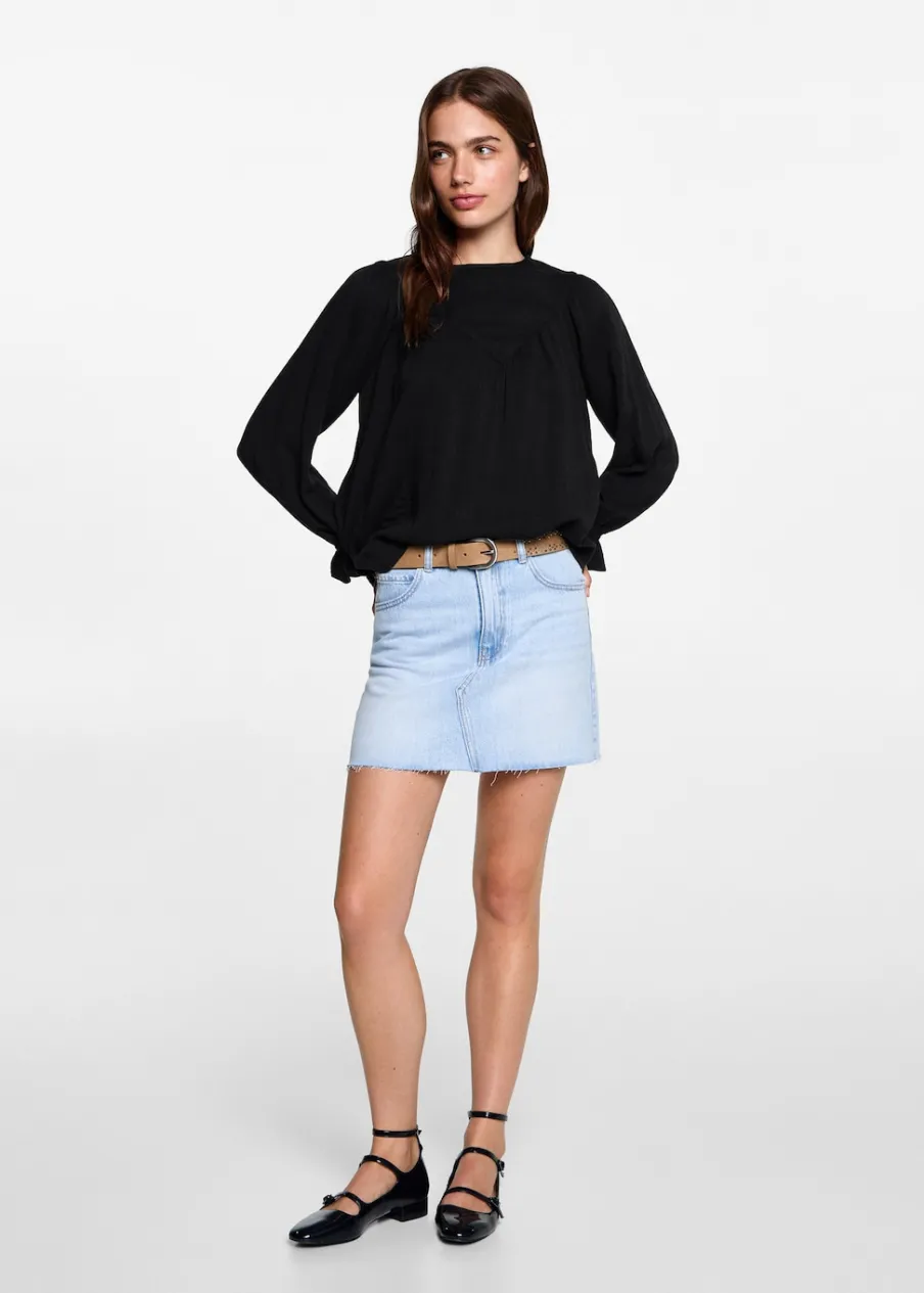 Tkanina z bawełną. Lejąca tkanina. Model prosty. Długi rękaw z elastycznymi mankietami. Marszczona tekstura. Okrągły dekolt. Zapięcie na guzik z tyłu.