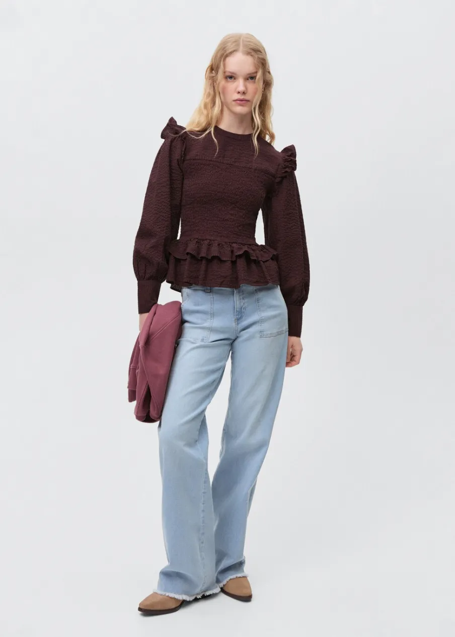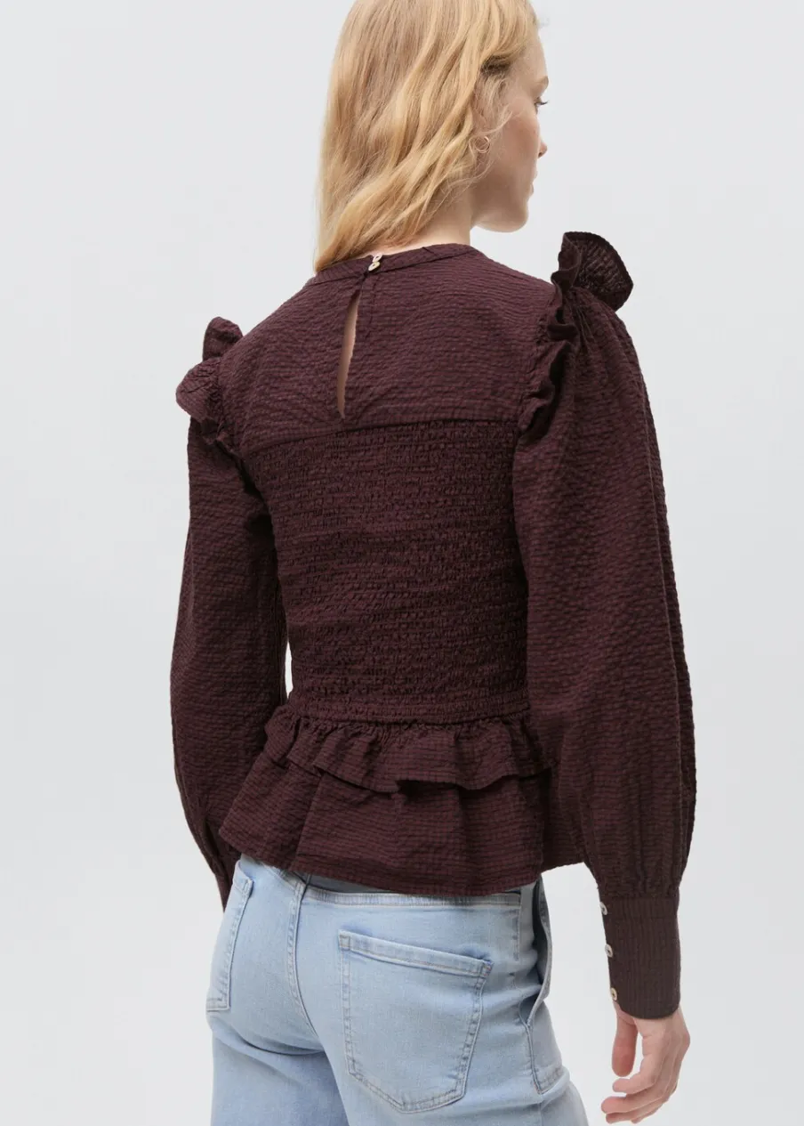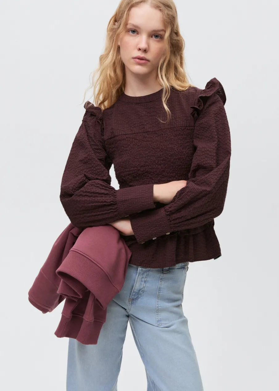 Bawełniana tkanina. Falbanki na ramionach. Falbanka u dołu. Zapinane mankiety. Zapięcie na pasek z guzikiem.