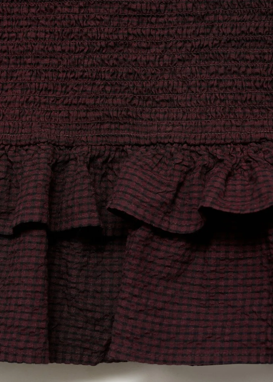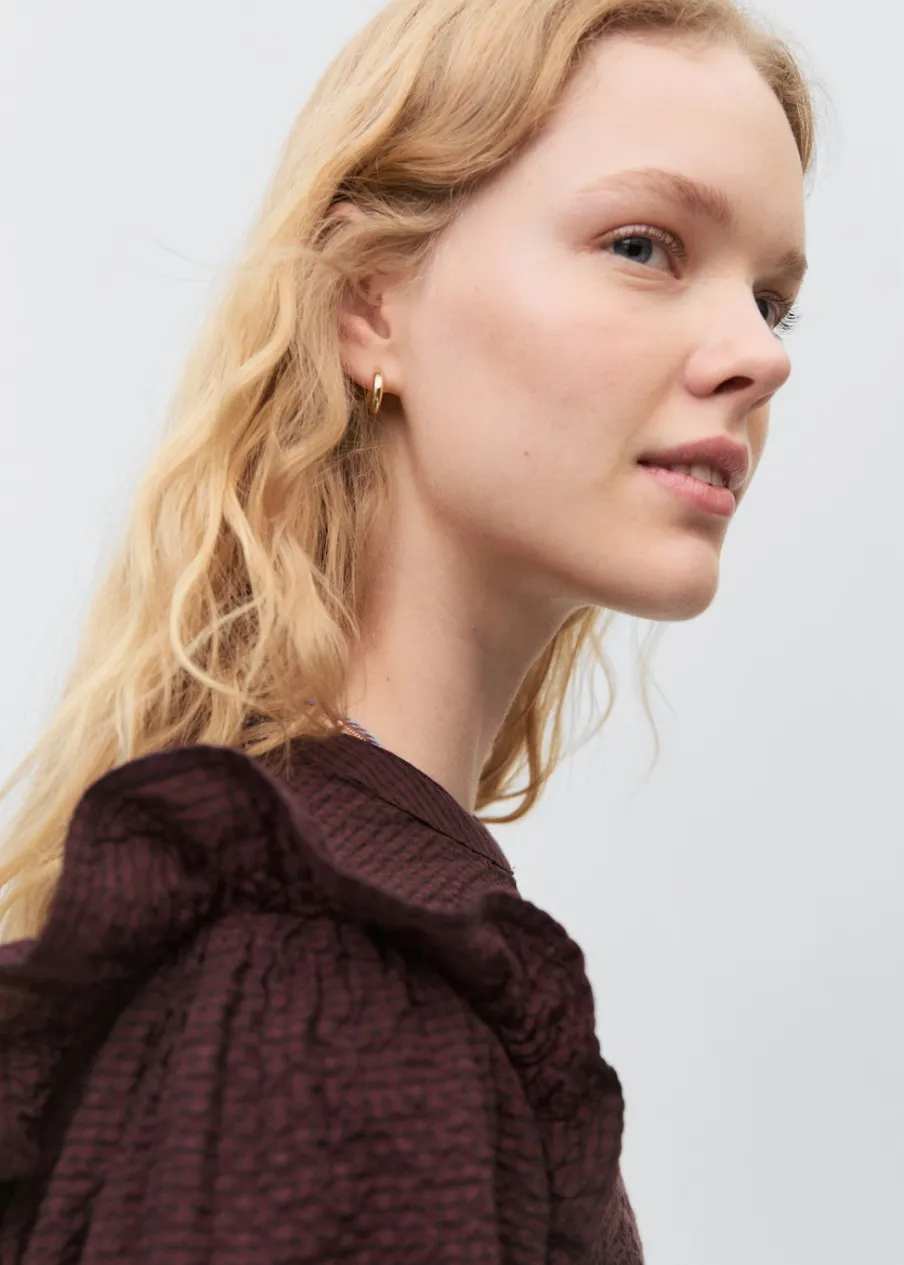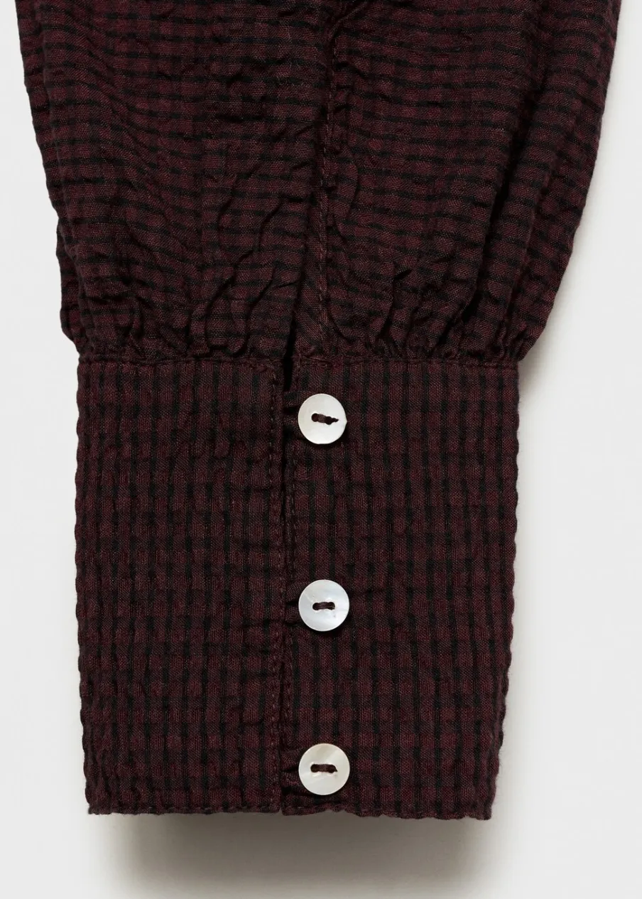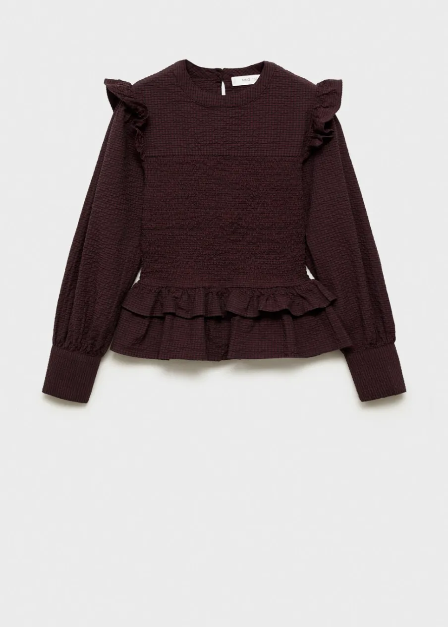 Bawełniana tkanina. Falbanki na ramionach. Falbanka u dołu. Zapinane mankiety. Zapięcie na pasek z guzikiem.