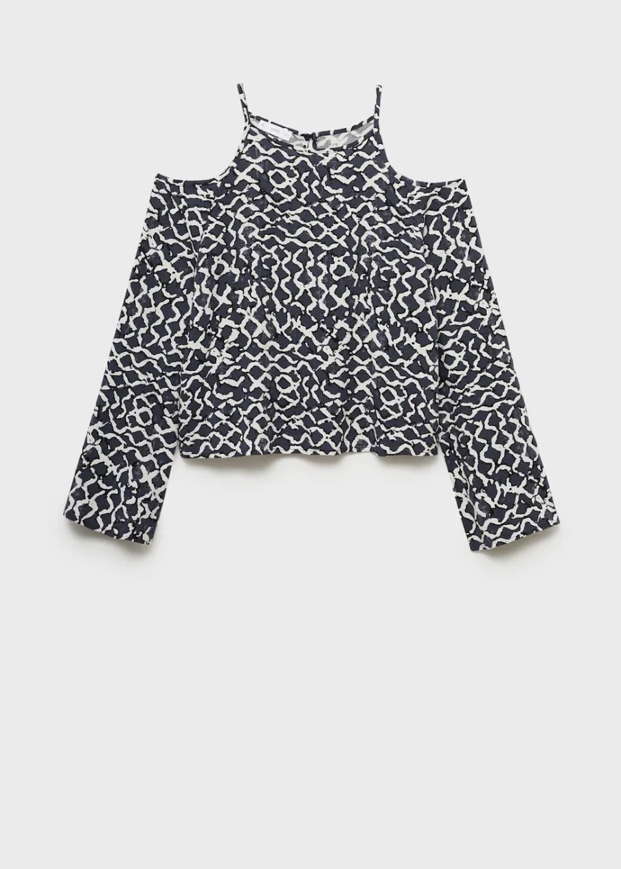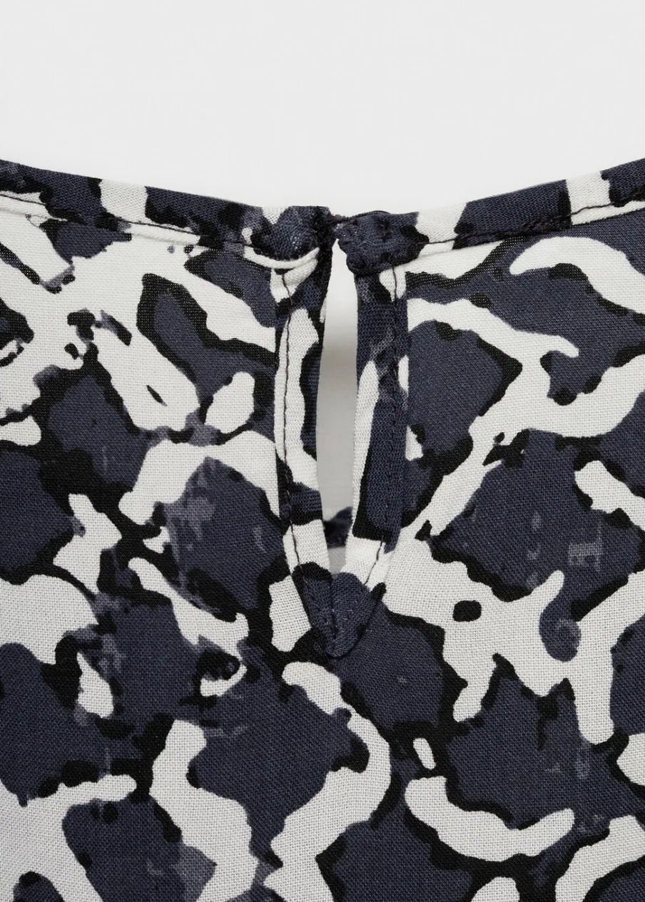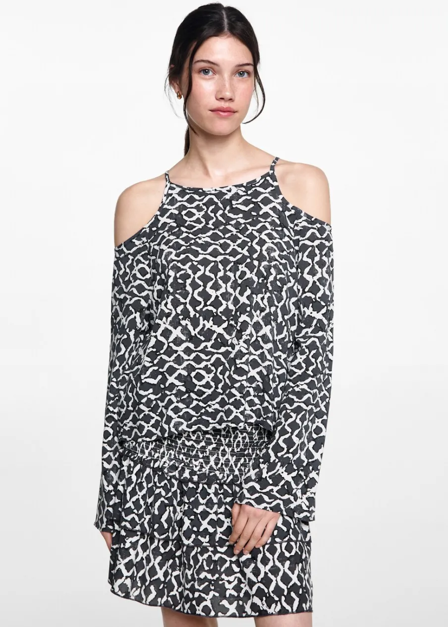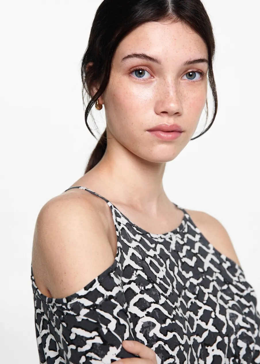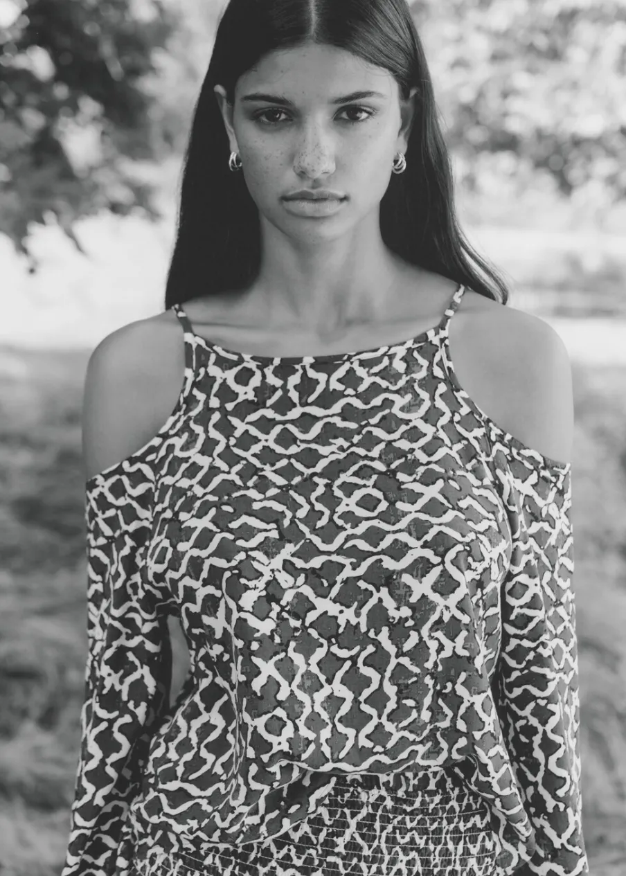 Model prosty. Rozcięcia na ramionach. Cienkie ramiączka. Długi rękaw. Okrągły dekolt. Zapięcie na guzik z tyłu. Dostępny zestaw total look. Modelka ma 172 cm wzrostu i nosi rozmiar M. Nadruk. Tkanina z wiskozy.