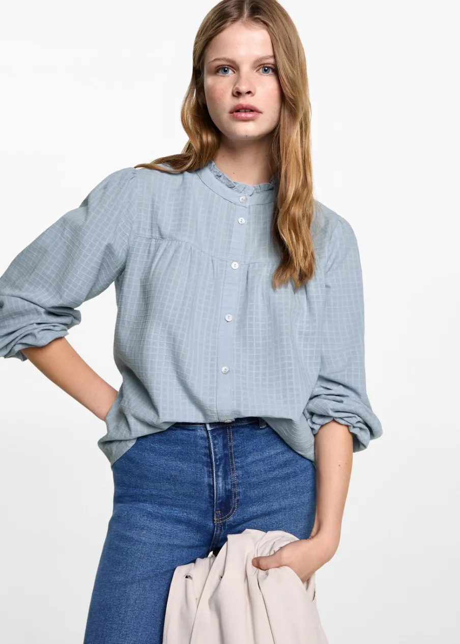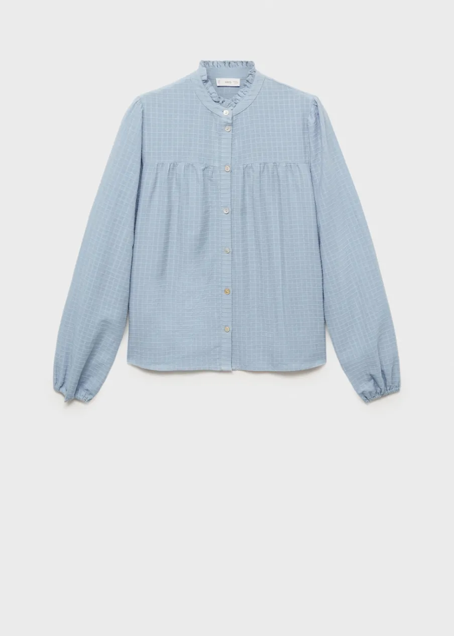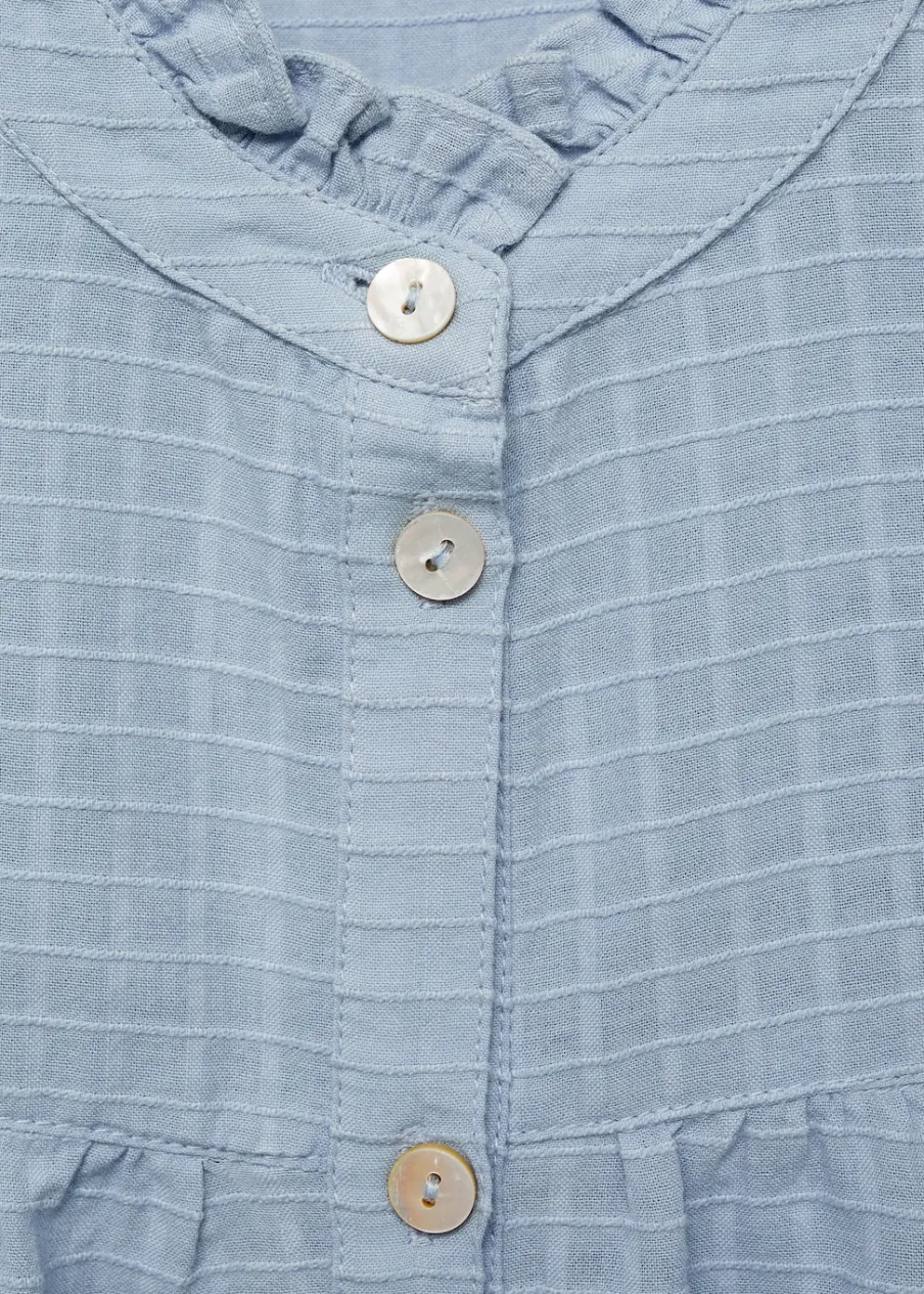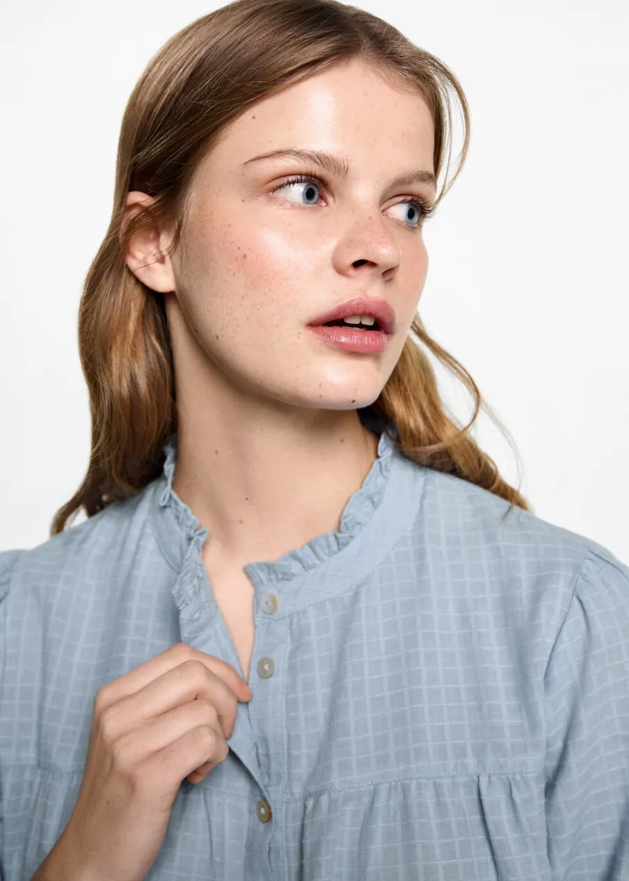 Tkanina z 100% bawełny. Tekstura w kratę. Okrągły dekolt. Ozdobne falbany. Długi bufiasty rękaw. Zapięcie z przodu na guziki.
