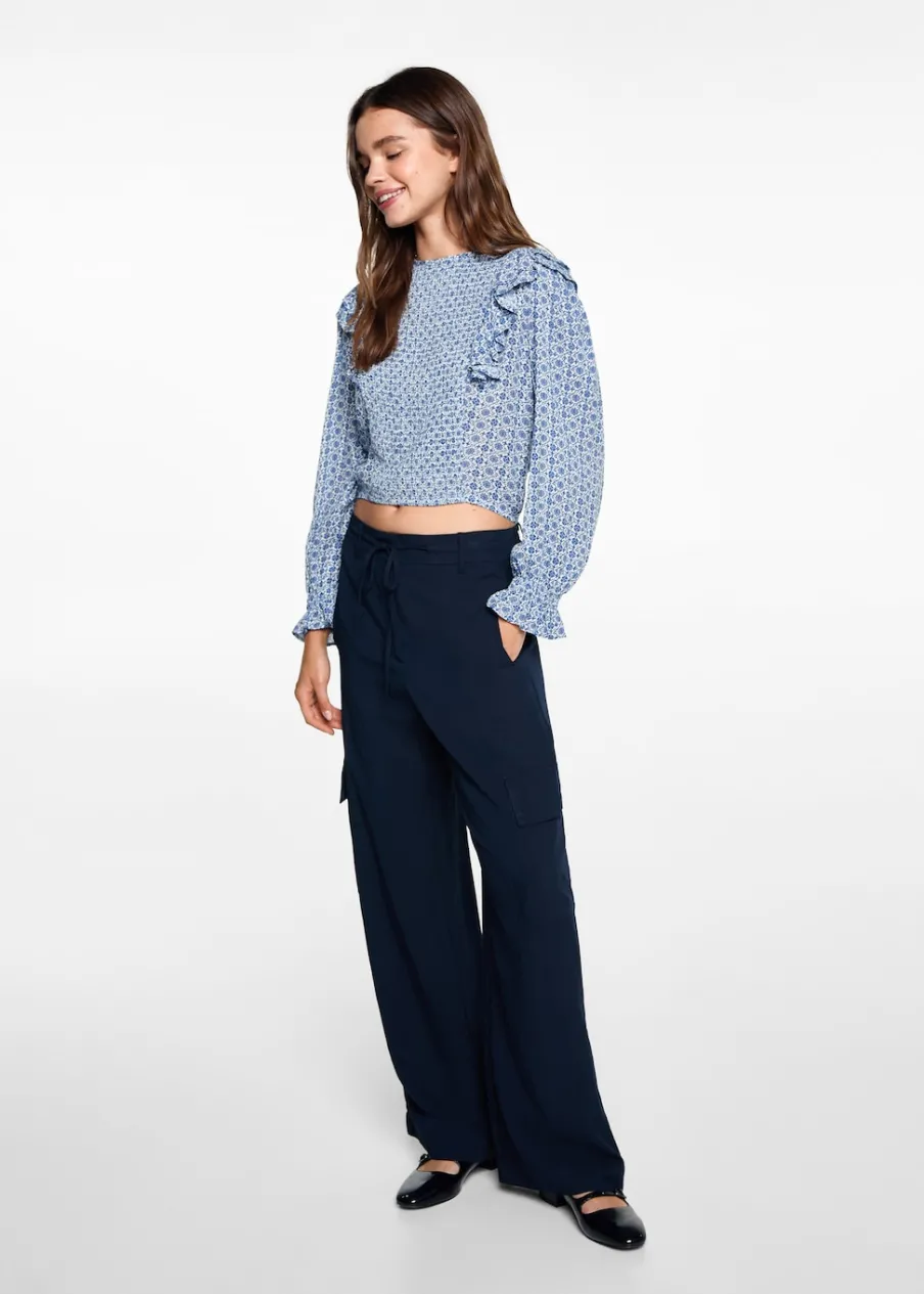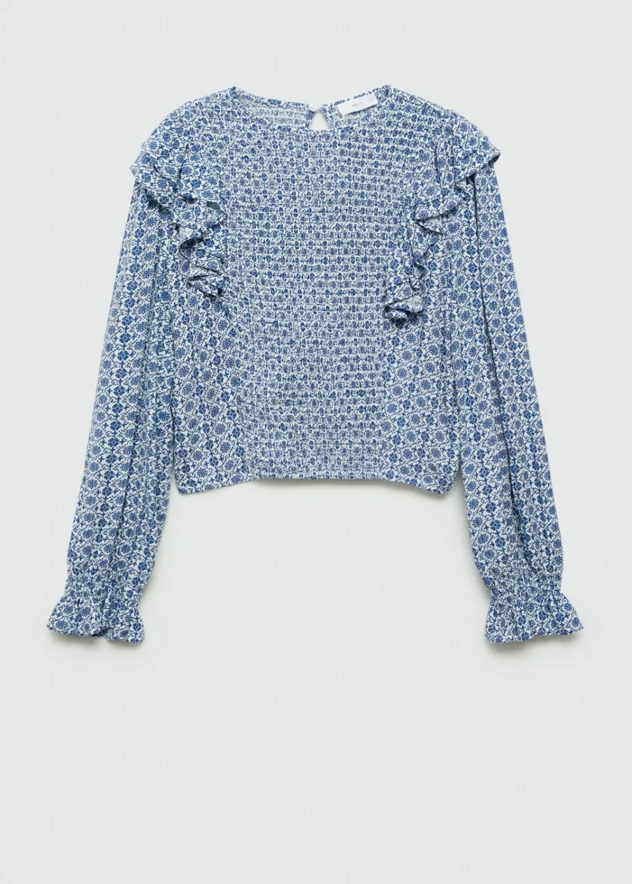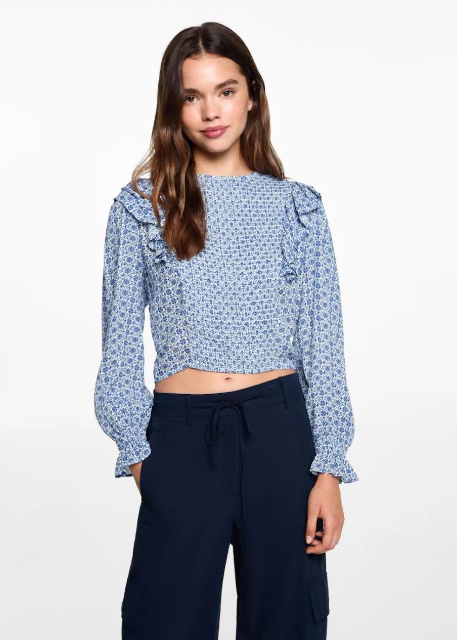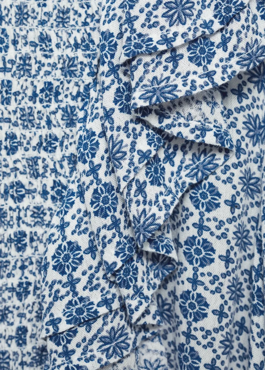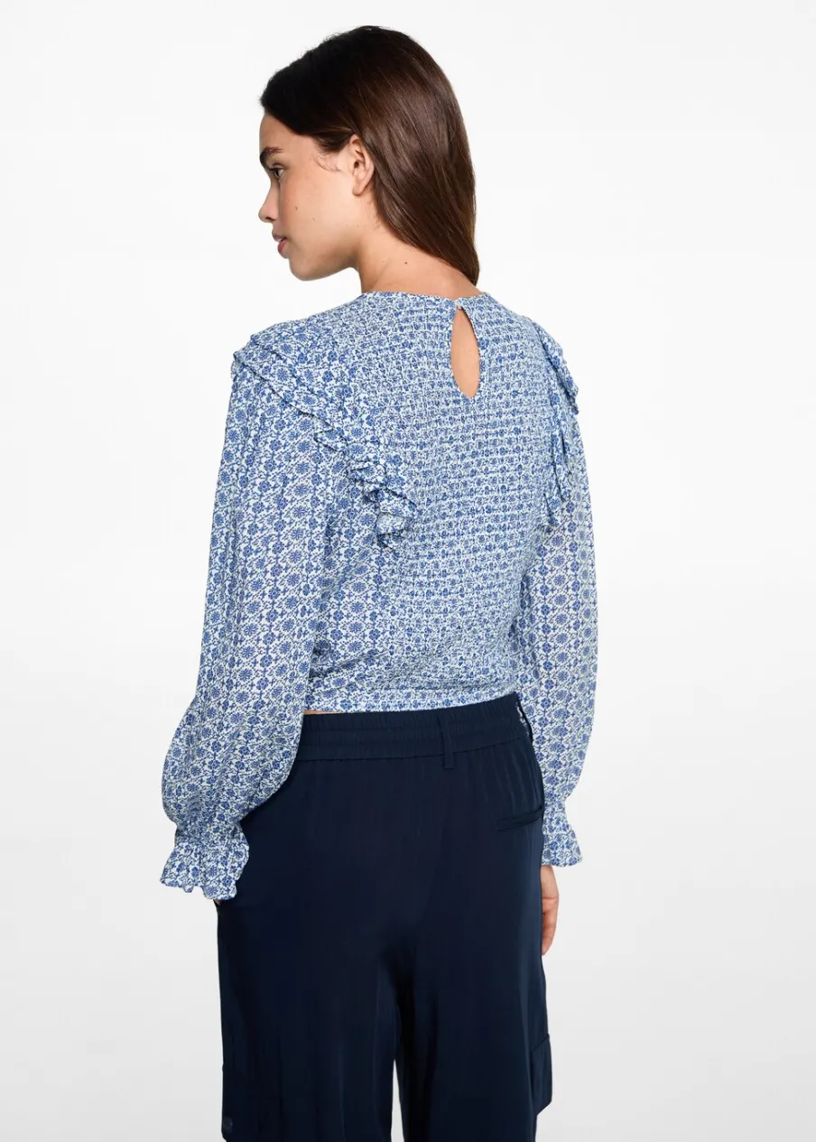 Model prosty. Kwiatowy wzór. Okrągły dekolt. Z falbanami. Marszczenie na rękawie. Zapięcie na guzik z tyłu. Nadruk. Tkanina z wiskozy.