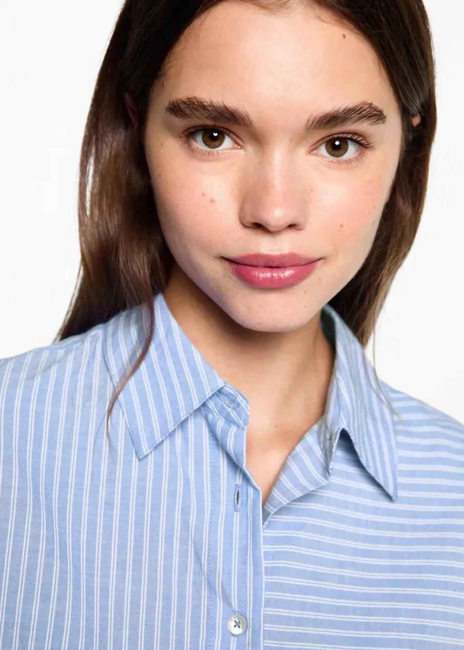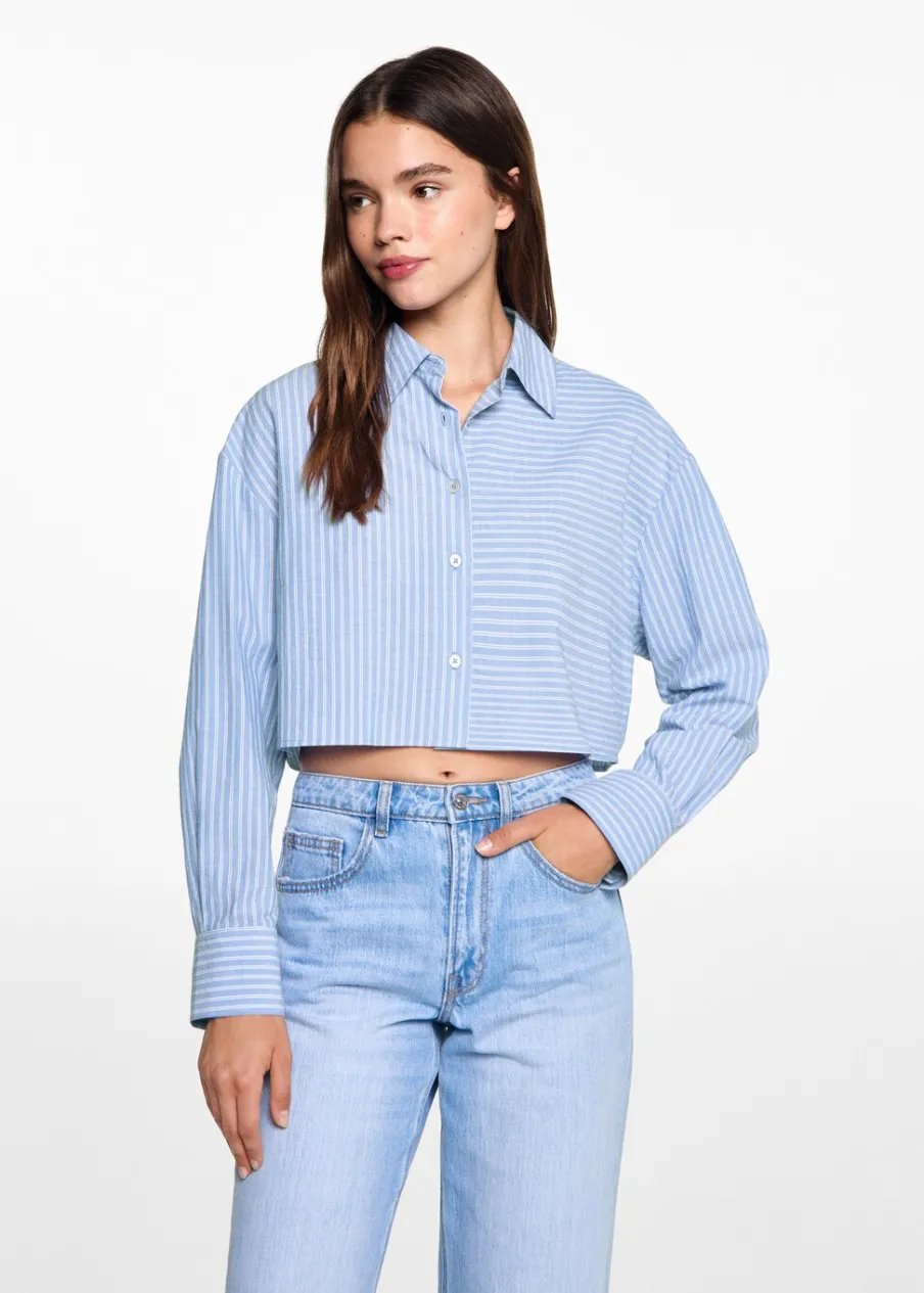 Bawełna 100%. Model prosty. Wzór w pasy. Koszulowy kołnierz. Deseń crop. Długi rękaw z guzikami na mankietach. Zapięcie na guziki. Modelka ma 172 cm wzrostu i nosi rozmiar M. Powrót do szkoły.