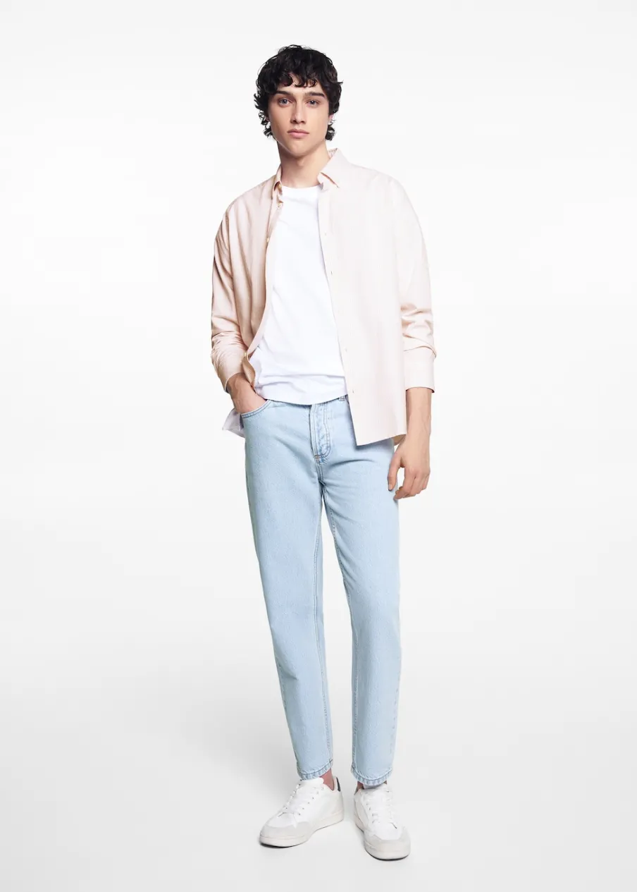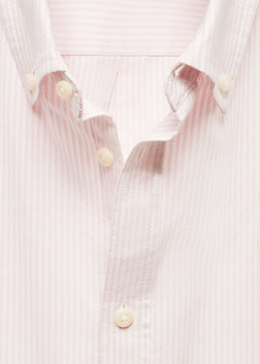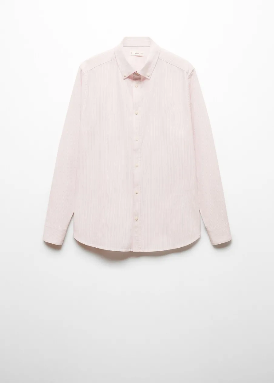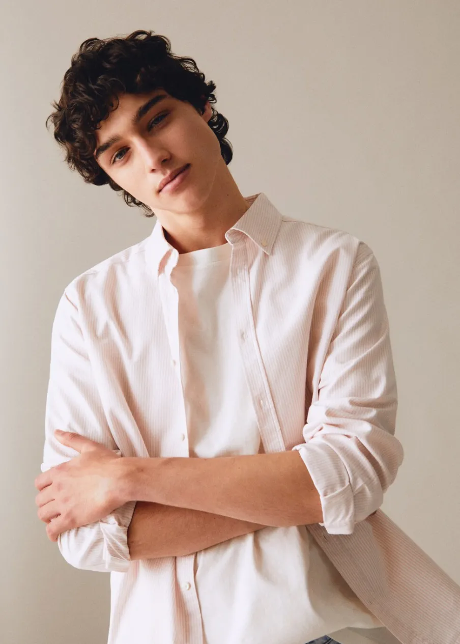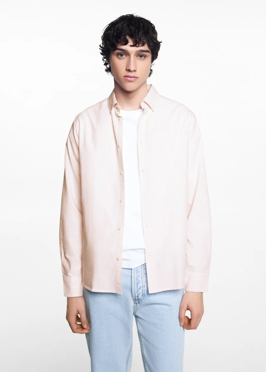 Unisex. Tkanina bawełniana. Krój regular. Długi rękaw. Zapinane mankiety. Zapięcie na guziki. Modelka nosi rozmiar M. Model nosi rozmiar L. Klasyczny kołnierzyk. Wzór w paski.