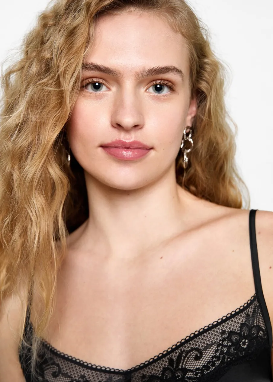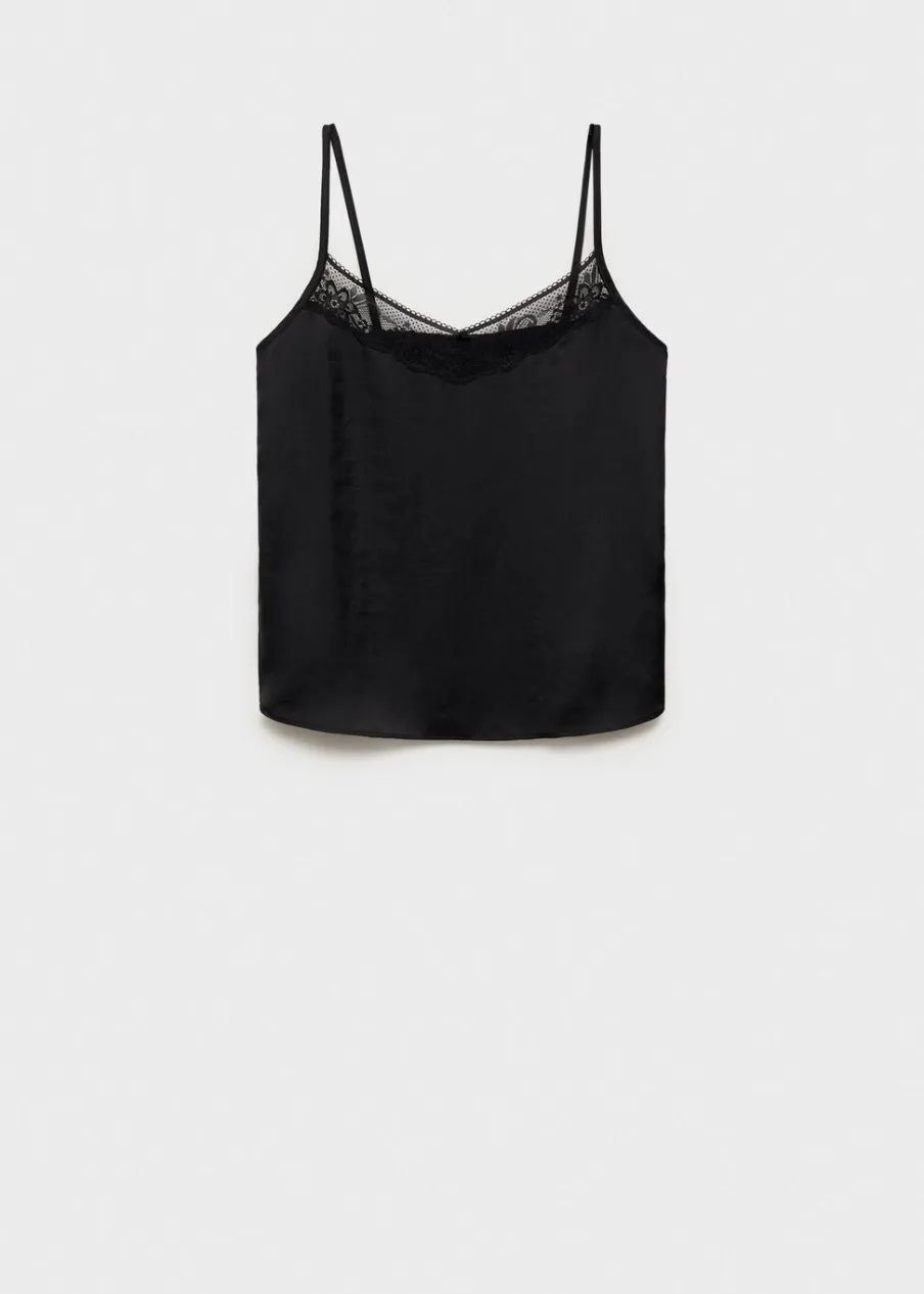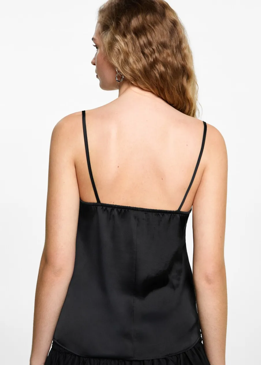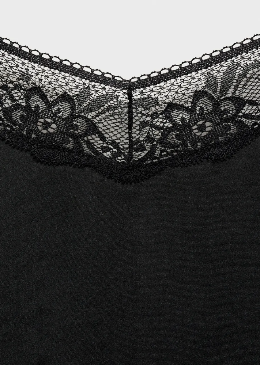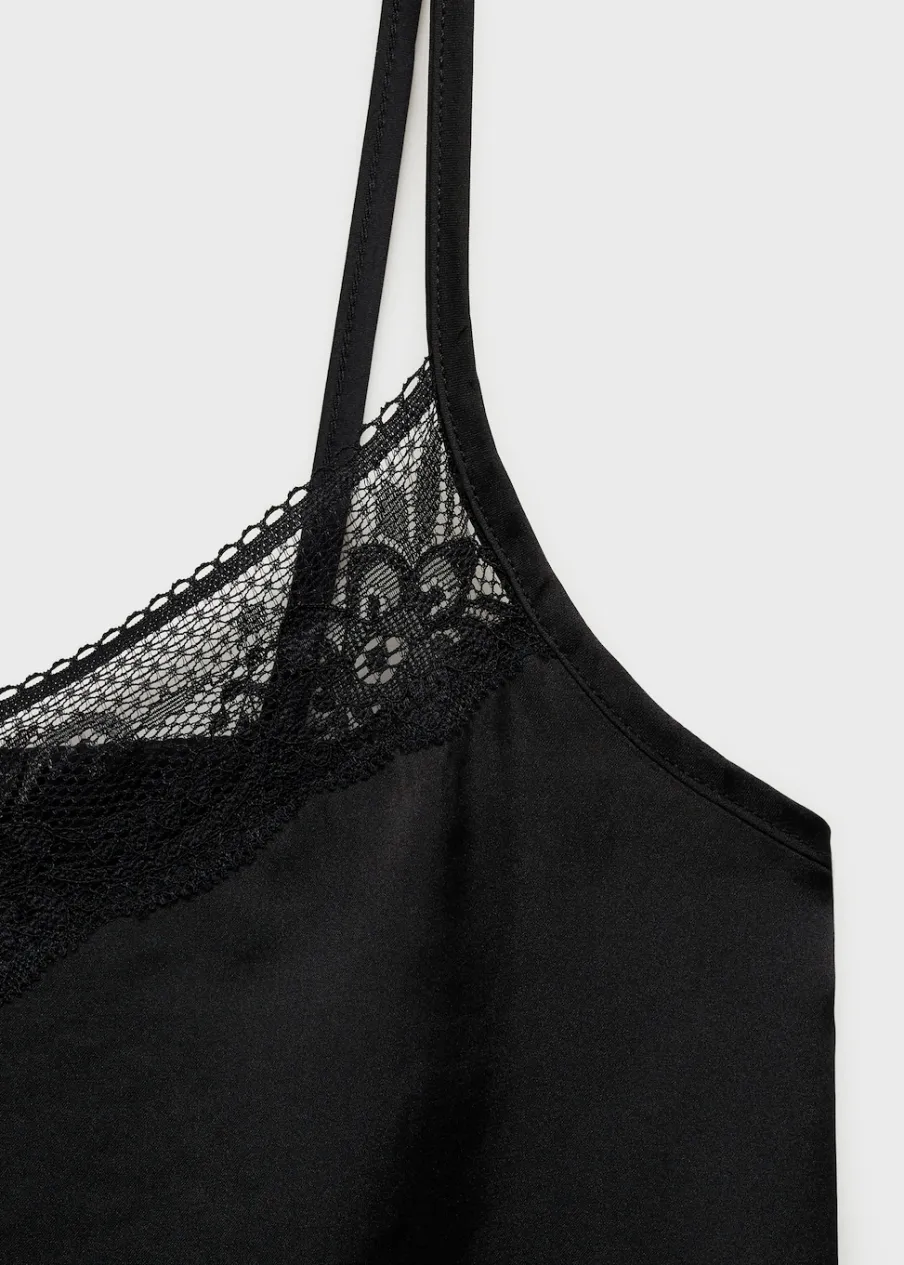 OpisLejąca tkanina. Dekolt V. Koronkowa aplikacja. Wąskie ramiączko. Marszczenie na dekolcie. Bez rękawów.